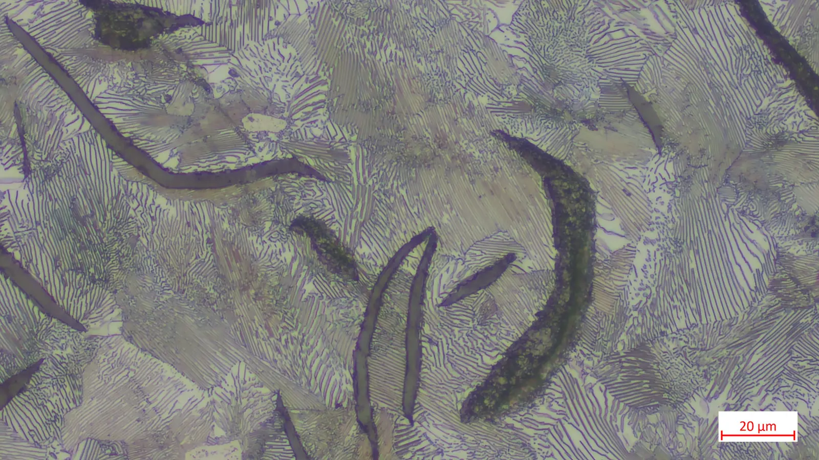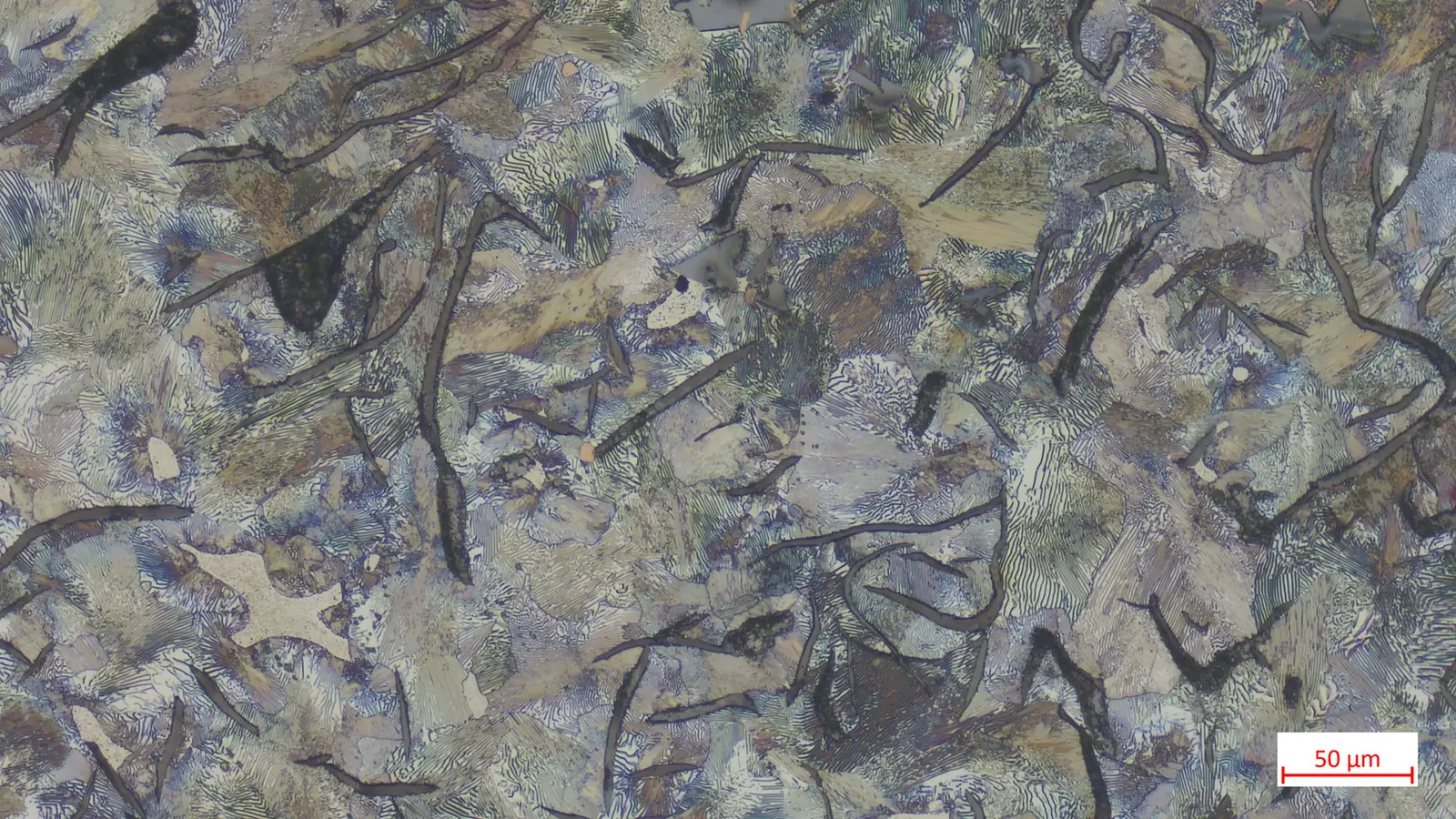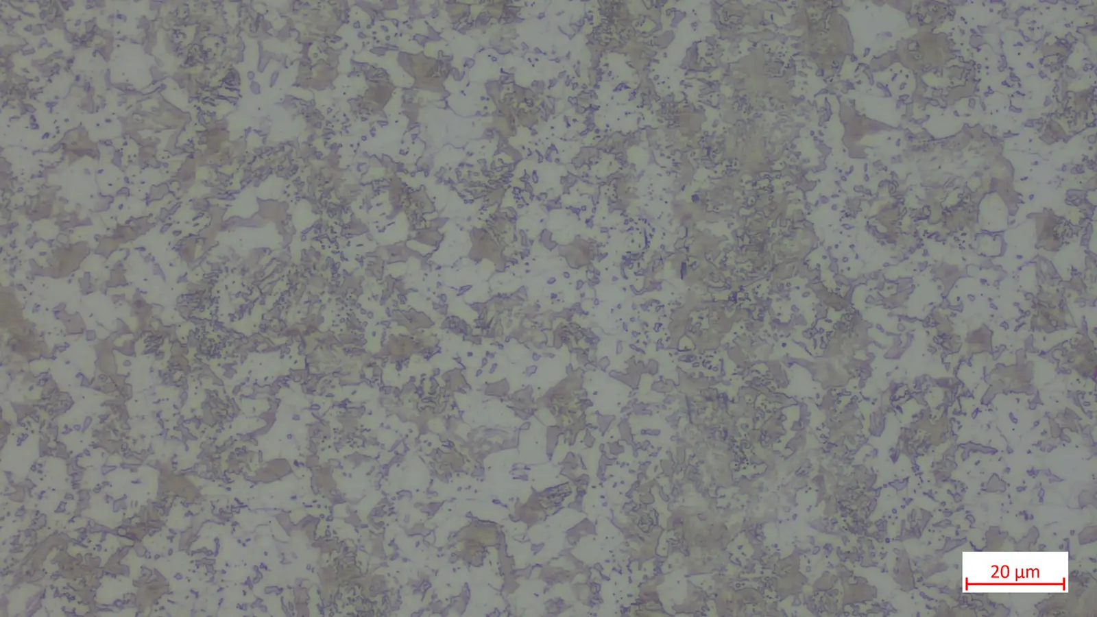 Das Gefüge besteht aus Ferrit, Perlit, Primär Karbiden und geringen teilen Martensit. Der Stahl wurde mit Salpetersäure(5%) geätzt.