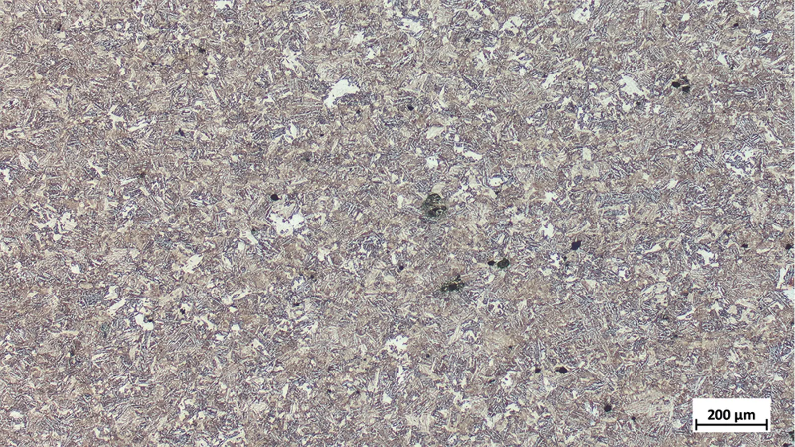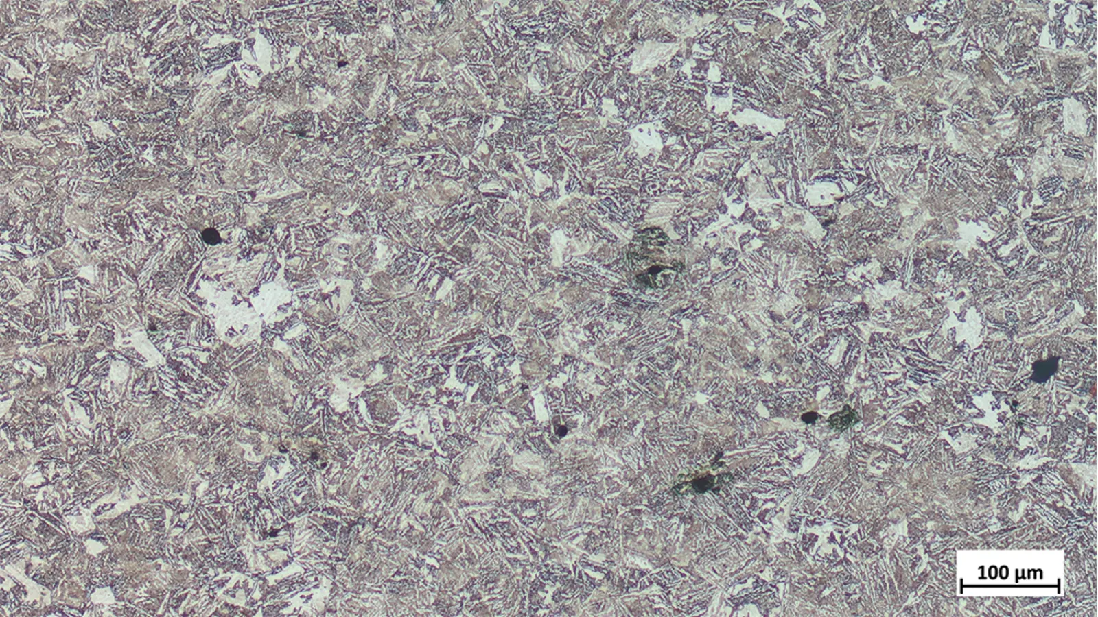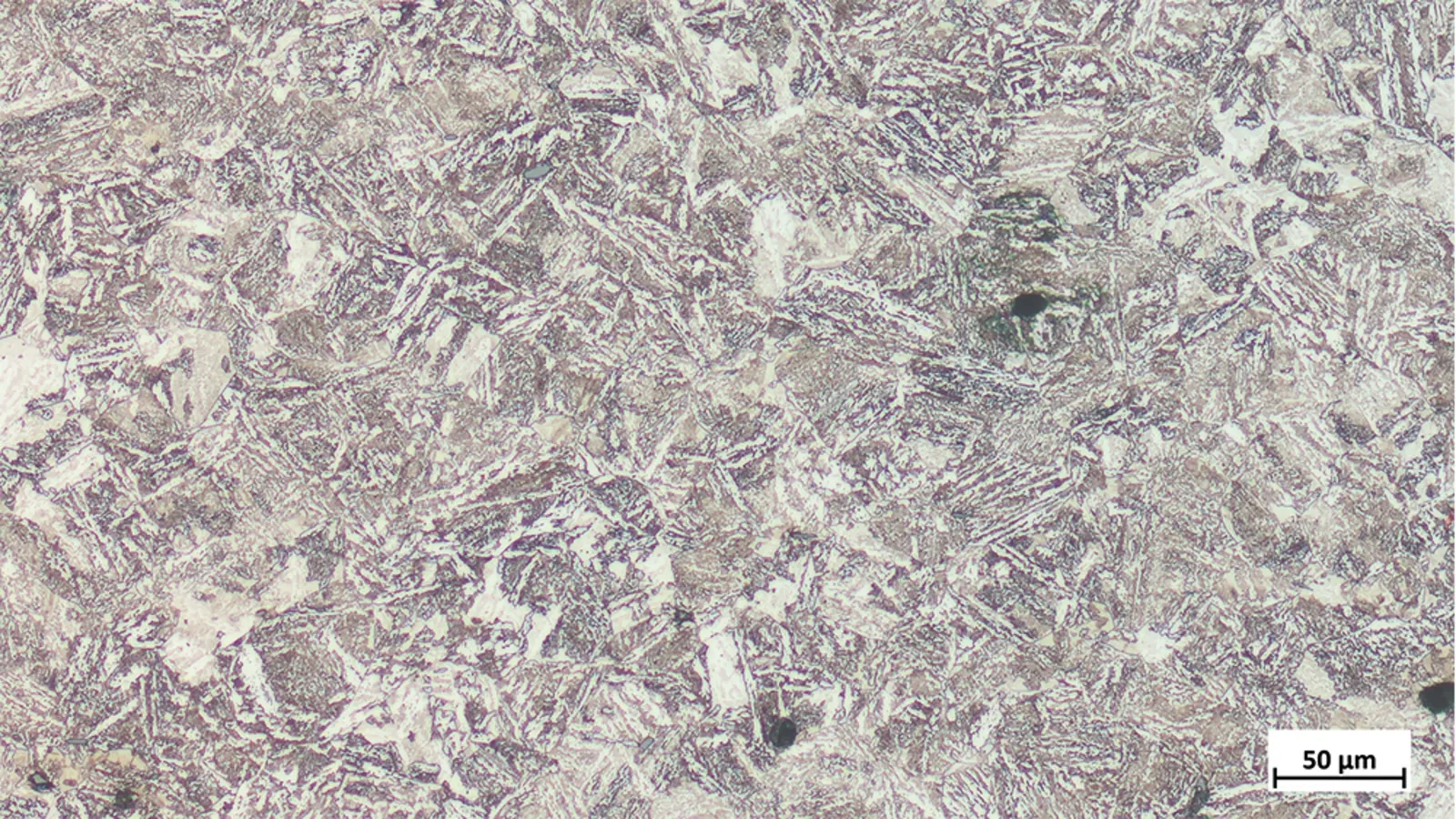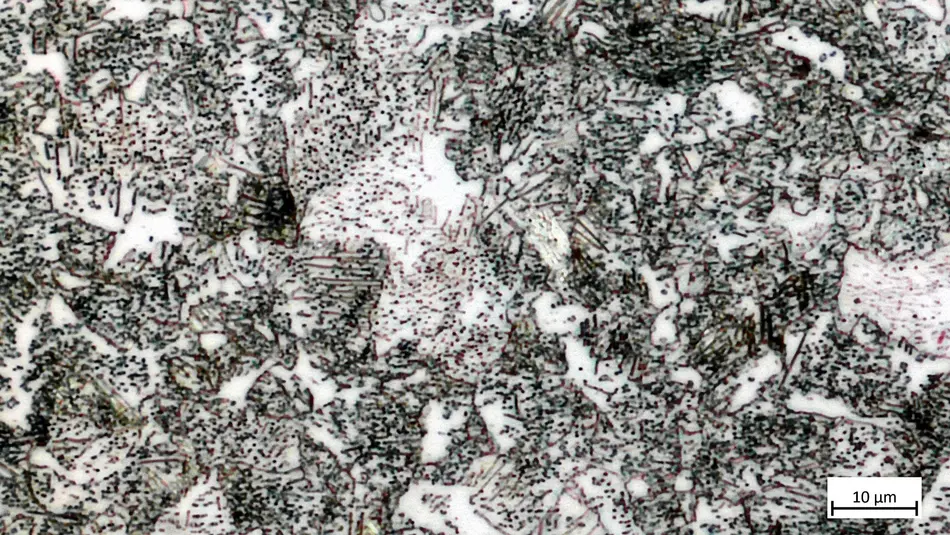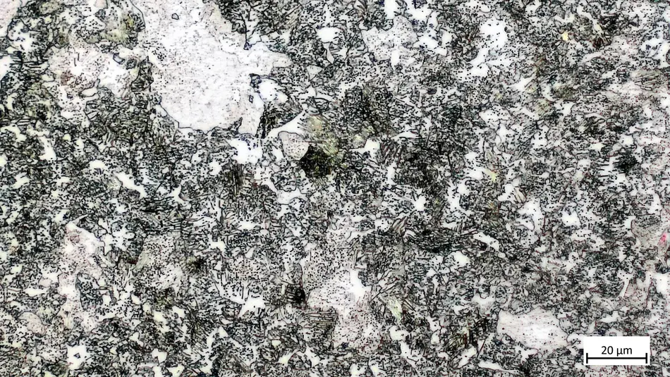 Das vorliegende Gefüge ist bainitisch mit Ferrit und feinem Perlit.
