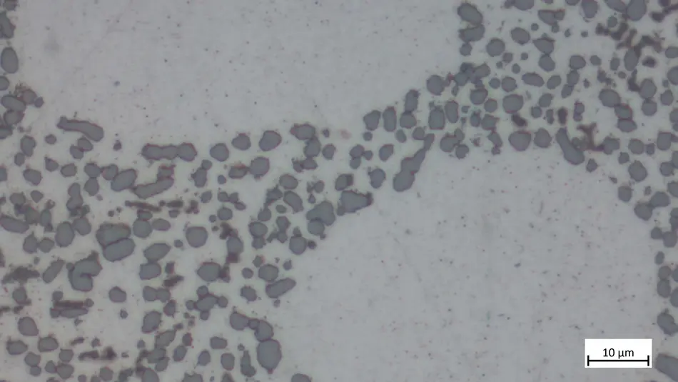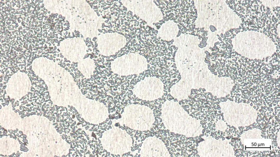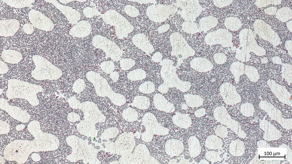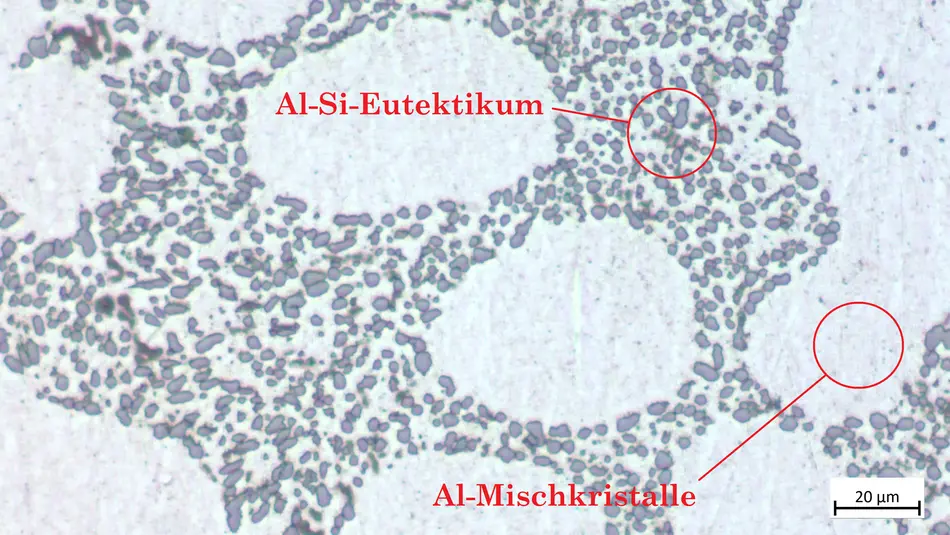Untereutektische primäre Al-Mischkristalle (hell) mit Al-Si-Eutektikum