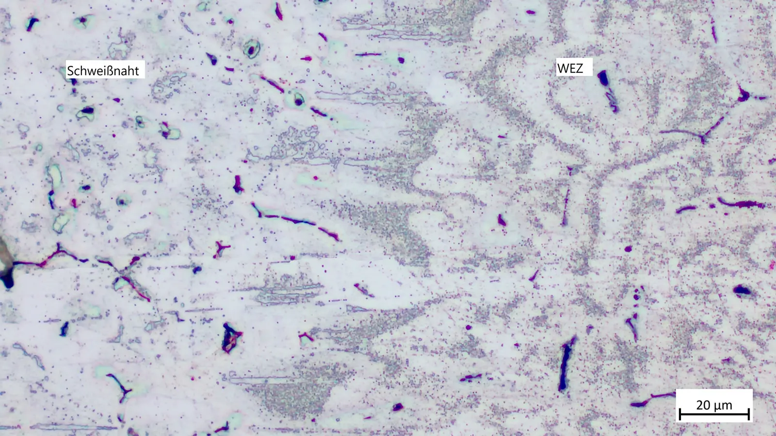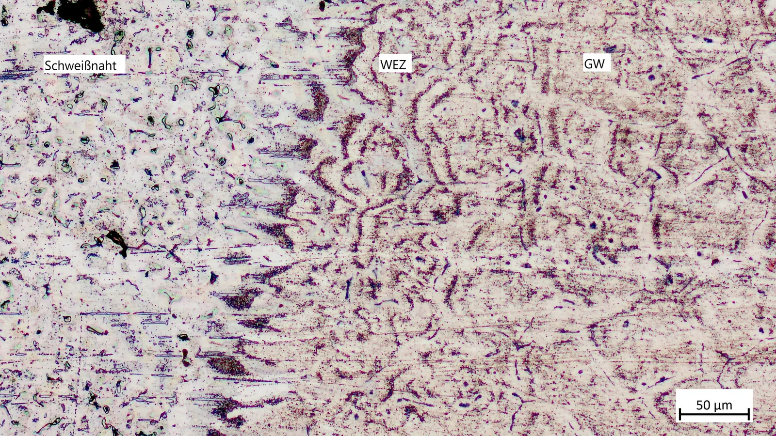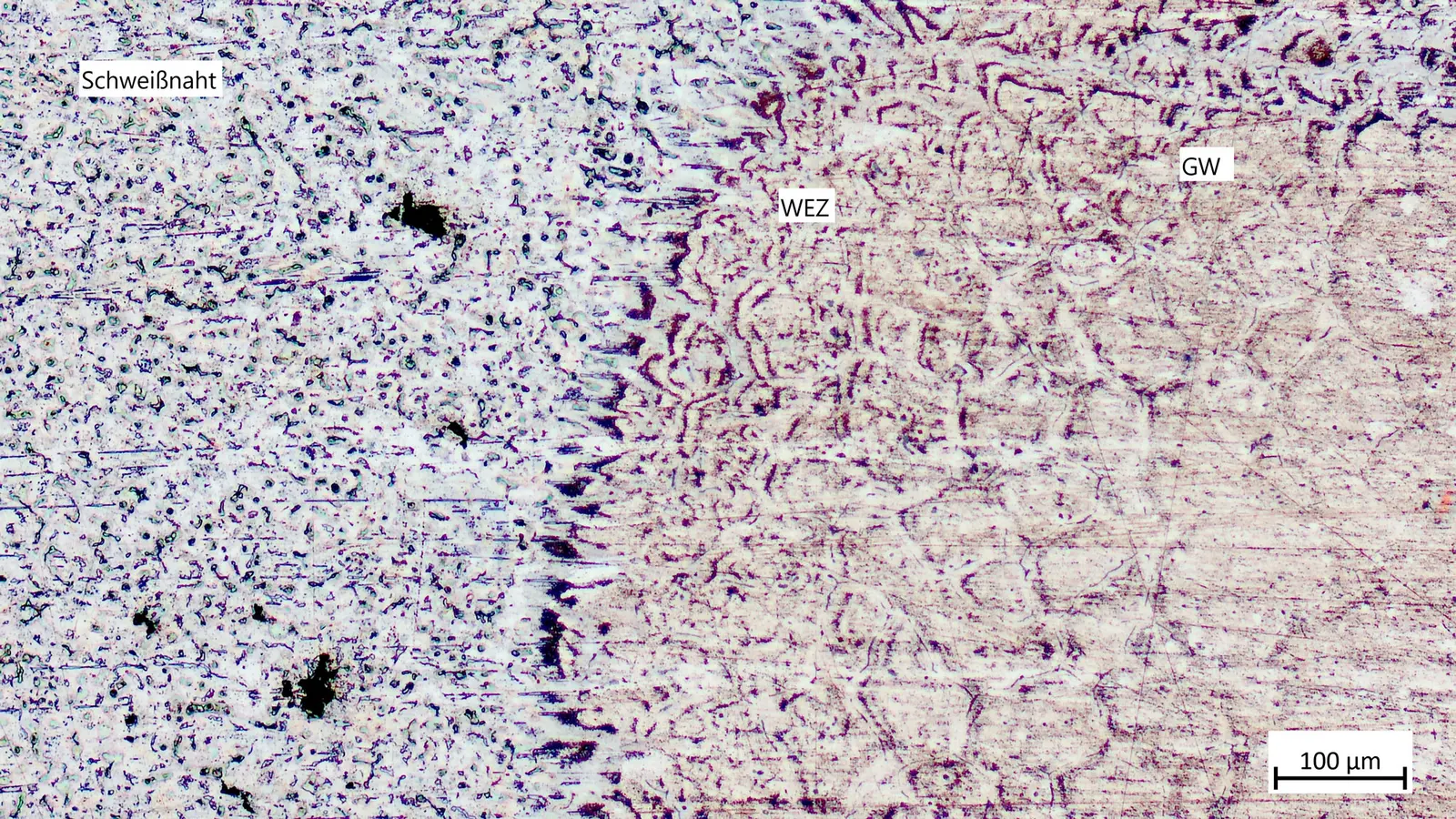 Die gut erkennbaren schwarzen Flecken sind Gasporen bzw. Lunker. Allgemein ist die Wärmeeinflusszone sehr schmal, da Aluminium sehr gute Wärmeleiteigenschaften besitzt.
