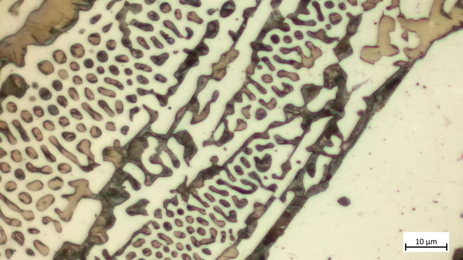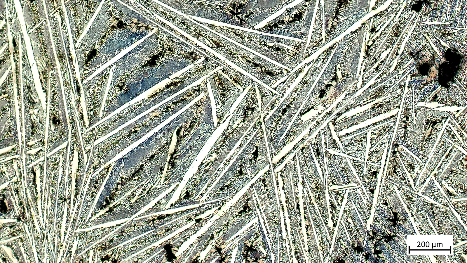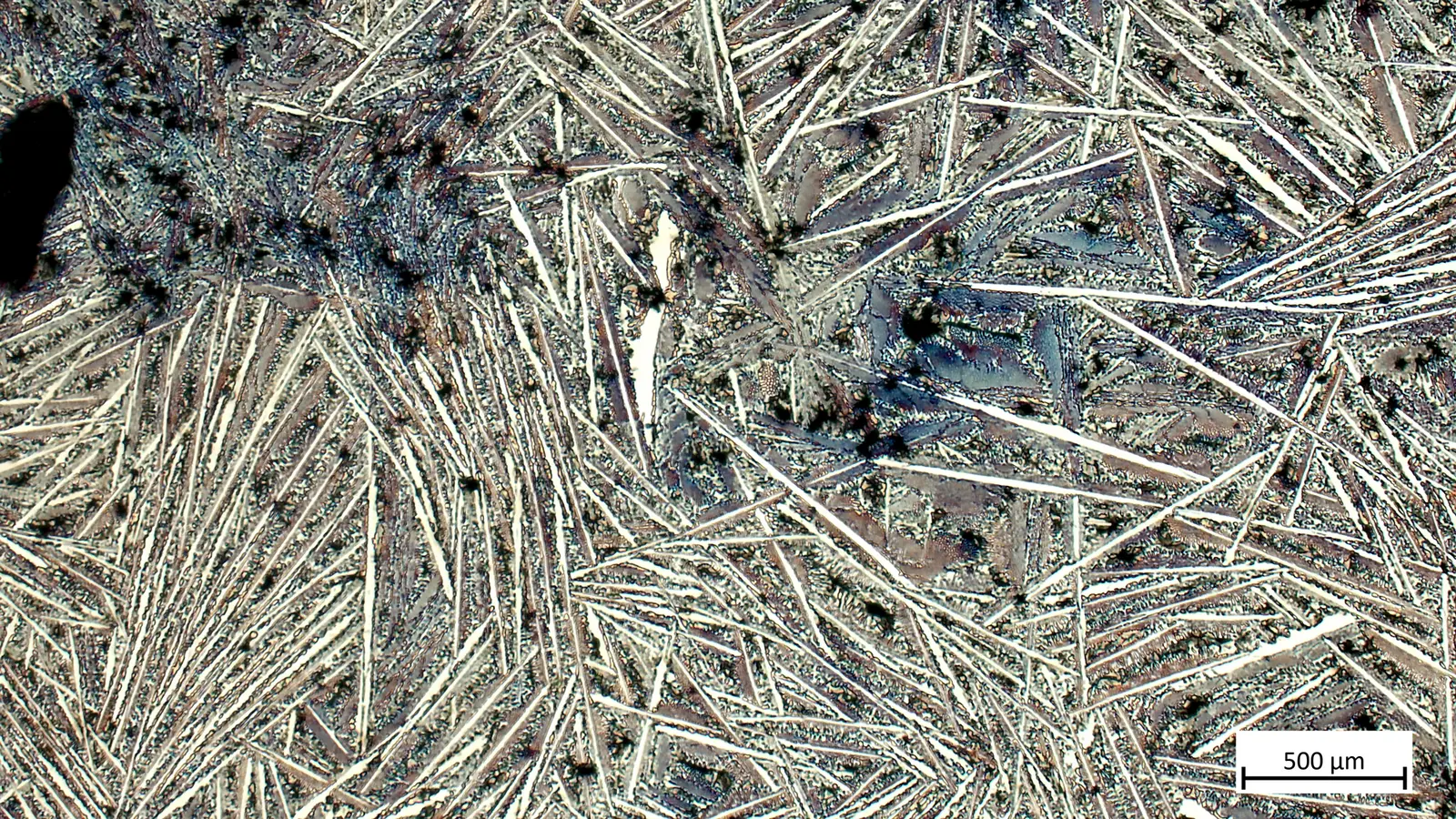 Das hier vorliegende Spiegeleisen weist eine Härte von 750 HV auf und wurde 15s mit Nital geätzt. Seine Hauptlegierungsbestandteile sind Kohlenstoff (3,86 – 5,00 %) und Mangan (4,92 – 12,15 %). Das Gefüge besteht aus einer Ledeburit-Matrix mit Primärzementit.
