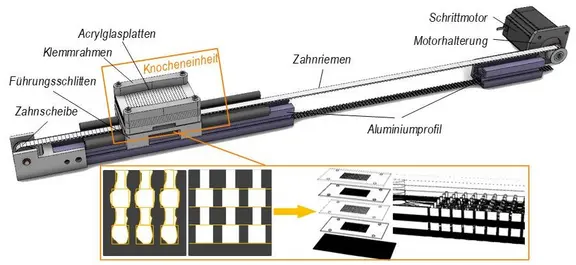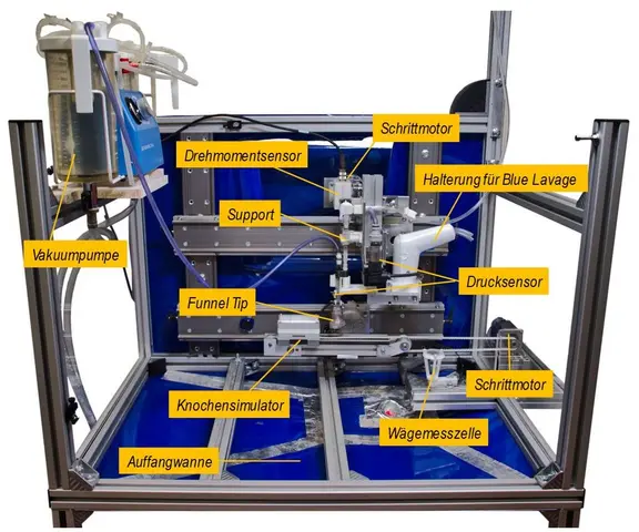 Der Knochensimulatortest dient zur Simulation des Lösens und Entfernens von Blut aus einer porösen Knochenstruktur, wie sie in der Tragzone der Röhrenknochen vorkommt. Die Knochensimulatorverfahreinheit besteht aus einem Schlitten, der mit einem Schrittmotor angetrieben wird. Die Softwareansteuerung des Motors ermöglicht ein gleichmäßiges, geradliniges und wiederholgenaues Pendeln unterhalb der Düse sowie das Abfahren unterschiedlicher Bewegungsprofile. Der Knochensimulator selbst ist aus gestapelten Kunststoffplatten aufgebaut, die zentriert übereinander zusammengesetzt werden. Die einzelnen Simulatorplatten weisen Bohrungen unterschiedlichen Durchmessers auf, wobei die Bohrungsmitten aller Platten exakt übereinander liegen. Durch das Übereinanderstapeln der Platten unterschiedlichen Bohrungsdurchmessers können so Kavitäten ähnlich derer im menschlichen Knochen nachgebildet werden.