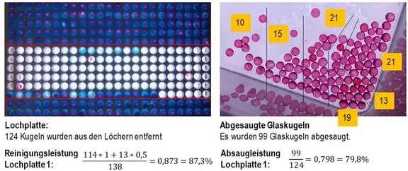 Zur Ermittlung der Reinigungsleistung werden die Löcher der einzelnen Platten des Knochensimulators mit einem Blutersatzstoff befüllt und unter einheitlichen Versuchsbedingungen per Servopumpe und mit der zu testenden Düse mit Kochsalzlösung bestrahlt, wobei die Knochensimulatoreinheit unterhalb der reinigenden Düse verfährt. Nach der Reinigung erfolgt eine optische Auswertung, und es werden die Messgrößen "Tiefenreinigung", "Oberflächenreingung und Partikelaustrag" sowie die "Effektivität der Absaugung" ausgewertet.