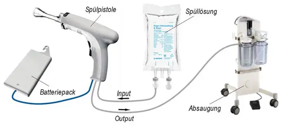 Zur Spülreinigung werden aktuell pistolenartige und batteriebetriebene Jet-Lavage-Systeme eingesetzt, die eine Kochsalzlösung über einen pulsierenden Wasserstrahl in das Operationsgebiet spritzen. Die kinetische Energie des Wasserstrahls löst die Verunreinigungen und Knochensplitter ab, sodass diese mittels Vakuums wieder aus dem Situs abgesaugt werden können. Für eine effektive Aufnahme der Partikel wird die Absaugung innerhalb der Spüllanze geführt, sodass verschmutzte Partikel direkt neben der Düse aufgesaugt werden können. Eine gute Reinigung ist dann gewährleistet, wenn die Absaugung die Spülflüssigkeit nach ihrem Auftreffen auf die Oberfläche und mit den losgelösten Partikeln wieder aufnimmt.