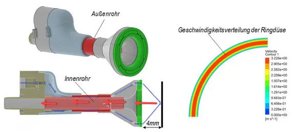 Ziel des Forschungsprojektes ist die Entwicklung neuartiger Düsenkonzepte mit einer schonenderen Reinigung und einer besseren Reinigungseffizienz. Mittels numerischer Strömungssimulation (Computational Fluid Dynamics, CFD) werden die entwickelten Düsen stömungstechnisch analysiert. Aus diesen Erkenntnissen werden die neuen Düsen-Prototypen weiterentwickelt, als Prototypen hergestellt und der Reinigungserfolg in einem für das Projekt entwickelten Prüfstand getestet. In einem rekursiven Vorgehen werden diese Düsenprototypen ständig weiter verbessert, sodass schließlich eine neue optimierte Düsengeometrie entsteht, die im „Originären Fluiddynamischen Umweltschonenden Spül-Saugsystem“ (OFUS) der Firma UTK-Solution GmbH zur Anwendung kommen wird.