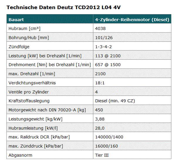 Bei dem Deutz TCD 2012 L04 4V handelt es sich um einen modernen Nutzfahrzeug-dieselmotor mit 4 Zylindern, welcher seine Anwendung u.a. in Schleppern sowie Baumaschinen findet. Er stellt einen der ersten Deutz-Motoren mit Common-Rail Einspritzung dar und erreicht ohne jegliche Abgasnachbehandlungssysteme die US Tier III.