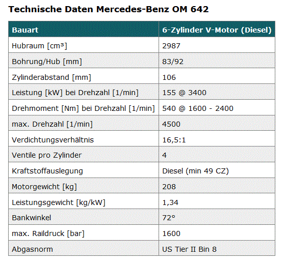 Der Mercedes-Benz OM642 wird seit 2006 in den USA im E-Segment als E 320 CDI Bluetec vertrieben, und erfüllt mit seinem aufwendig gestaltetem Abgasnachbehandlungssystem die strenge Abgasnorm US Tier II Bin 8.