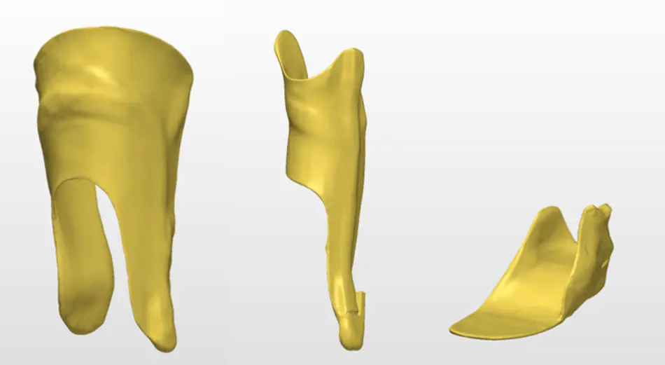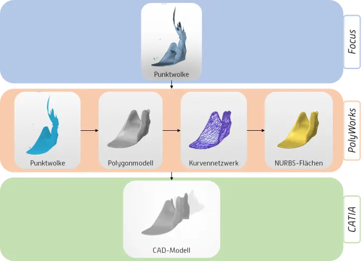 Die bei der Messung entstandenen Punktwolken des Fußhebers, der Unterschenkel- und der Oberschenkelschiene wurden anschließend in die Software PolyWorks importiert, in welcher die drei Bestandteile der Ganzbeinorthese ohne Probleme modelliert werden konnten. Die drei Elemente der Orthese wurden dabei einzeln modelliert, da sie durch zwei im Modell unerwünschte Gelenke miteinander verbunden sind und man diese somit aus dem Modell entfernen kann. Dieser komplette Modellierungsvorgang wurde in einer Anleitung anhand des Fußhebers der Orthese beschrieben. Die Schritte beinhalten dabei den Export der Punktwolke von Focus nach PolyWorks, die Vernetzung der Punkte zu einem Polygonmodell, das anschließende Glätten des Polygonmodells, das Löschen von Elementen, das Schließen von Löchern, die Rekonstruktion des Netzes, die Analyse des Polygonmodells, die Erstellung von NURBS-Flächen sowie schließlich der Export nach CATIA. Zudem werden die Ergebnisse des Modellierungsprozesses übersichtlich zusammengefasst.