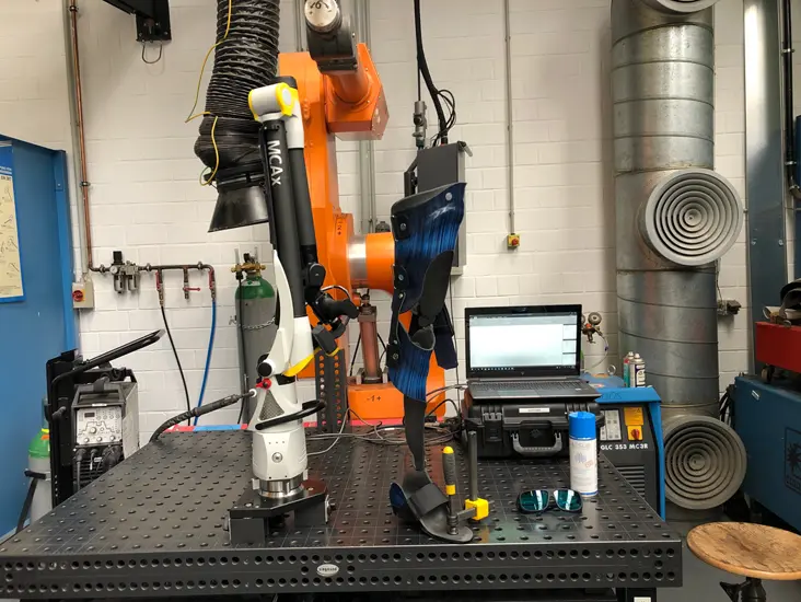 Die auf die Messparameterkonfiguration des Praxisprojektes aufbauende Vermessung der Ganzbeinorthese verlief problemlos. Die Messung wurde auf einem Schweißtisch in der Maschinenhalle der Hochschule Trier durchgeführt, welcher eine sichere Basis für die mittels spezieller Schraubzwingen an den Tisch befestigten Ganzbeinorthese sowie dem Messgerät bieten konnte. Die an der Orthese befestigten Klettverschlüsse, Riemen und Schnallen wurden entsprechend der Geometrie der Orthese abgeklebt und stellten somit keine störenden Faktoren während der Messung dar. Diese wurde schlussendlich mit einer Laserleistung von 75% und einer Laserbelichtung von 20% durchgeführt. Außerdem wurde die Ganzbeinorthese für die Messung mit dem binnen vier Stunden sublimierenden Scanningspray AESUB blue eingesprüht, damit ihre reflektierenden Stellen kein Hindernis darstellen können.