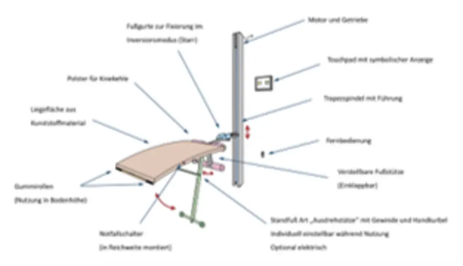 Der Zusatz der Inversionsbank wurde in diesem Projekt vom Ursprungsprojekt übernommen. Dafür spricht die einzigartige Kombination zwischen beiden Fitnessgeräten, welche einen großen Kundenkreis anspricht. Das grundlegende Prinzip blieb ebenfalls unverändert, die Umsetzung hingegen ist nicht mehr wiederzuerkennen. Die Liegefläche wird auch hier per Knopfdruck, entweder über die Fernsteuerung oder das Touchpad, verfahren. Die Hängeschuhe, die die Inversionsfunktion erst möglich machen, sind fest mit der Konstruktion verbunden, lassen sich aber dennoch sehr leicht anziehen. Durch die individuelle Einstellung der Liegefläche, hinsichtlich der Neigung und der Höhe, ist die Benutzung für jede Altersklasse möglich.