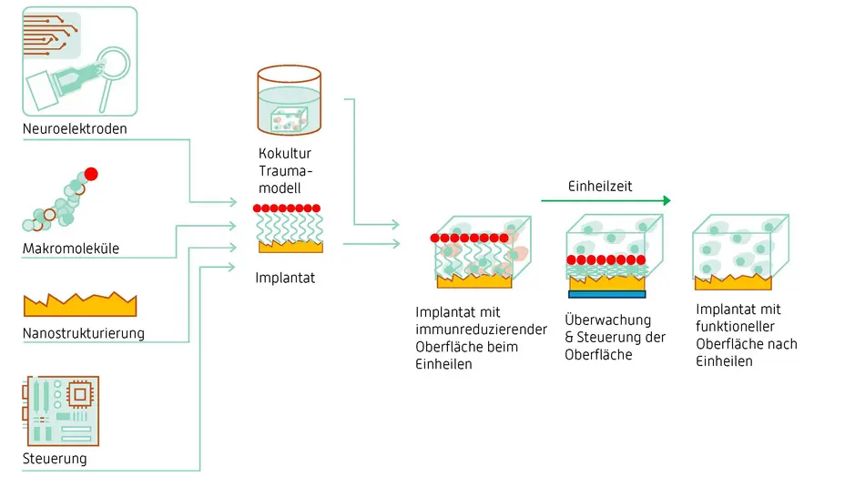 Implantate als Schnittstelle zum Nervensystem werden zunehmend in verschiedenen Anwendungen eingesetzt. Diese werden immer kleiner und erreichen eine bessere Auflösung. Die Wechselwirkung zwischen Zellen und technischen Oberflächen der Implantate wird durch Parameter wie Oberflächenstruktur, mechanische Eigenschaften, Oberflächenladung und chemische Eigenschaften der Oberfläche beeinflusst. Um eine bessere Wundheilung zu erreichen, wird im Projekt eine Anpassung der Oberflächeneigenschaften von Implantaten an die verschiedenen Phasen der Wundheilung erforscht. Dazu werden die Oberflächen eines Implantates mit elektrisch steuerbaren Makromolekülen beschichtet und diese elektrischen Feldern ausgesetzt. Abschließend wird untersucht, wie die Zellen durch diese Oberflächenveränderungen beeinflusst werden.