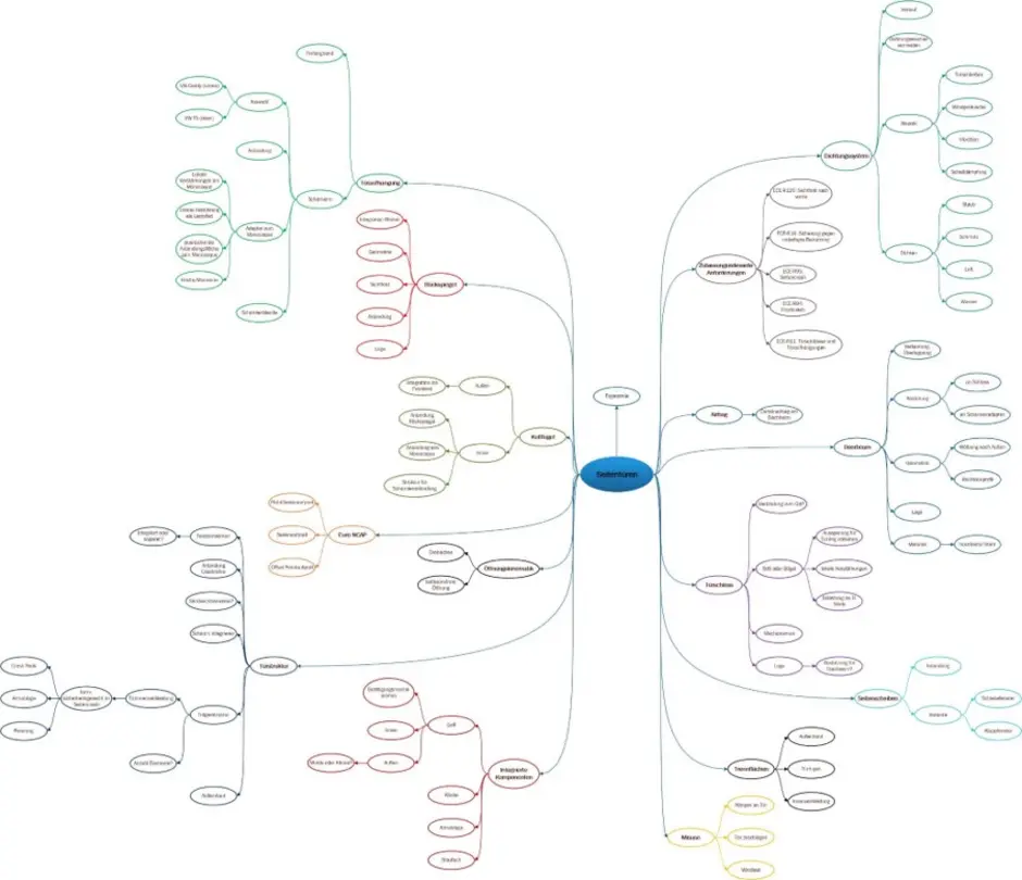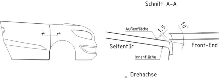 Zu Beginn des Projektes wurde eine Mind-Map erstellt, wobei alle relevanten Aspekte der Seitentüren dargestellt wurden. Es wurde eine Kinematikuntersuchung durchgeführt, um eine Scharnierdrehachse zu bestimmen, bei der eine kollisionsfreie Öffnung der Tür gewährleistet werden kann. Darauf aufbauend wurde die genaue Lage des Scharniers und des Doorbeams lokalisiert. In einer Ergonomieuntersuchung zum Ein- und Ausstieg konnten Rückschlüsse auf den benötigten Türöffnungswinkel gezogen werden. Mittels eines morphologischen Kastens und einer gewichteten Punktebewertung wurden Konzepte für die Scharnieranbindung erstellt.