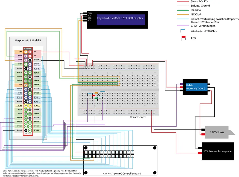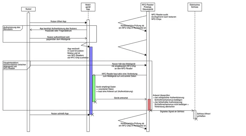 Entwickelt wurde ein prototypisches System bestehend aus einer Android-App für das Smartphone und einer Steuersoftware für den Raspberry Pi. Der Pi dient als Steuergerät und öffnet bzw.schließt ein elektronisches Schloss, sofern Daten per NFC mit einem autorisierten Smartphones ausgetauscht werden.