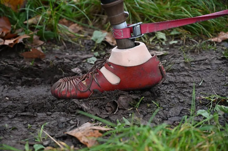 Mit einer Belastungsvorrichtung können unterschiedliche Gewichtskräfte auf eine Fußprothese ausgeübt werden, die den römischen Schuh trägt.