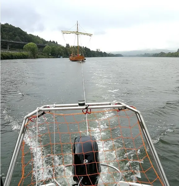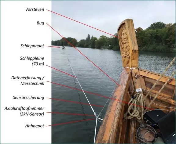 Als Grundlage für die Strömungssimulation des Schiffsrumpfes, musste bei unterschiedlichen Schleppgeschwindigkeiten und unterschiedlichen Beladungen der Wasserwiderstand des Rumpfes erfasst werden. Mit einer 70m langen schwimmfähigen Schleppleine, in deren Hahnepot ein Axialkraftsensor zur Messung des Wasserwiderstandes des Römerschiffs integriert war, wurde das 15 Tonnen schwere Römerschiff von dem Forschungs- und Messboot der Hochschule Trier durch die Mosel gezogen. Die Leinenlänge wurde dabei so gewählt, dass die Wirbelschleppe des Zugbootes die Messungen möglichst wenig beeinflusst.
