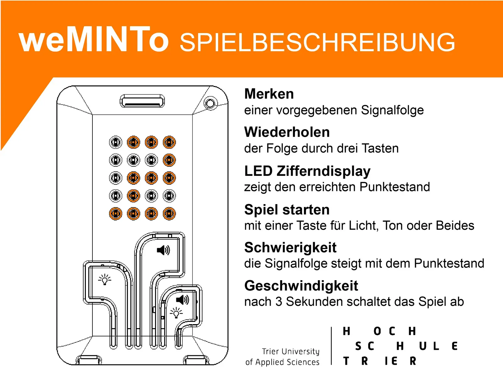 weMINTo kann auf drei verschiedene Arten gespielt werden. Startet man mit der rechten Taste, wird eine Signalkombination aus Licht und Ton ausgegeben. Mit der mittleren Taste erklingen nur Töne, über Start mit der linken Taste erscheint nur eine Lichtfolge. Der Punktestand kann durch gleichzeitiges Drücken der linken und rechten Taste zurückgesetzt werden. Bei fehlerhafter Eingabe der Tastenfolge endet die aktuelle Sequenz und es beginnt eine neue Runde mit einer neuen Zufallssequenz.