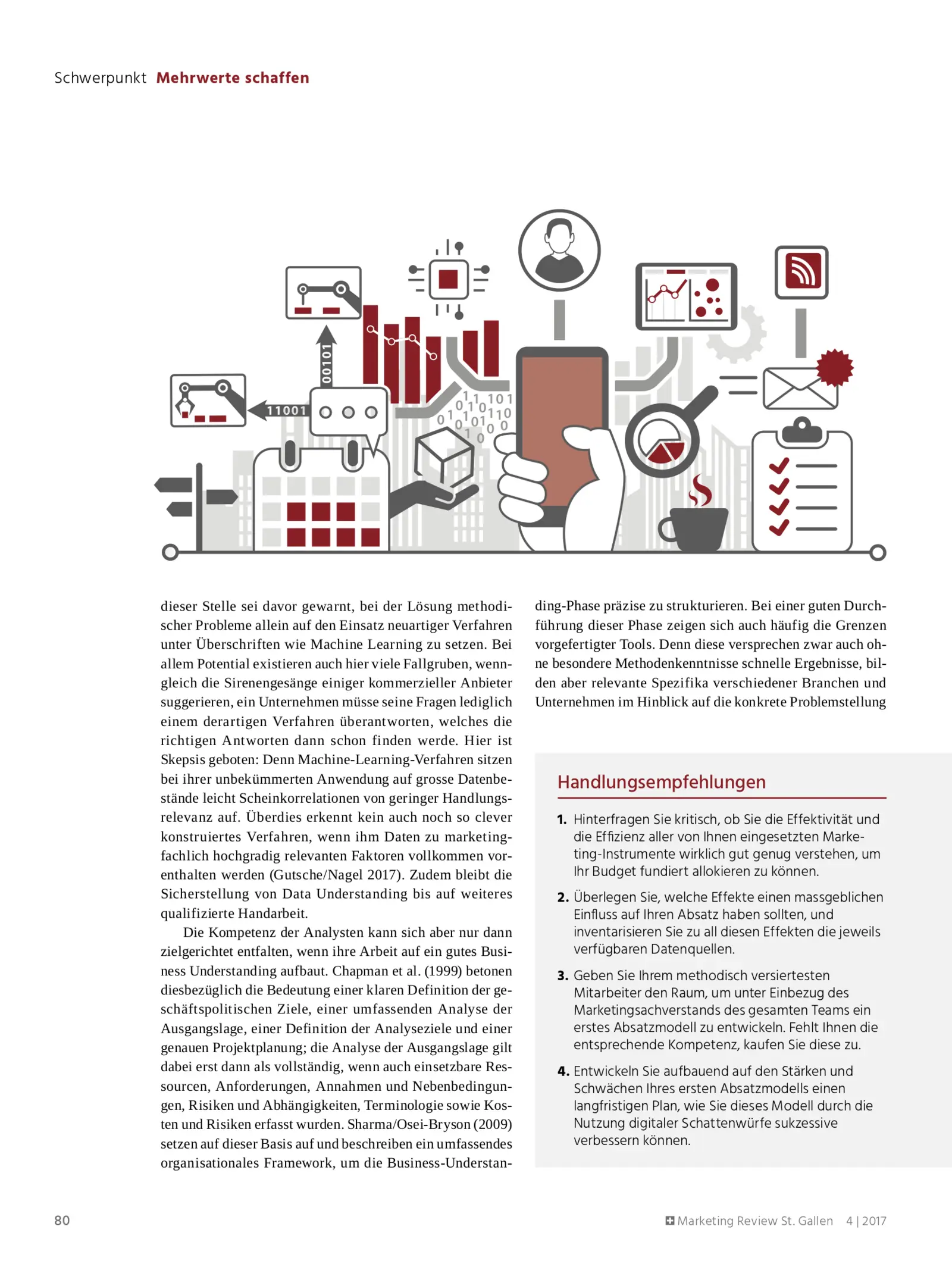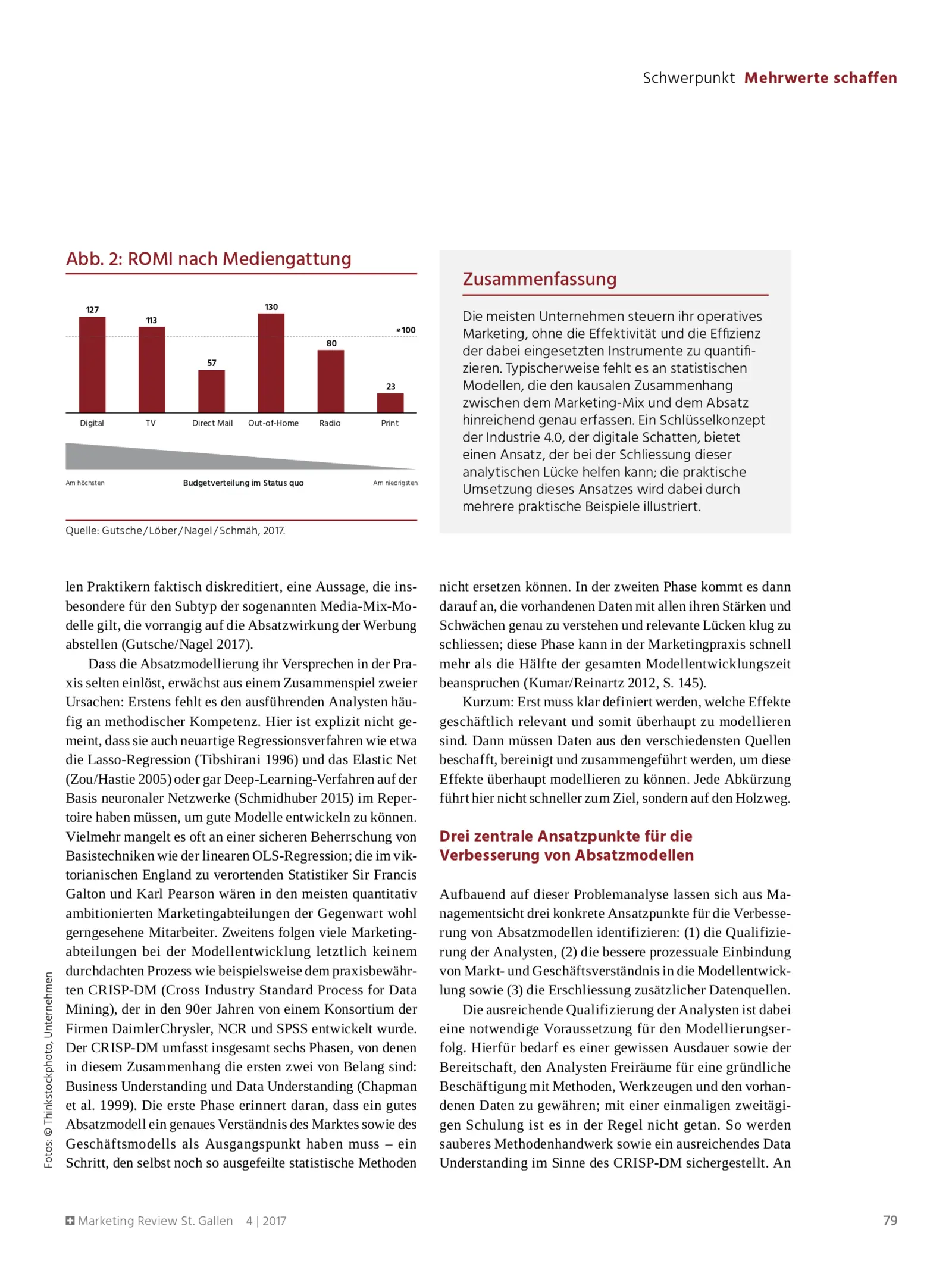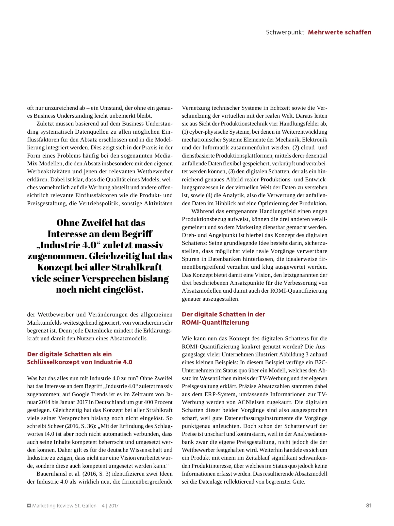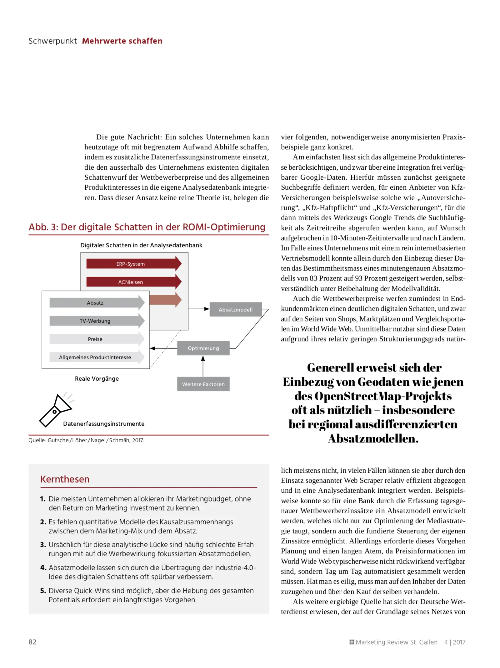 Die meisten Unternehmen steuern ihr operatives Marketing, ohne die Effektivität und die Effizienz der dabei eingesetzten Instrumente zu kennen. Typischerweise fehlt es an statistischen Modellen, die den kausalen Zusammenhang zwischen dem Marketing-Mix und dem Absatz hinreichend genau erfassen und so die Quantifizierung des Return on Marketing Investment (ROMI) ermöglichen. Ein Schlüsselkonzept der Industrie 4.0, der digitale Schatten, bietet einen Ansatz, der bei der Schliessung dieser analytischen Lücke helfen kann. Die praktische Umsetzung dieses Ansatzes konnte dabei im Rahmen dieses Projekts anhand mehrerer praktische Beispiele erfolgreich erprobt werden.