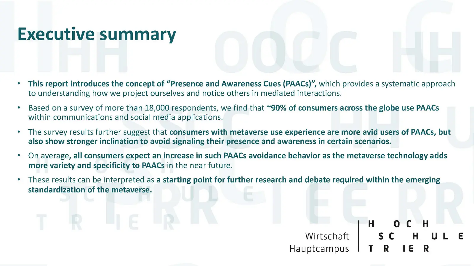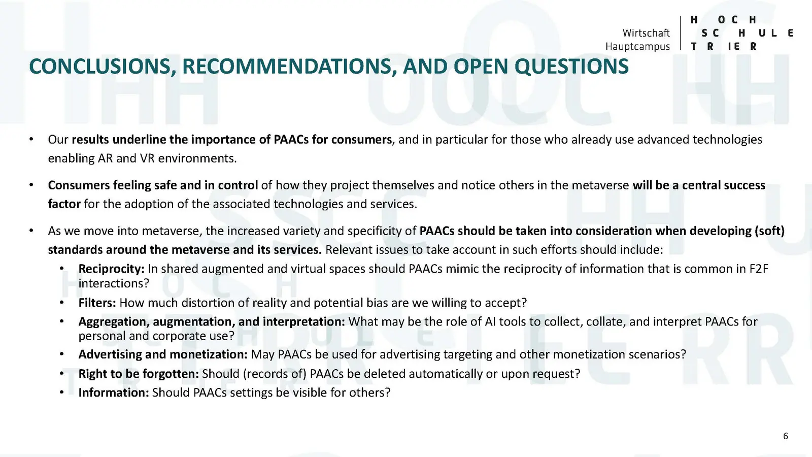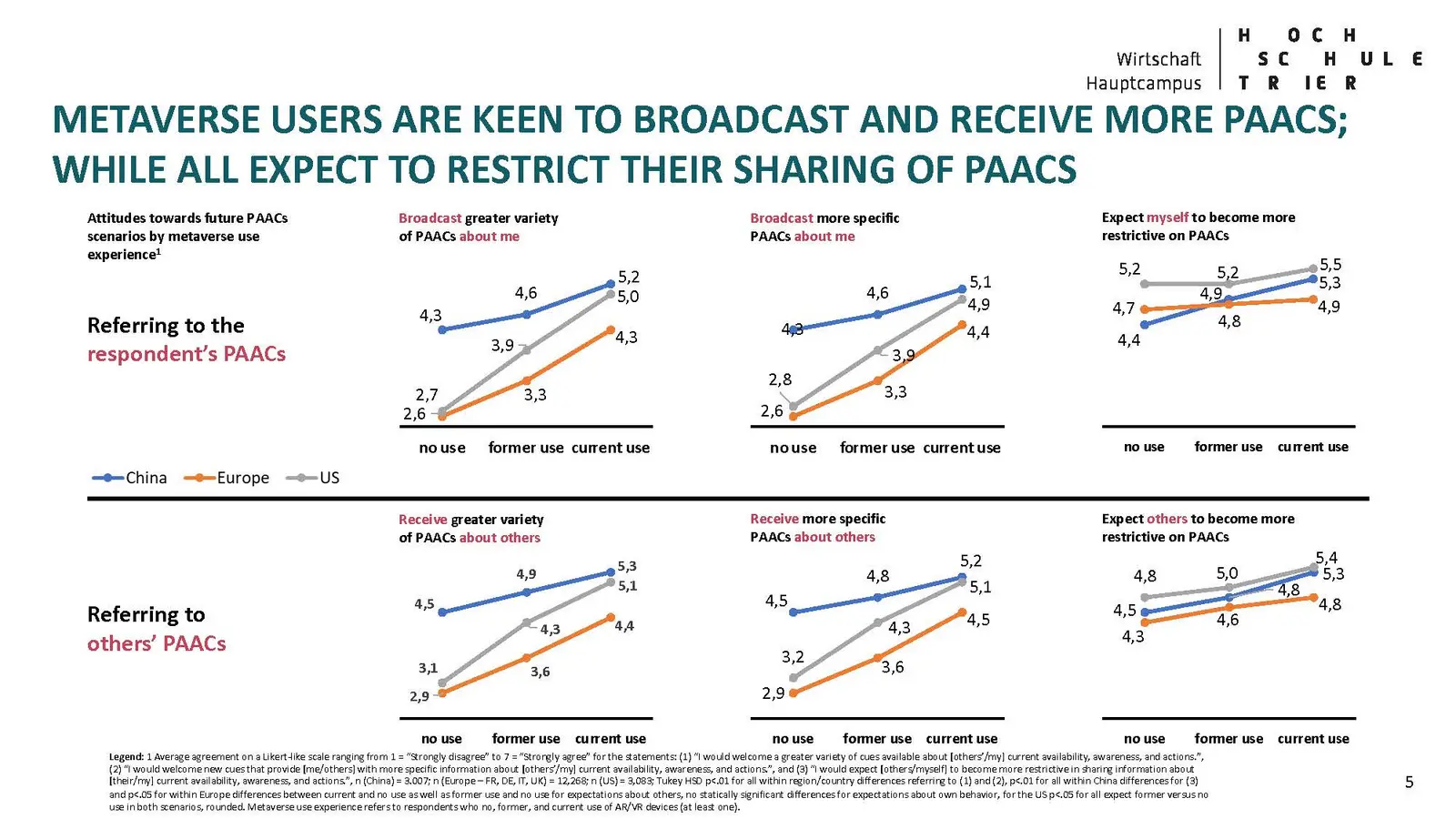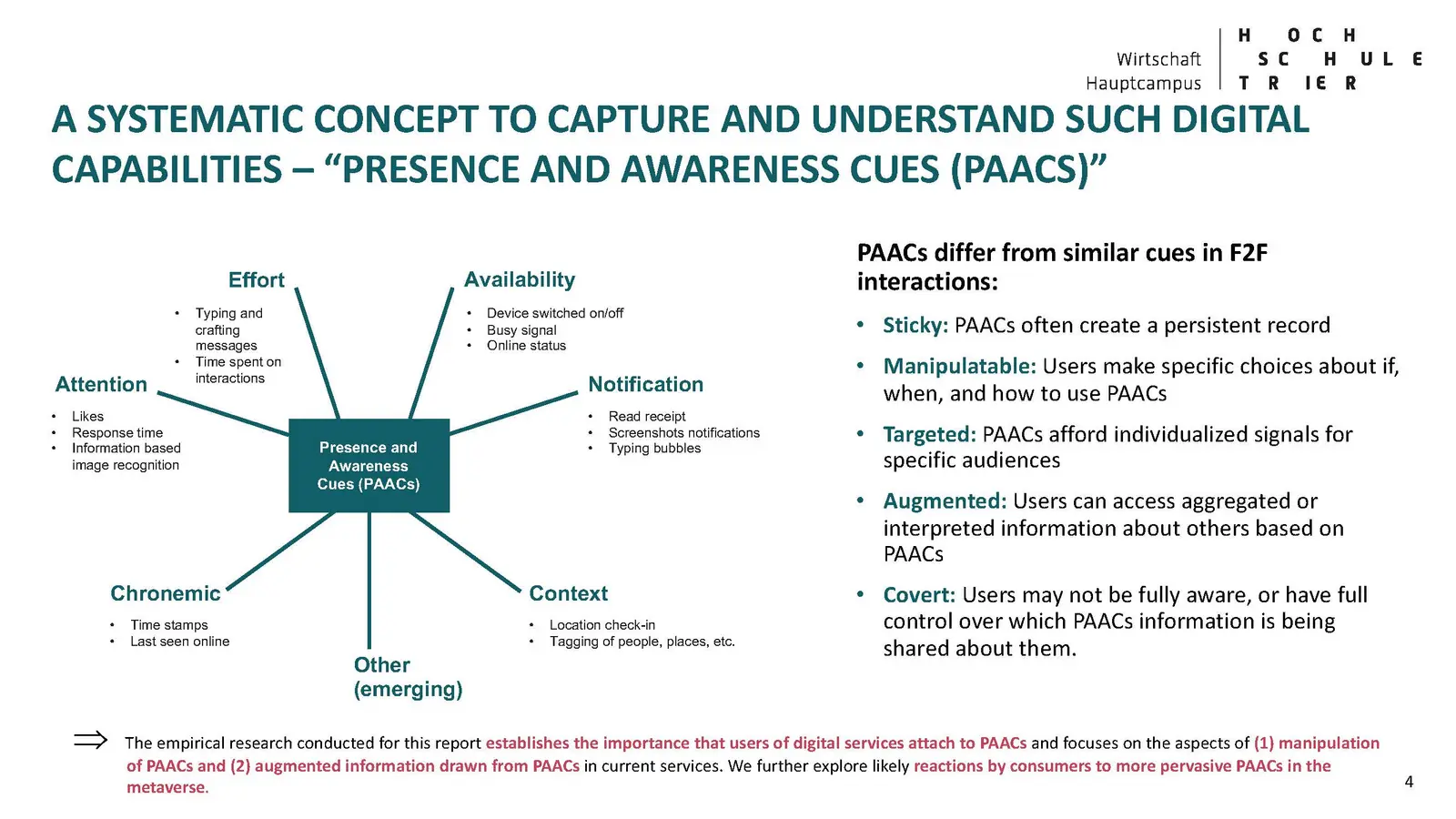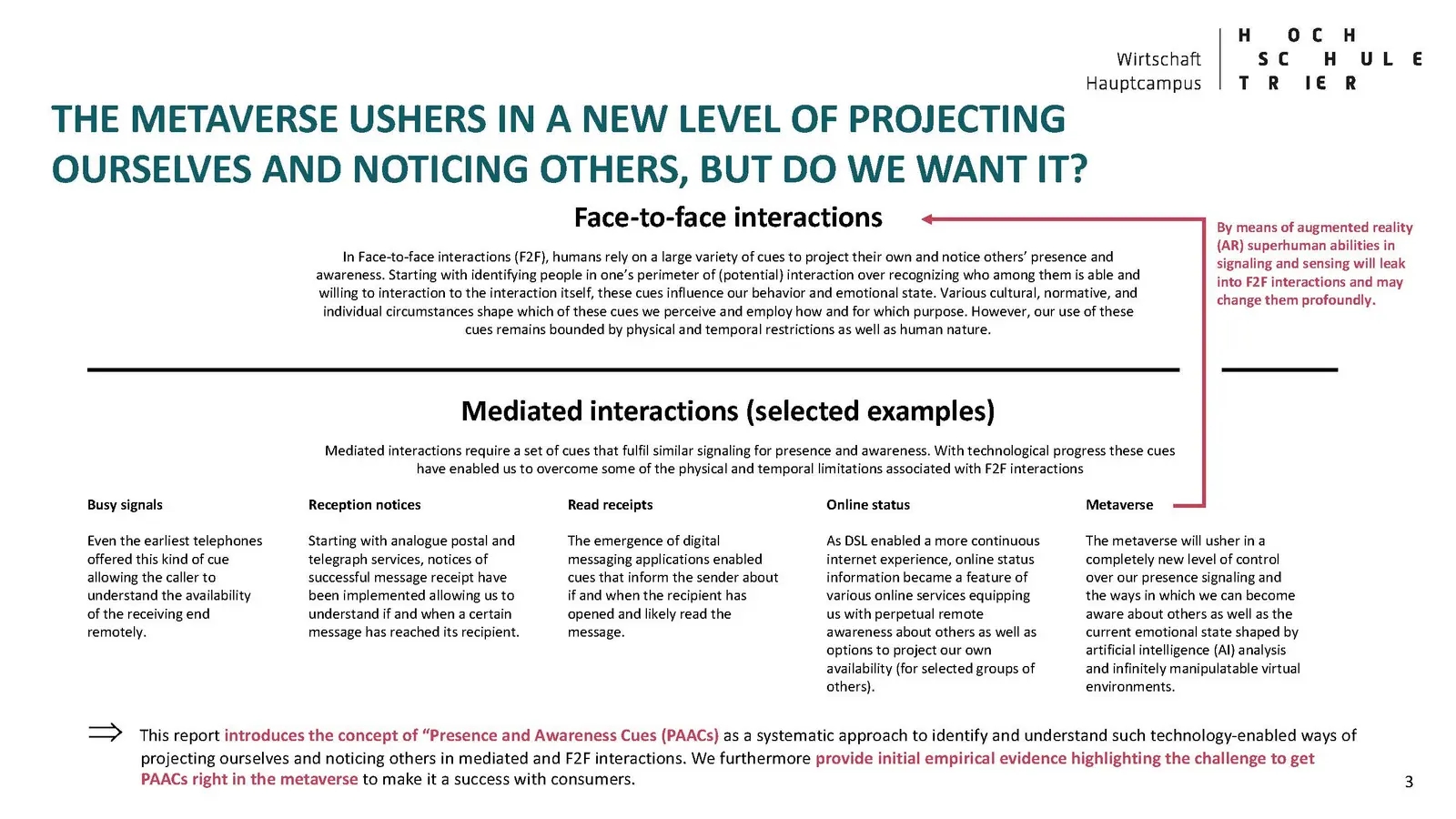Grundsätzlich ist es möglich, im virtuellen Raum zahlreiche und komplexe PAACs zu implementieren und damit, über die unmittelbare Kommunikation hinaus, zahlreiche weitere Informationen zur Verfügung zu stellen. Die drängende Frage, ob Nutzende dazu bereit sind und welche Schritte erforderlich sind, um potenziell nachteilige Effekte abzumildern, wurde bisher jedoch kaum erforscht. Dabei wird dieser Aspekt einen zentralen Erfolgsfaktor für die Annahme der mit dem Metaverse verbundenen Dienste und Technologien darstellen.