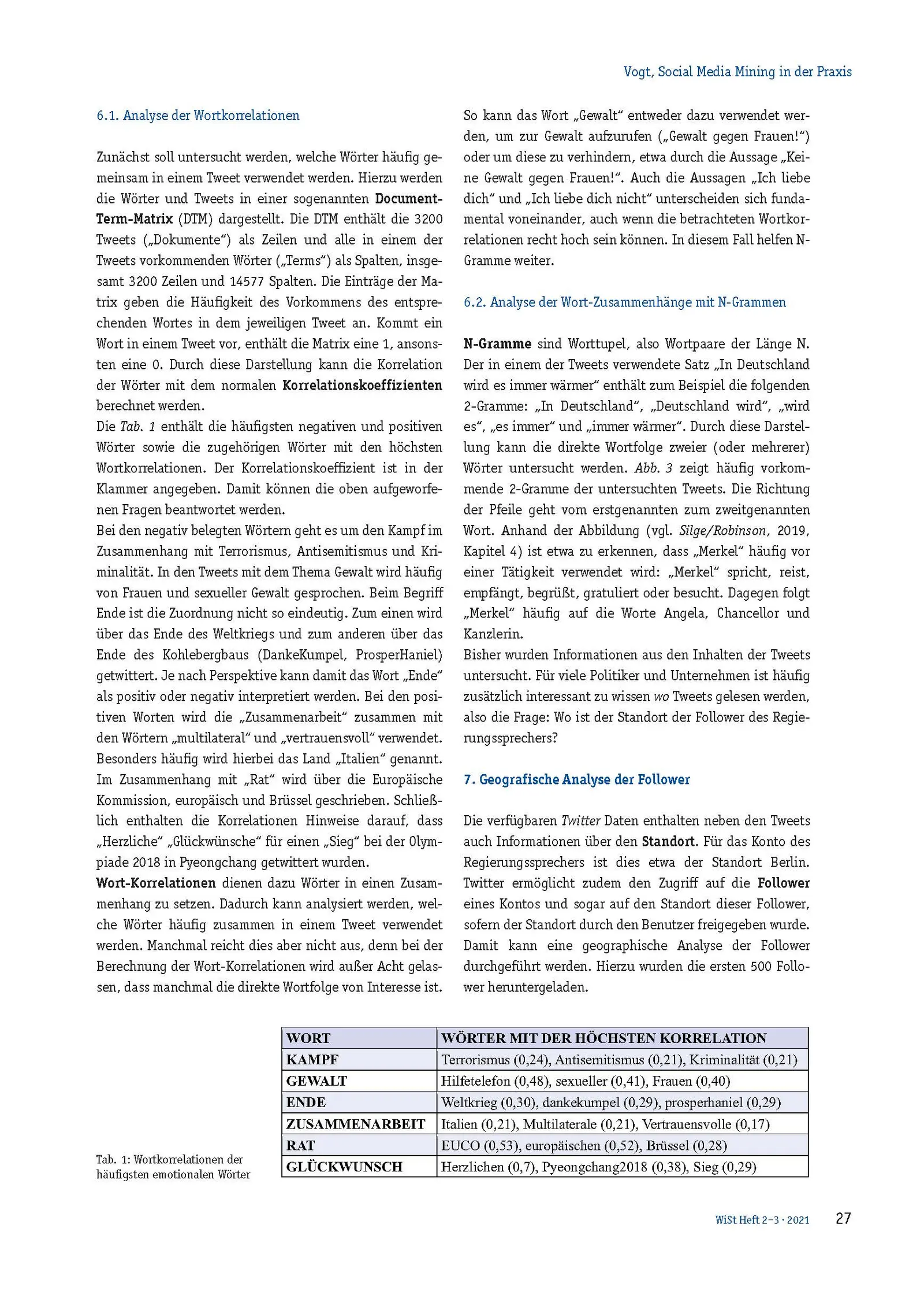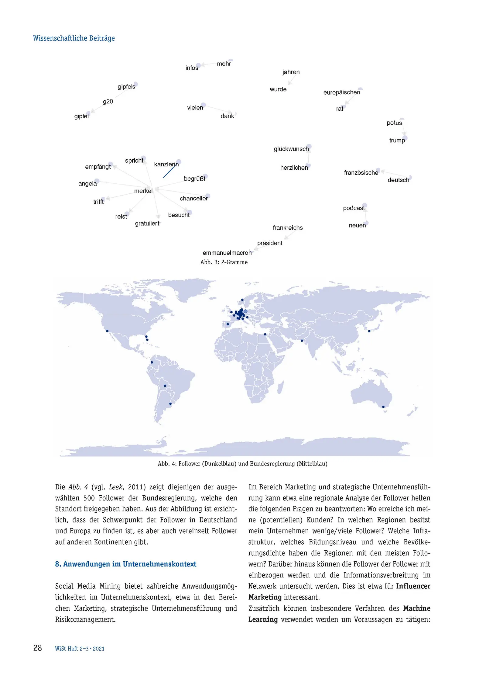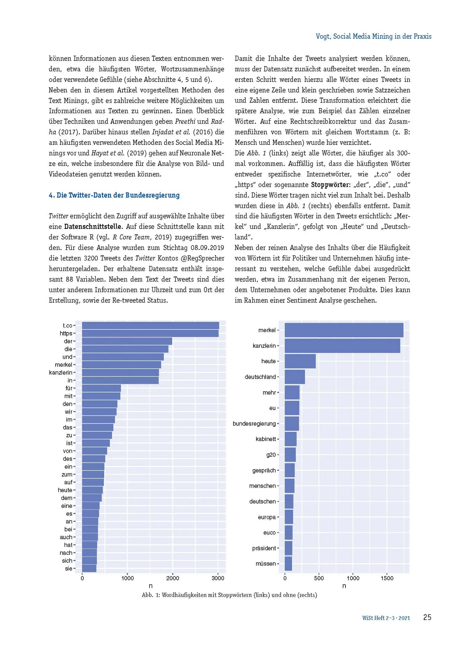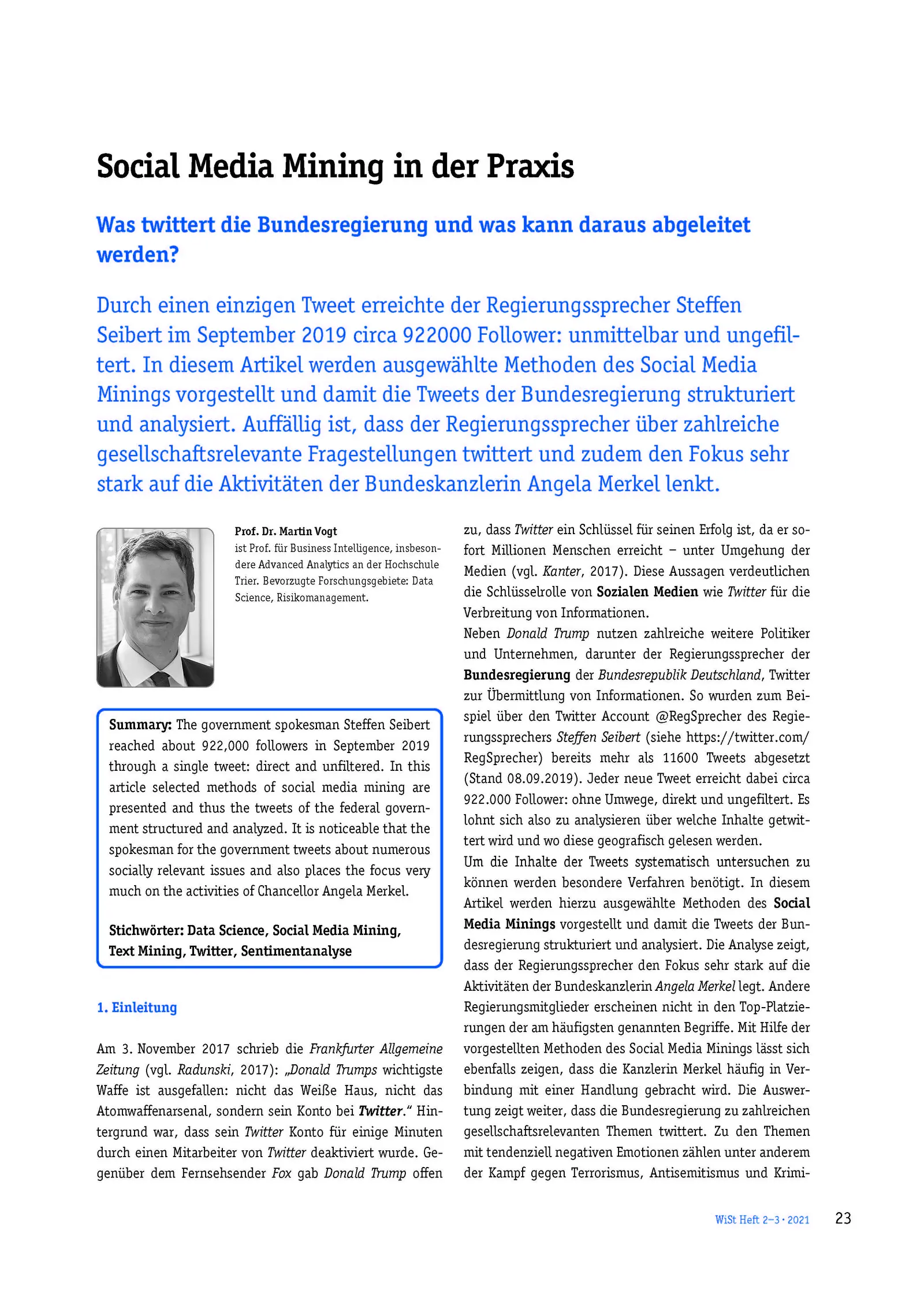 Durch einen einzigen Tweet erreichte der Regierungssprecher Steffen Seibert im September 2019 circa 922000 Follower: unmittelbar und ungefiltert. In diesem Artikel werden ausgewählte Methoden des Social Media Minings vorgestellt und damit die Tweets der Bundesregierung strukturiert und analysiert. Auffällig ist, dass der Regierungssprecher über zahlreiche gesellschaftsrelevante Fragestellungen twittert und zudem den Fokus sehr stark auf die Aktivitäten der Bundeskanzlerin Angela Merkel lenkt.