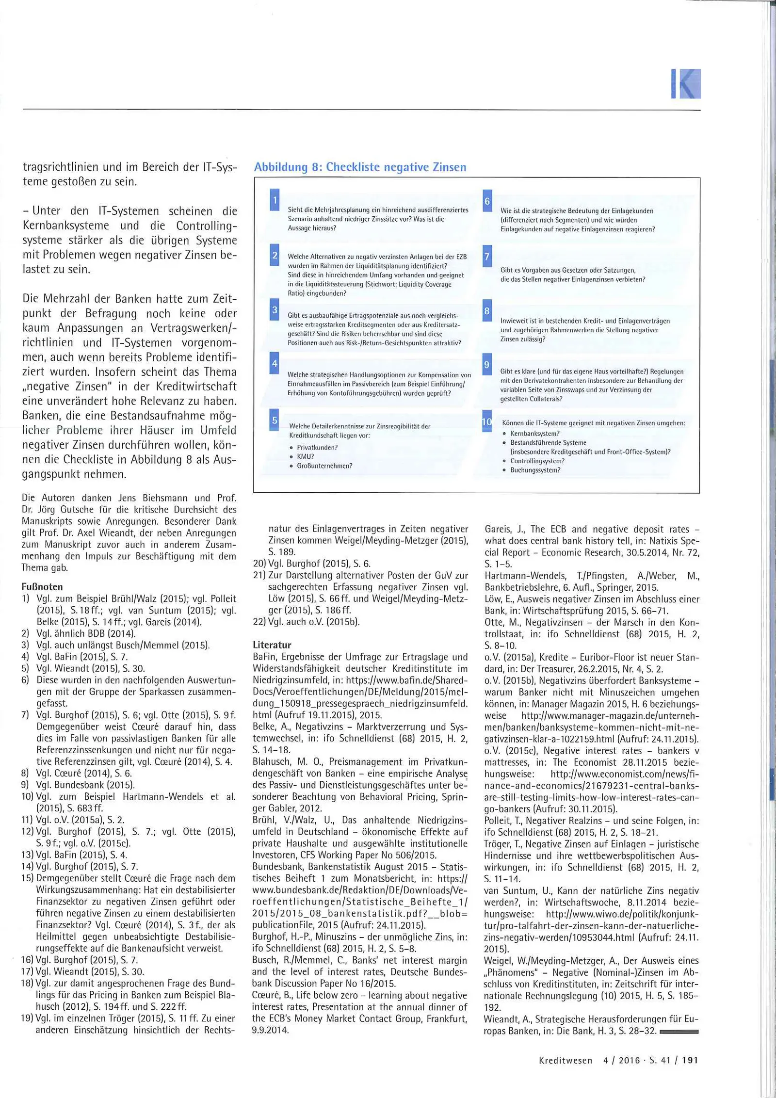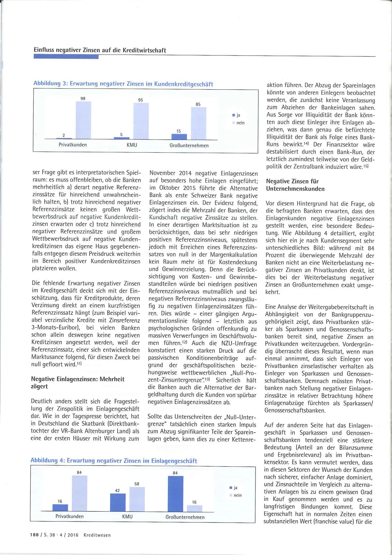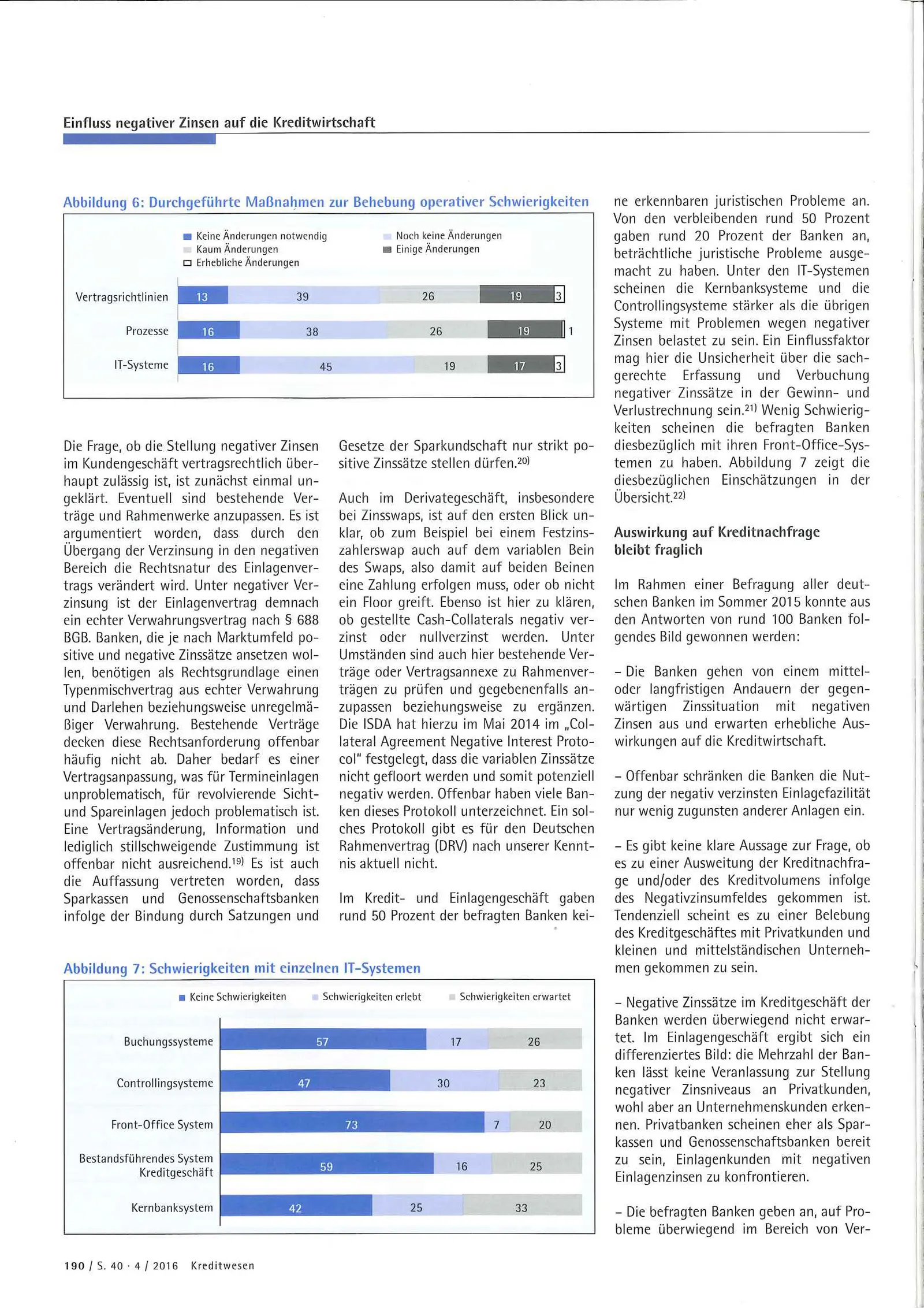 Seit einiger Zeit sind im Euroraum nicht nur die Realzinssätze, sondern auch einige Nominalzinssätze negativ. Dieser Beitrag widmet sich den Konsequenzen für Banken anhand eines Online-Fragebogens, welcher alle deutschen Geschäftsbanken (1.780 Banken, rund 100 Banken haben teilgenommen) u.a. zu den folgenden Themen befragt: a) „schlagen/schlugen negative Referenzzinssätze auch auf negative Kundenzinssätze durch?“; b) „wie bewerten Banken die juristische Situation rund um negative Zinsen?“ und c) „hatten/haben Banken technische Probleme in der Erfassung der negativen Zinsen in IT-Systemen?“. Eine praktische Checkliste resümiert die verschiedenen Facetten der Analyse.