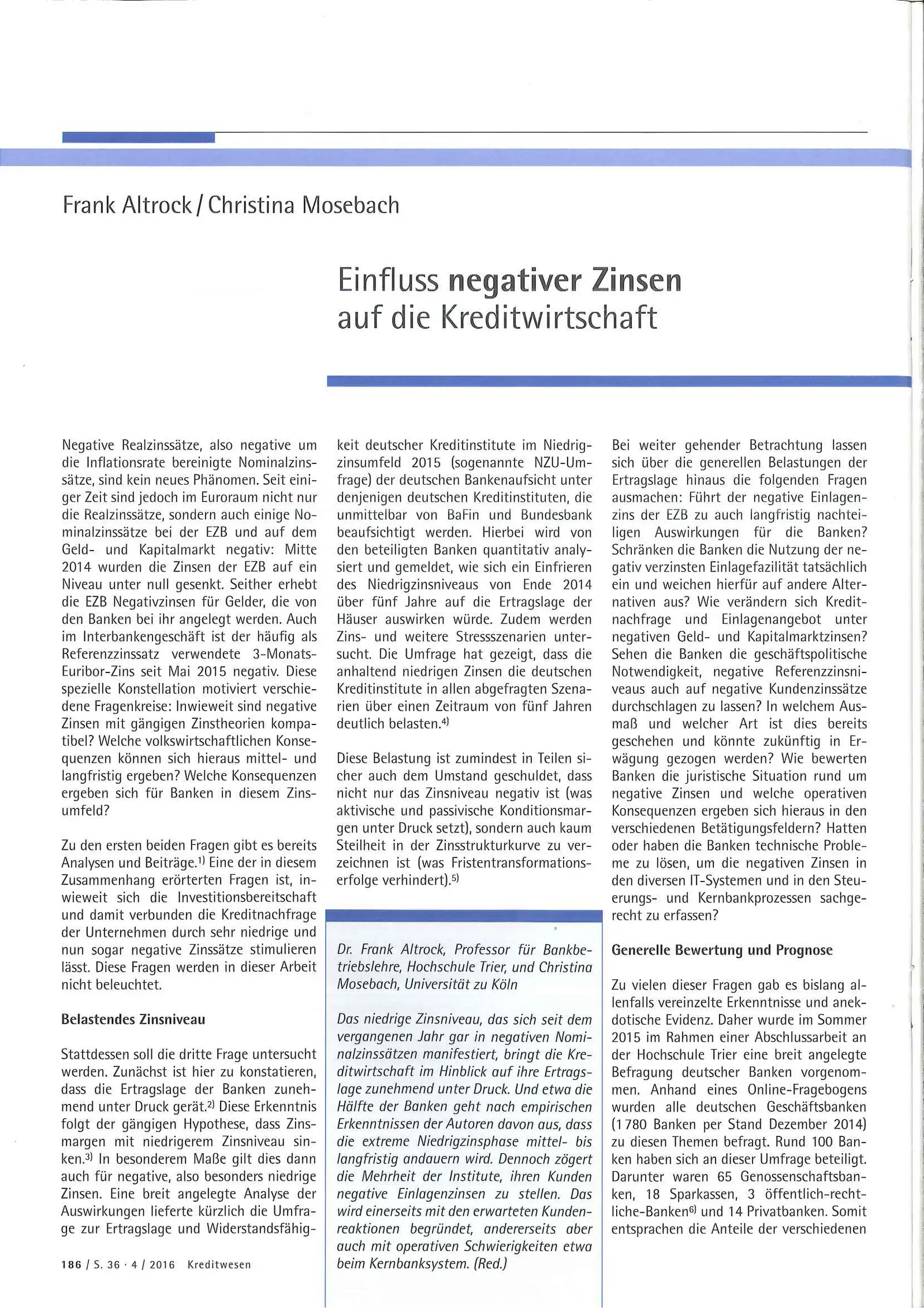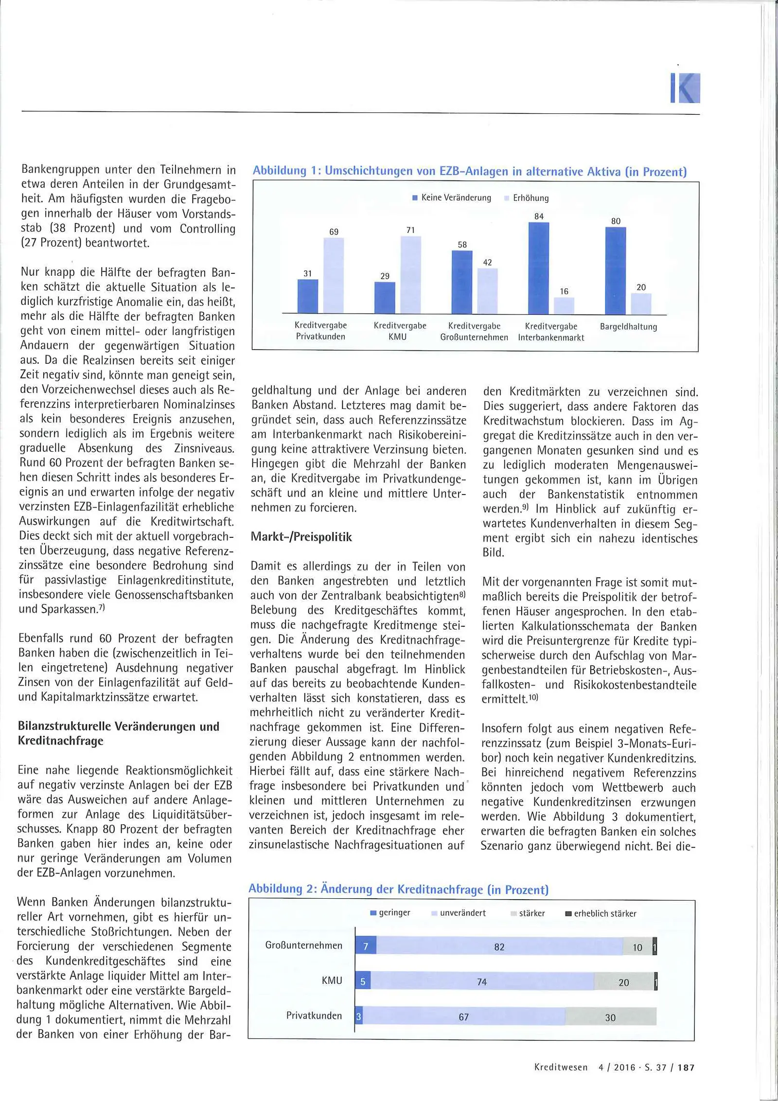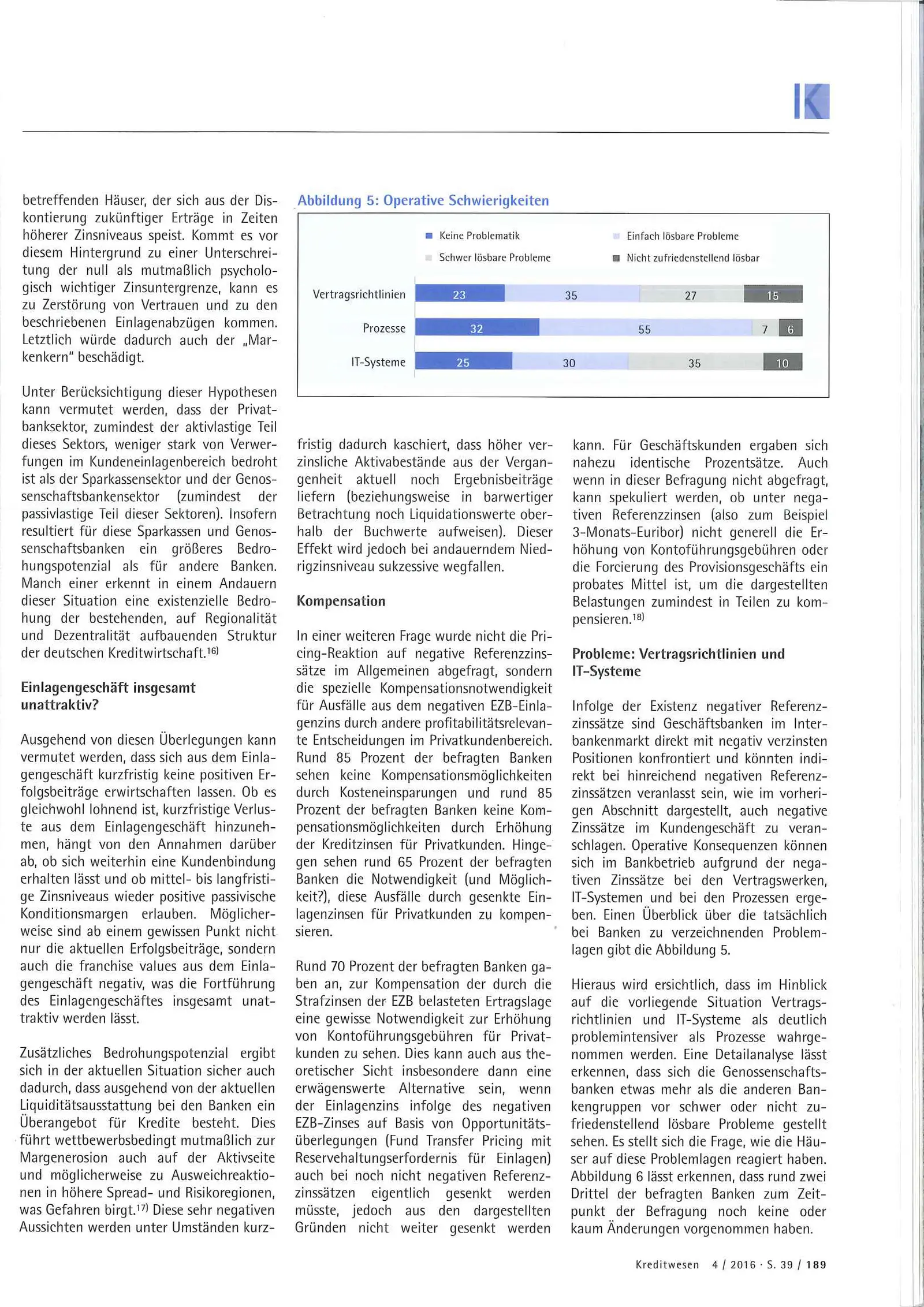 Seit einiger Zeit sind im Euroraum nicht nur die Realzinssätze, sondern auch einige Nominalzinssätze negativ. Dieser Beitrag widmet sich den Konsequenzen für Banken anhand eines Online-Fragebogens, welcher alle deutschen Geschäftsbanken (1.780 Banken, rund 100 Banken haben teilgenommen) u.a. zu den folgenden Themen befragt: a) „schlagen/schlugen negative Referenzzinssätze auch auf negative Kundenzinssätze durch?“; b) „wie bewerten Banken die juristische Situation rund um negative Zinsen?“ und c) „hatten/haben Banken technische Probleme in der Erfassung der negativen Zinsen in IT-Systemen?“. Eine praktische Checkliste resümiert die verschiedenen Facetten der Analyse.