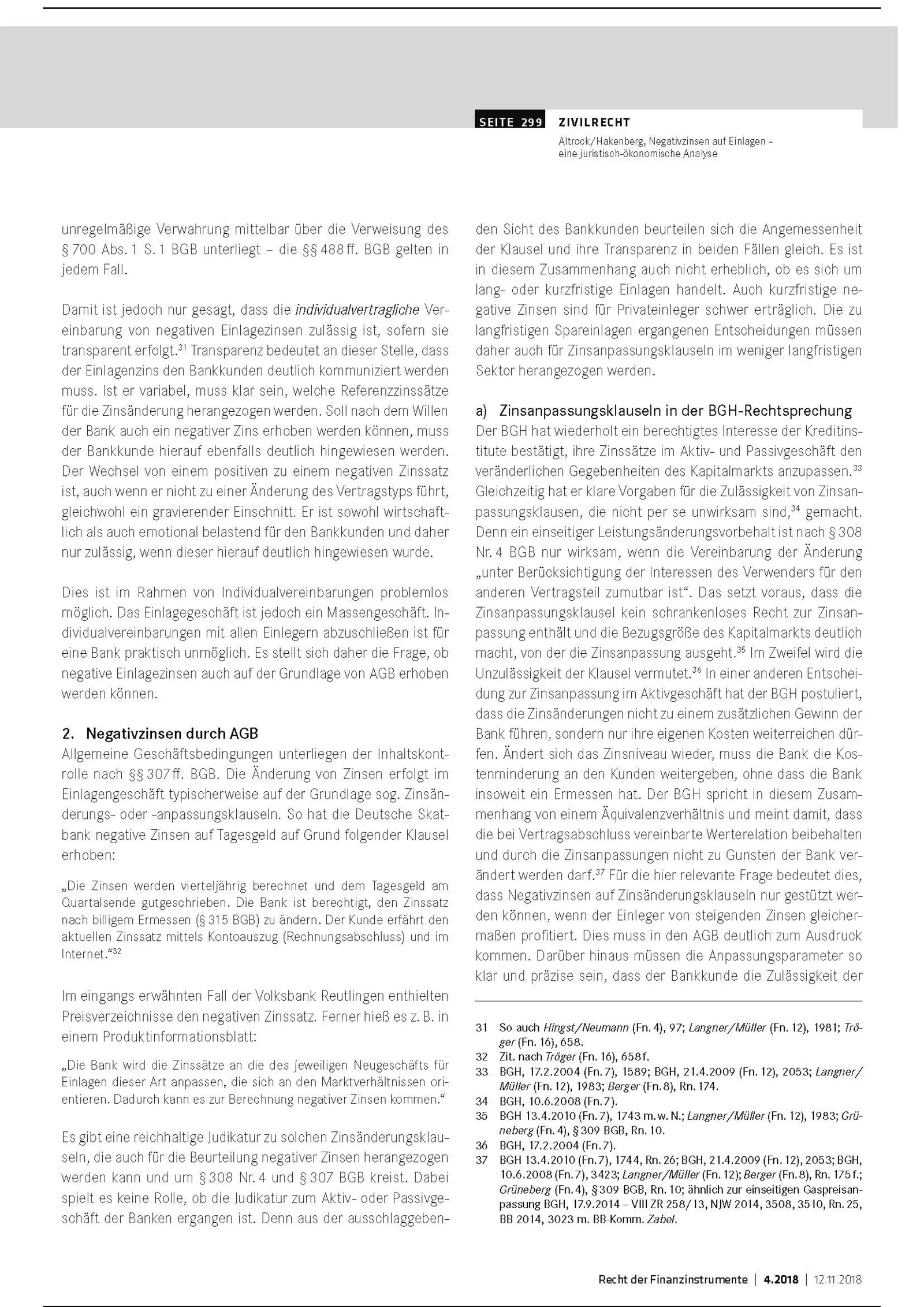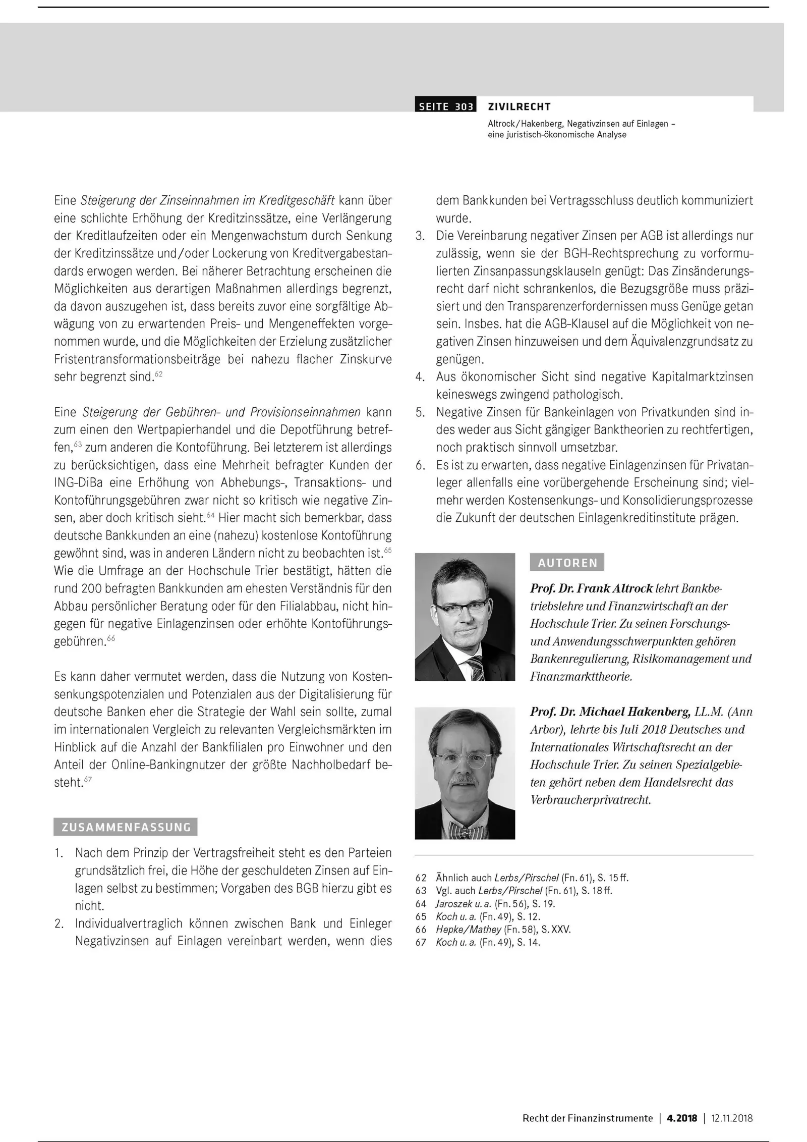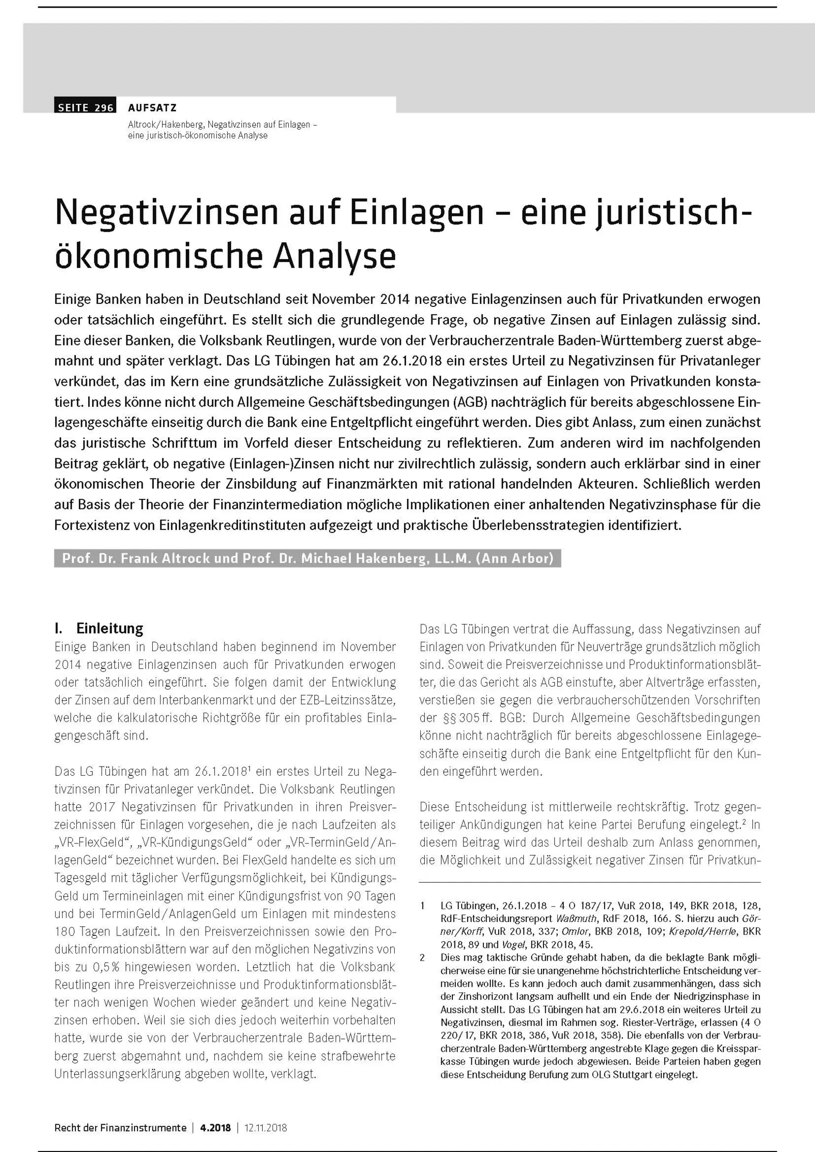 Einige Banken haben in Deutschland seit November 2014 negative Einlagenzinsen auch für Privatkunden erwogen oder tatsächlich eingeführt. Zur Frage, ob negative Zinsen auf Einlagen zulässig sind, liegen erste Gerichtsurteile vor. Dies gibt Anlass, zum einen zunächst das juristische Schrifttum im Vorfeld zu reflektieren. Zum anderen wird im nachfolgenden Beitrag geklärt, ob negative (Einlagen-) Zinsen nicht nur zivilrechtlich zulässig, sondern auch ökonomisch rational erklärbar sind. Schließlich werden auf Basis ausgewählter Theorien der Finanzintermediation mögliche Implikationen einer anhaltenden Negativzinsphase für die Fortexistenz von Einlagenkreditinstituten aufgezeigt und praktische Überlebensstrategien identifiziert.