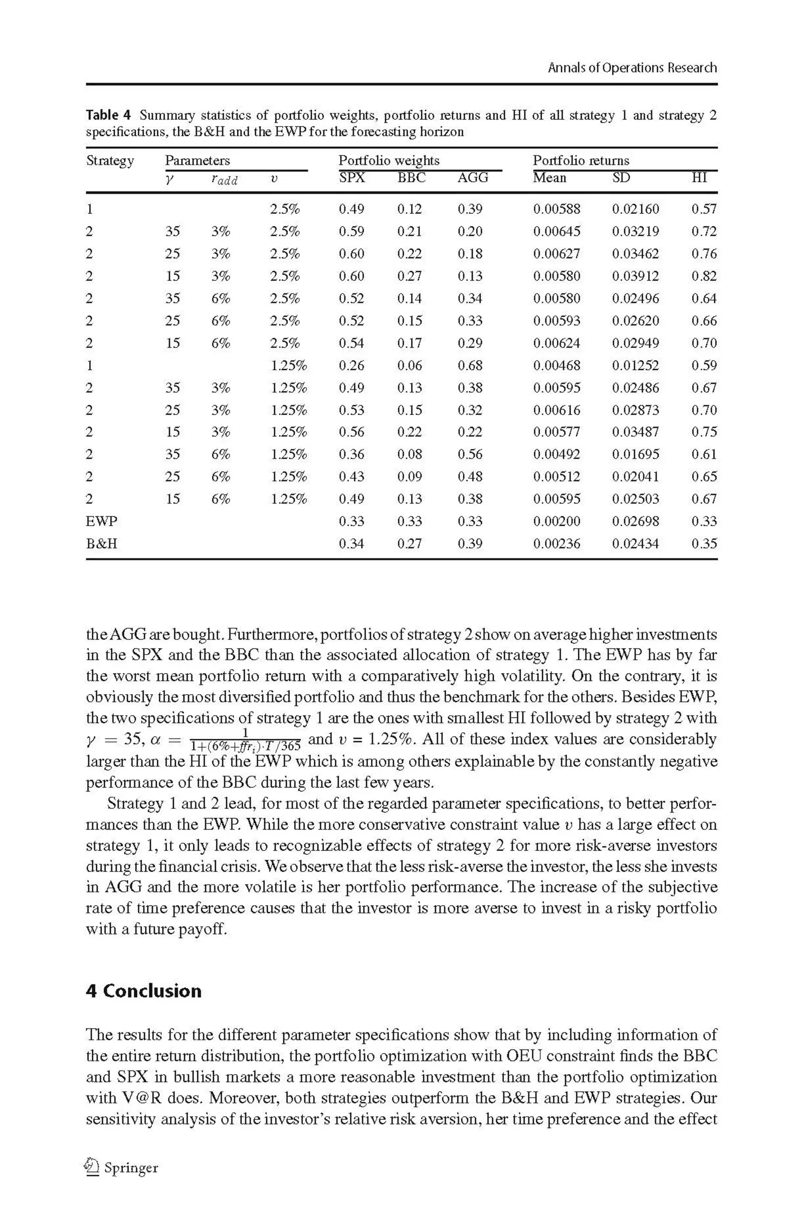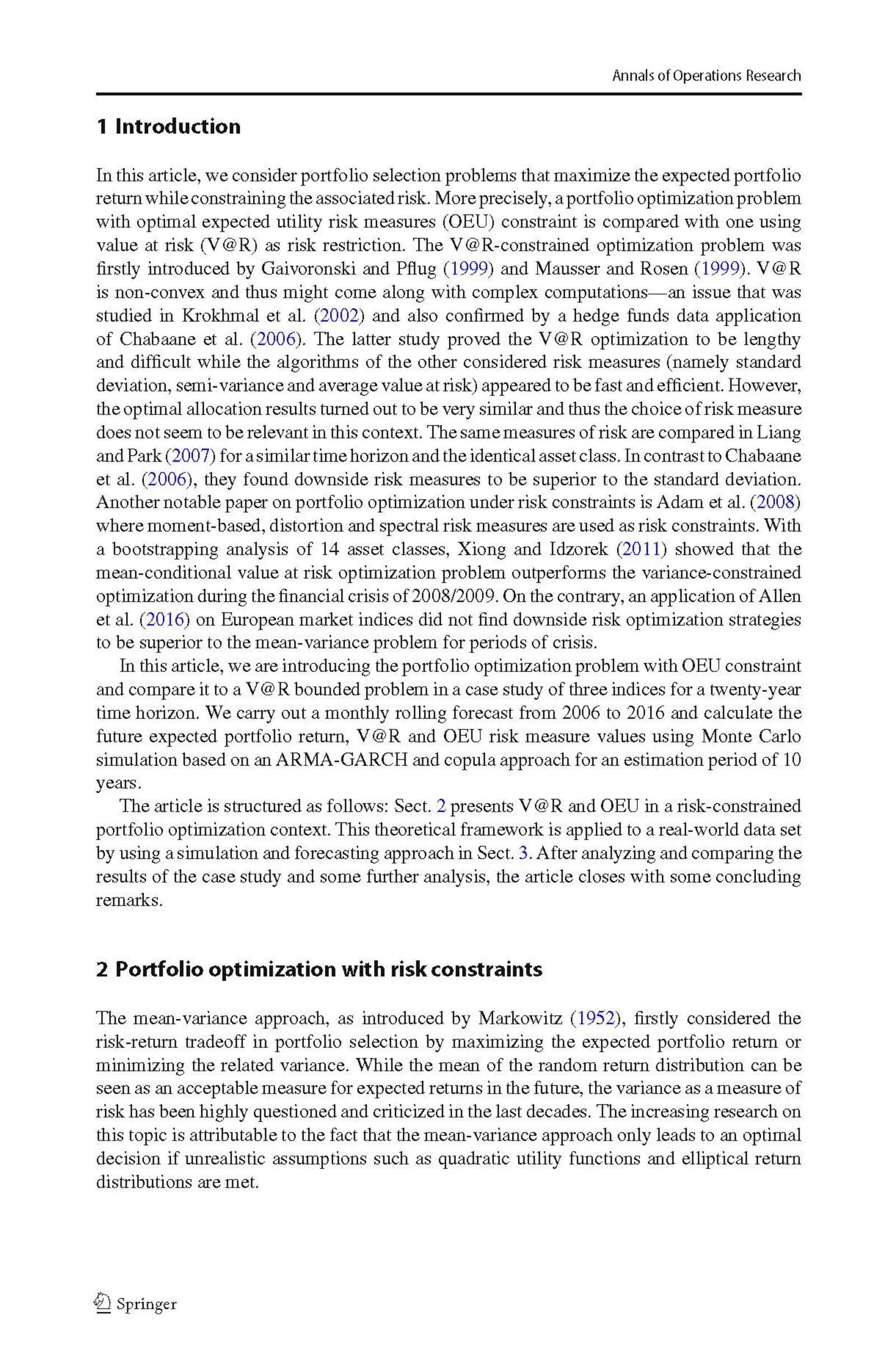 Optimal expected utility risk measures (OEU) sind nutzenbasierte Risikomaße, die in Geissel et al. (2017) eingeführt wurden. OEU können auf individuelle Risikoeinstellungen angepasst werden und sie sind koheränte Risikomaße für Nutzenfunktionen mit konstanter relativer Risikoaversion. In diesem Artikel werden OEU im Kontext von Portfoliooptimierung mit Risikonebenbedingung eingesetzt. In einer Fallstudie werden OEU-optimierte mit Value-at-Risk-optimierten sowie mit Buy-and-Hold (B&H)- und Equally-Weighted (EW)-Portfolios verglichen. Hierzu werden Copula-ARMA-GARCH-Modelle eingesetzt. Die Resultate zeigen, dass die risikobeschränkten Portfolios deutlich besser performen als B&H und EW. Dabei sind für OEU-optimierte Portfolios Effekte der Individualisierung erkennbar. Zum Beispiel erfahren besonders risikofreudige Investoren in der Finanzkrise große Verluste, die jedoch durch Überrenditen in nachfolgenden Haussephasen ausgeglichen werden.