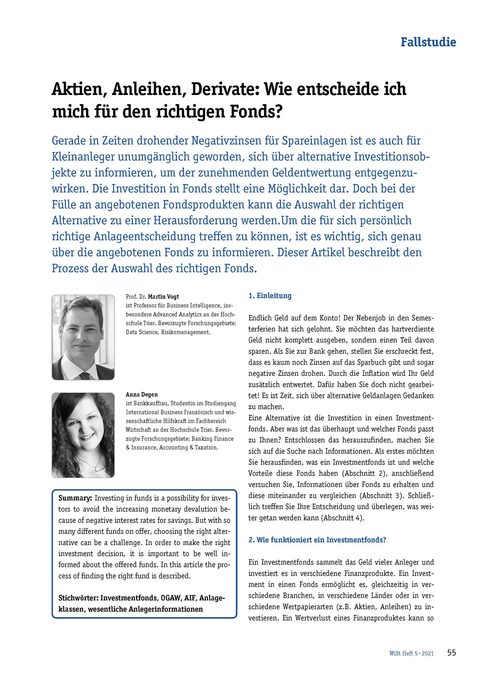 Gerade in Zeiten drohender Negativzinsen für Spareinlagen ist es auch für Kleinanleger unumgänglich geworden, sich über alternative Investitionsobjekte zu informieren, um der zunehmenden Geldentwertung entgegenzuwirken. Die Investition in Fonds stellt eine Möglichkeit dar. Doch bei der Fülle an angebotenen Fondsprodukten kann die Auswahl der richtigen Alternative zu einer Herausforderung werden.Um die für sich persönlich richtige Anlageentscheidung treffen zu können, ist es wichtig, sich genau über die angebotenen Fonds zu informieren. Dieser Artikel beschreibt den Prozess der Auswahl des richtigen Fonds.
