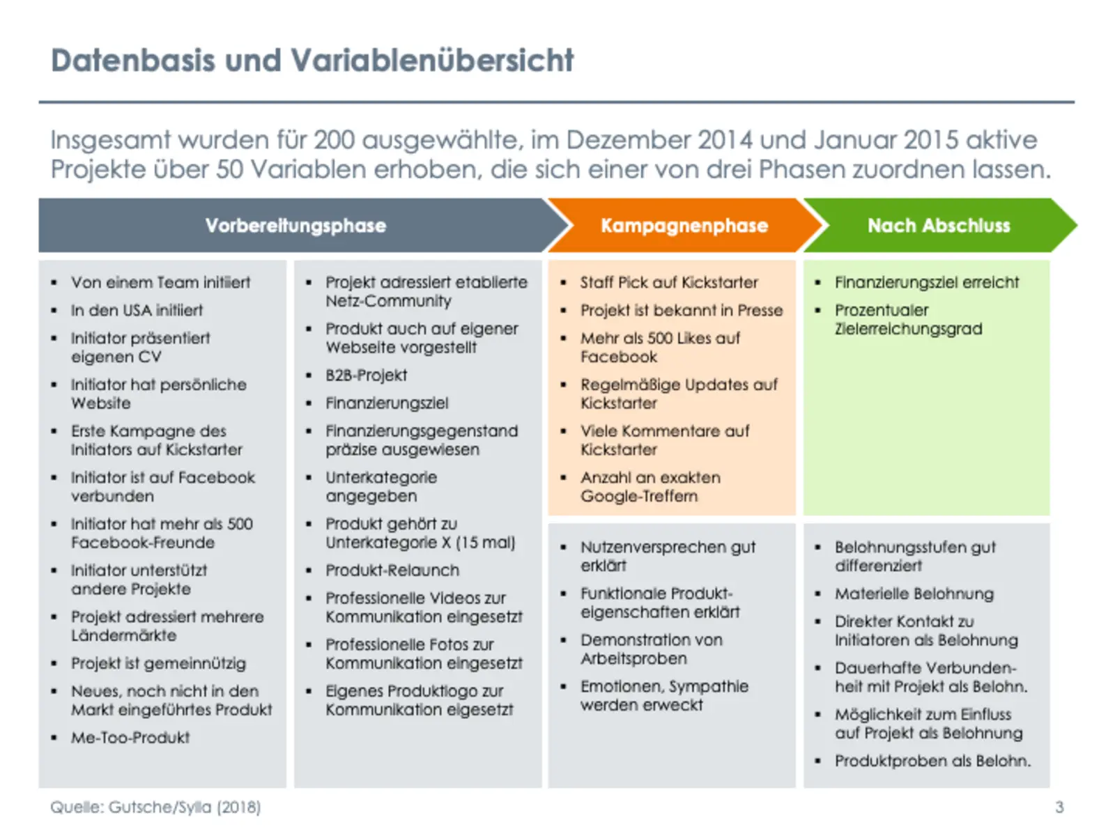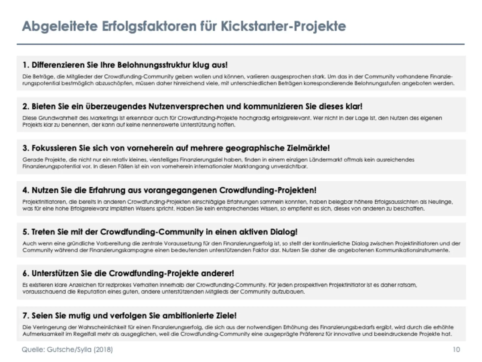 In den letzten Jahren hat sich Crowdfunding als neues Instrument zur Finanzierung innovativer Produktideen und Startups etabliert. Der Erfolg einzelner Crowdfunding-Projekte, die auf Plattformen wie Kickstarter um Kapital werben, fällt erfahrungsgemäß sehr unterschiedlich aus. Auf der einen Seite stehen glänzende Erfolge, bei denen das Finanzierungsziel um ein Vielfaches übertroffen wird. Auf der anderen Seite finden zahlreiche Projekte auch so gut wie gar keine Geldgeber. Inspiriert von dieser Diskrepanz zwischen Erfolg und Scheitern wurde im Rahmen einer empirischen Studie untersucht, welche Faktoren den Erfolg von Crowdfunding-Projekten positiv beeinflussen. Die zentralen Erkenntnisse lassen sich in sieben Geboten für erfolgreiches Crowdfunding zusammenfassen.