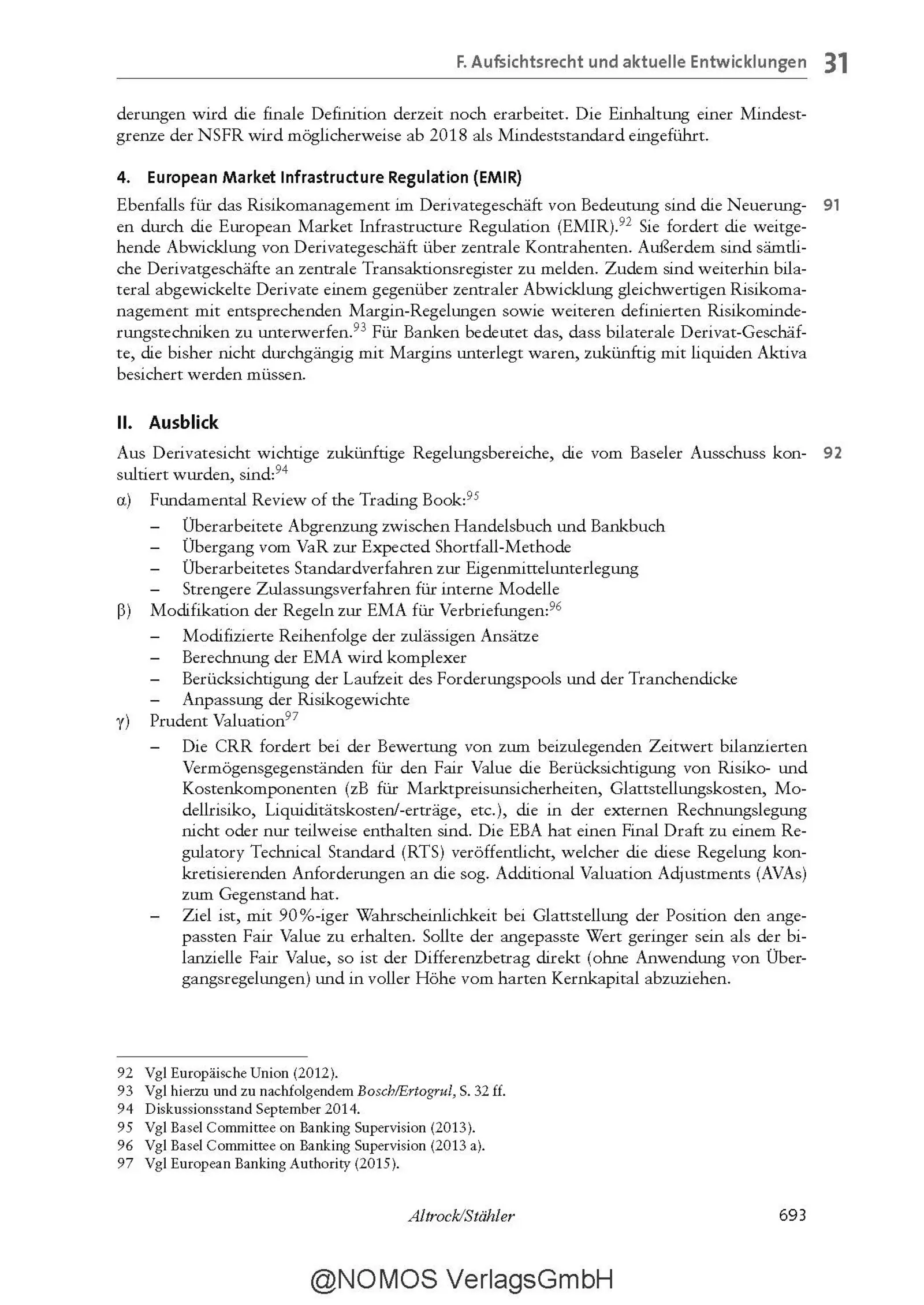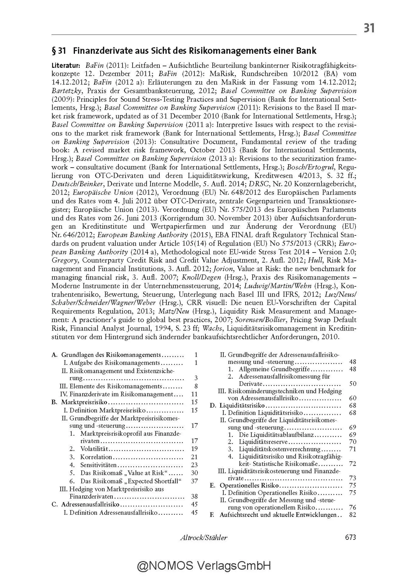 Das Risikomanagement von Finanzderivaten hat in Bankportfolien eine besondere Bedeutung, da bei Fair Value Bilanzierung prinzipiell alle Wertveränderungen auf Ergebnis und Eigenkapital wirken. Die Risiken der Derivate werden häufig über Modelle aus der Preisdynamik der Underlyings abgeleitet. In diesem Primer wird ein Überblick über die Besonderheiten bei und Herausforderungen durch Derivate im Marktpreisrisiko, Adressenausfallrisiko (inkl. neuerer Konzepte zum Kontrahentenrisiko), Liquiditätsrisiko und operationellen Risiko eingegangen. Über die sich rasch ändernden aufsichtsrechtlichen Anforderungen an Institute im Allgemeinen und für Finanzderivate im Besonderen wird ein knapper Überblick gegeben.