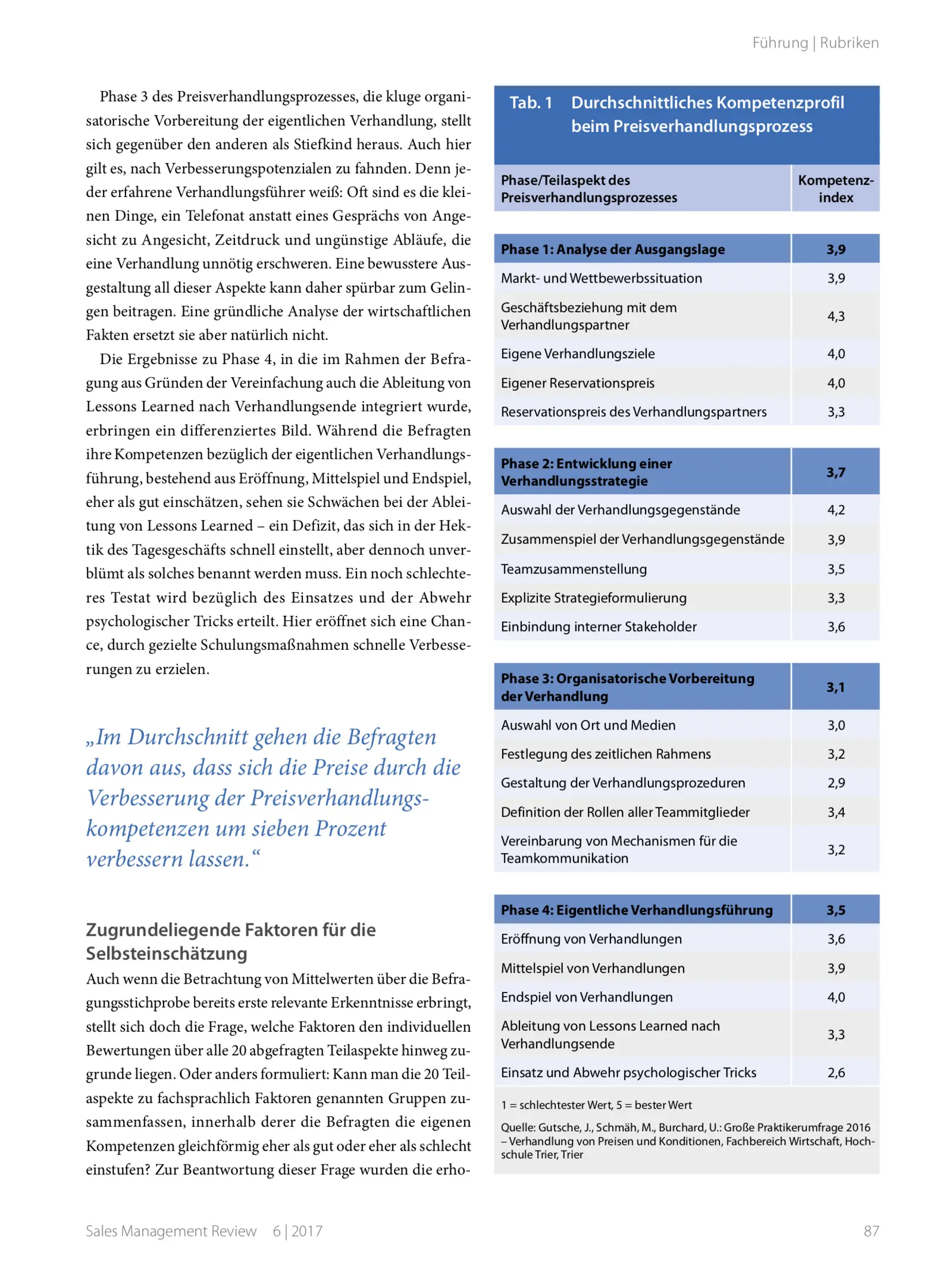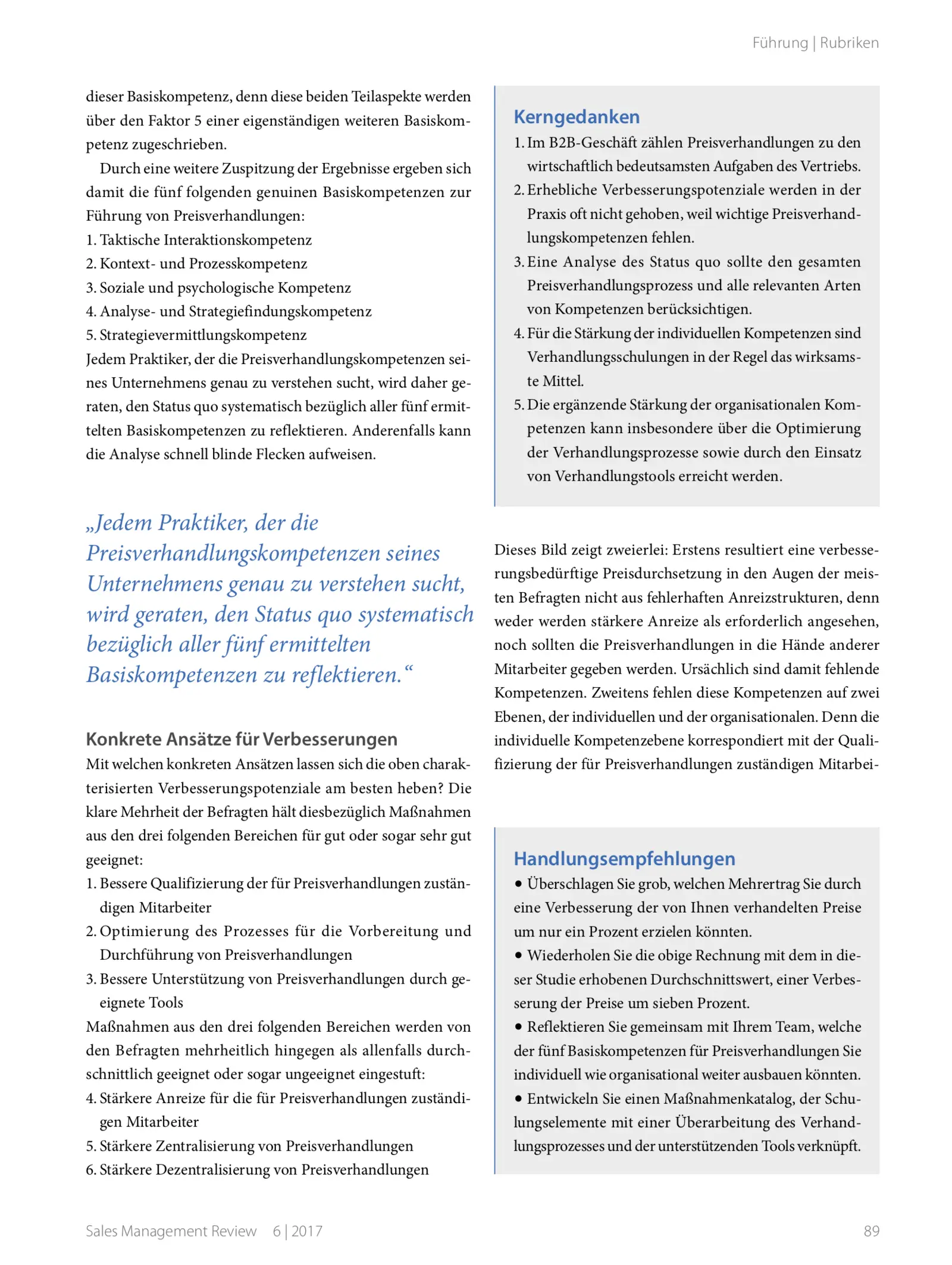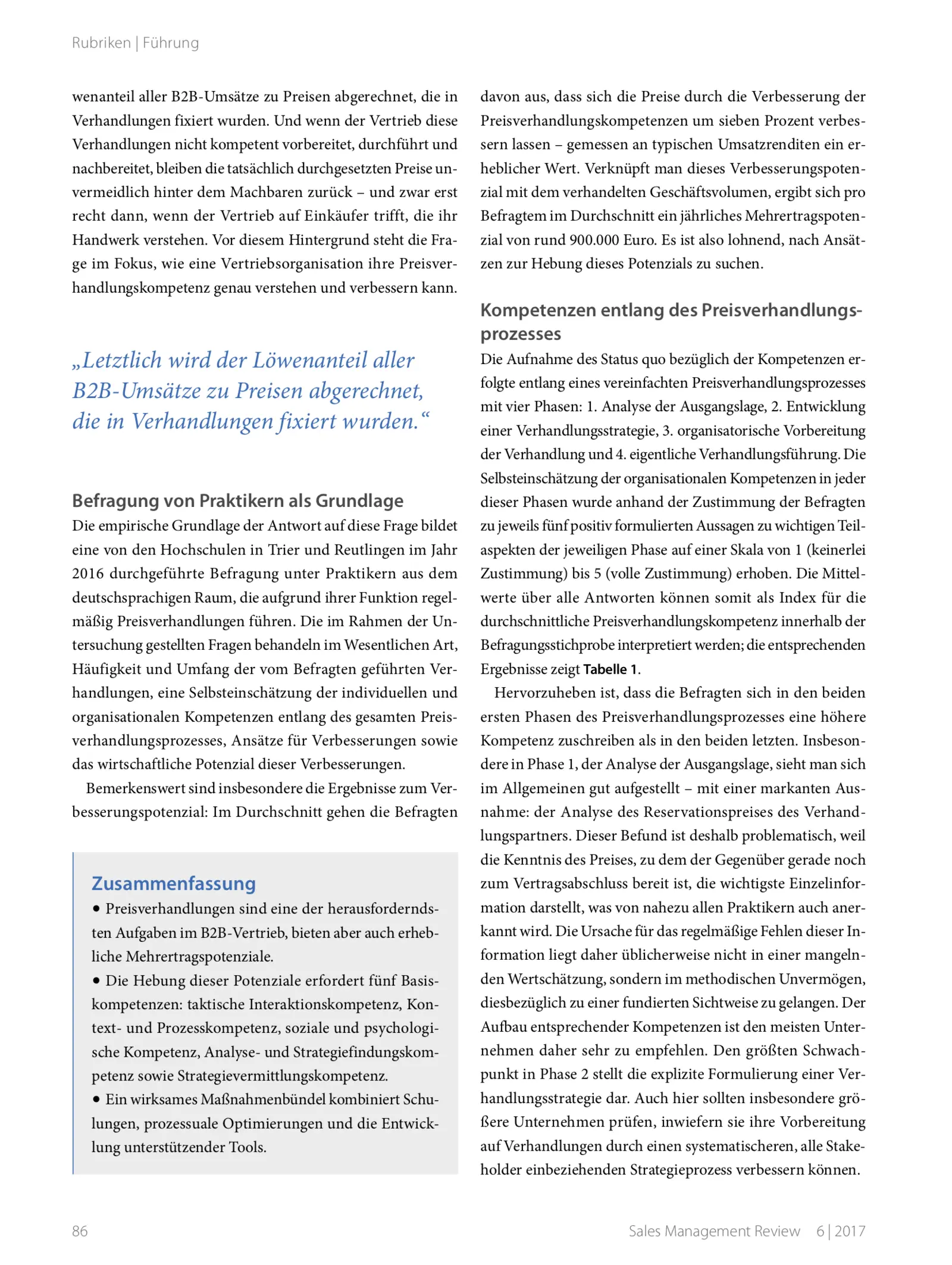 Die Verhandlung von Preisen gehört zu den Königsdisziplinen des B2B-Vertriebs. Die Entwicklung entsprechender Kompetenzen ist daher von zentraler Bedeutung, und zwar auf individueller wie auf organisationaler Ebene. Im Rahmen dieses Forschungsprojekts wurde auf der Grundlage einer Befragung von 234 Praktikern zunächst der Status quo in der Praxis erhoben. Dabei konnten fünf Basiskompetenzen identifiziert werden, anhand derer ein Unternehmen seine eigenen Preisverhandlungskompetenzen systematisch und umfassend analysieren kann. Darauf aufbauend wurden verschiedene konkrete Maßnahmen entwickelt, mittels derer ein Unternehmen erkannte Defizite gezielt abzustellen vermag.