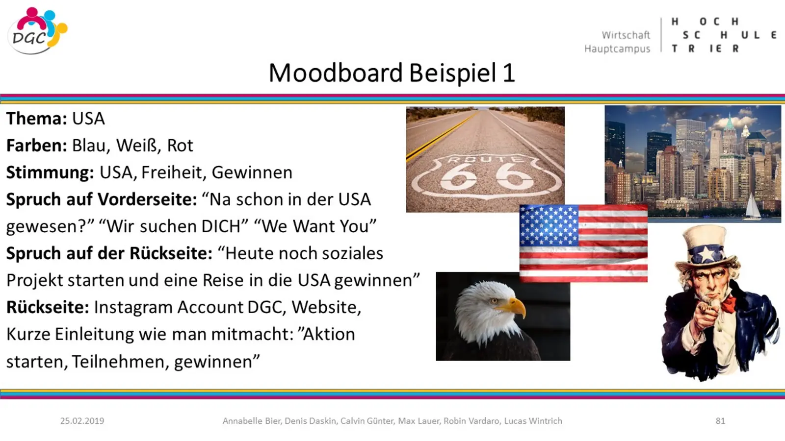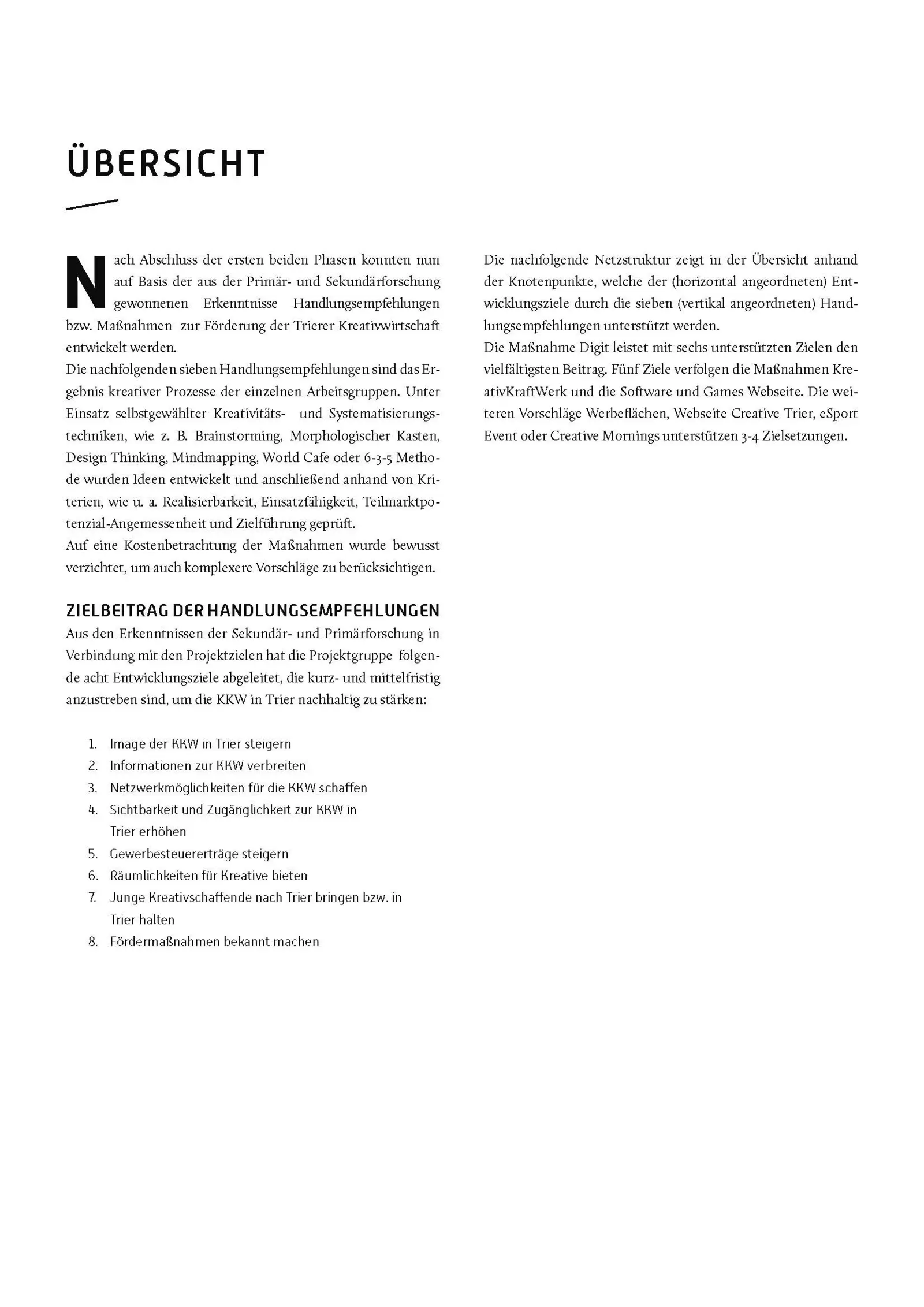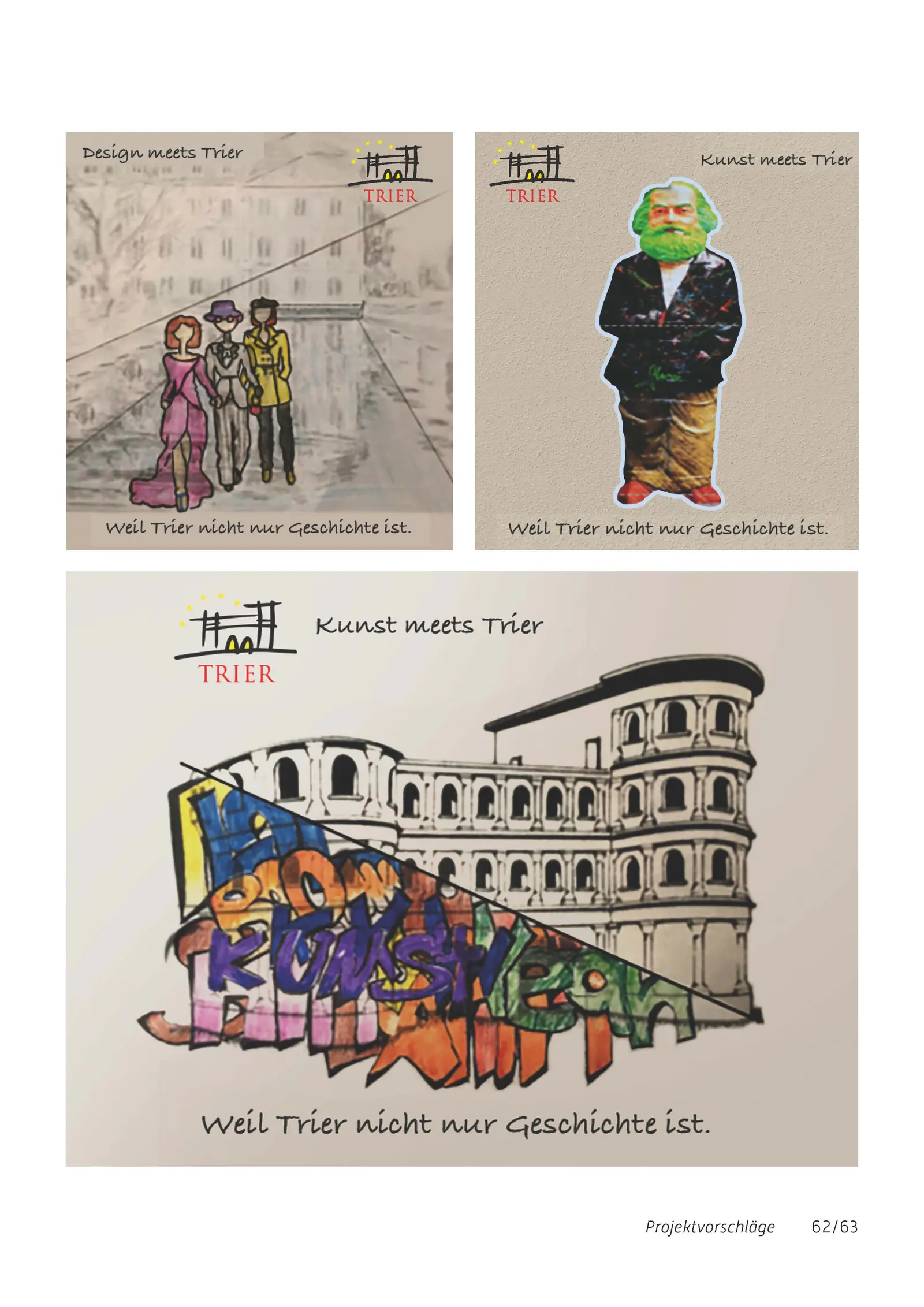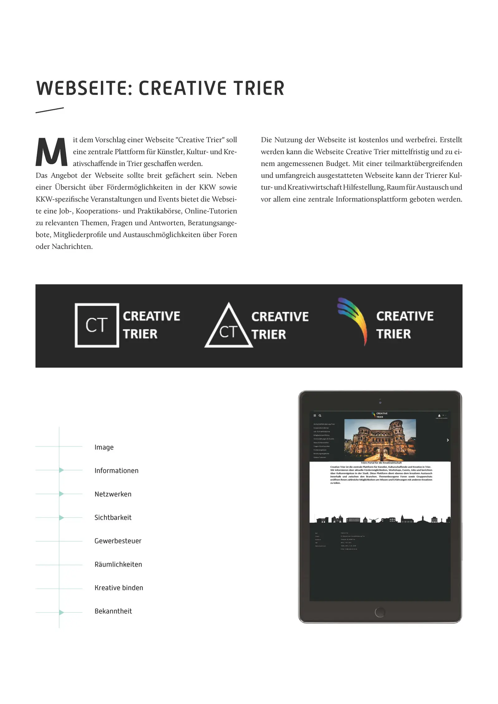 Um das eher alte und traditionelle Image der Stadt zu modernisieren und auf die KKW aufmerksam zu machen, wurden Beispiele für Plakate und Werbeflächen gestaltet. Zum einfachen Austausch zwischen Wirtschaft und Politik und zur Bereitstellung einer einheitliche Kontakt-, Darstellungs- und Verkaufsplattform, wurde ein Konzept für eine Homepage für Kreative in Trier entworfen. Weitere Vorschläge waren u.a. die räumliche Bündelung der kreativen Aktivitäten der Stadt in Form eines „KreativKraftWerk(es)“, die Ansiedlung einer Software- und Games-Messe „DigiT“ sowie die Etablierung einer regelmäßigen Vortragsreihe „Creative Mornings“.