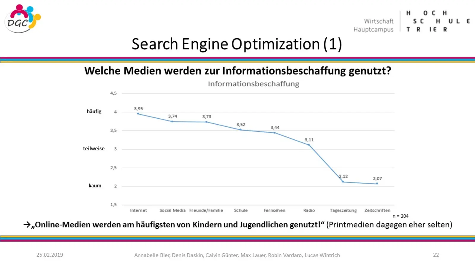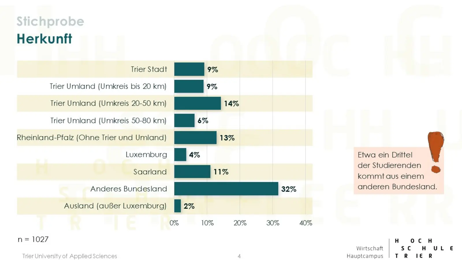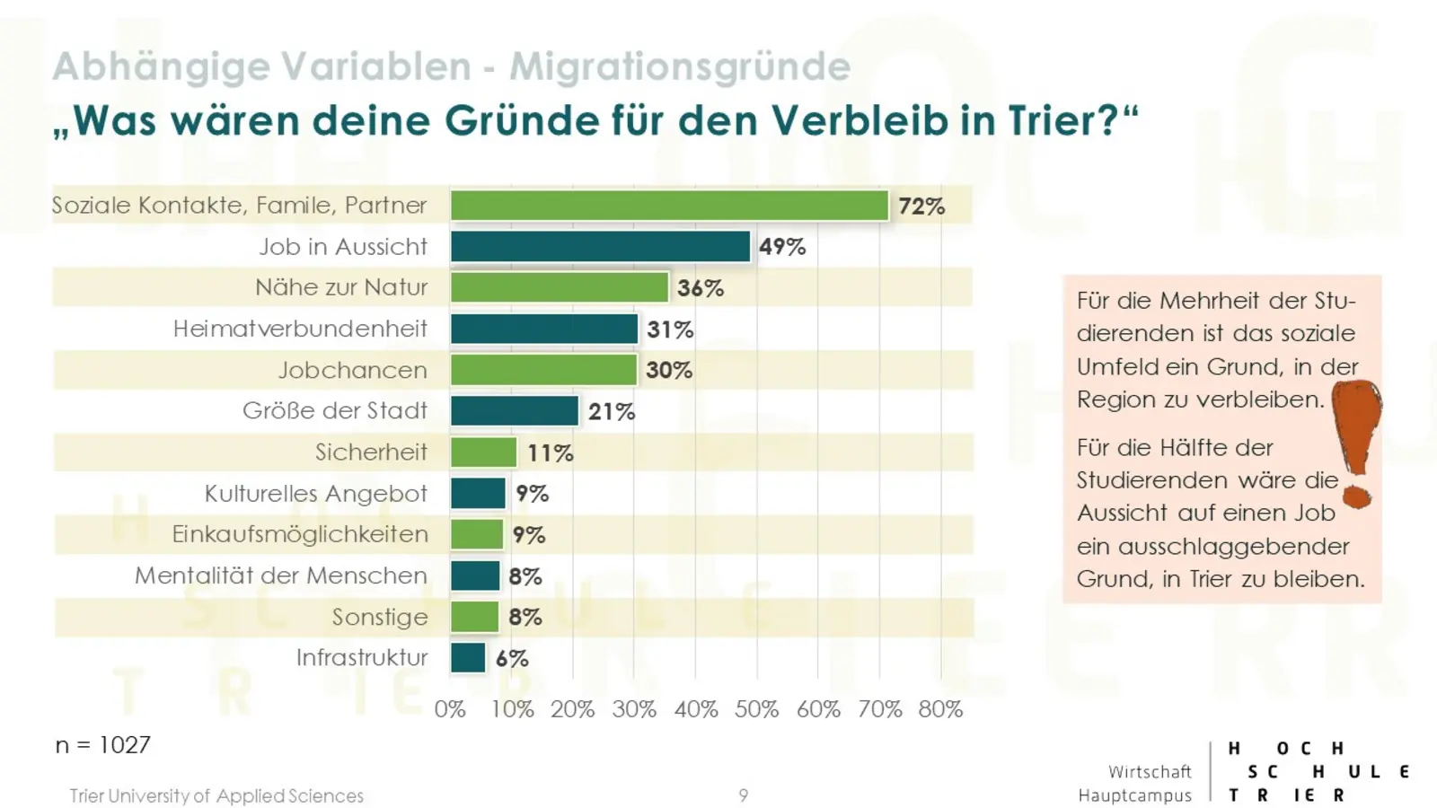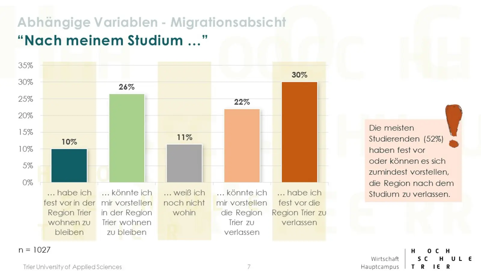 Die Hochschulstadt Trier hat auch für den akademischen Berufseinsteiger viel zu bieten: ein umfassendes Freizeit- und Kulturangebot, Naturnähe, Internationalität, attraktive Arbeitgeber. Gefühlt gelingt es aber unterdurchschnittlich gut die jungen Absolventen in der Region zu halten. Woran liegt dies und wie kann es gelingen die Quote der Verbleiber unter den Trierer Hochschulabsolventen zu erhöhen? Mit dieser Thematik beschäftigten sich im Wintersemester 2019/20 zehn Studierende des Seminars „Angewandtes Marketing“ unter der Leitung von Prof. Dr. Udo Burchard und Herr Dr. Daniel Arnold vom Amt für Stadtentwicklung und Statistik der Stadt Trier. Ziel des Projektes ist es einerseits den grenzüberschreitenden Arbeitsmarkt weiter zu entwickeln und andererseits Trier als Wohn- und Arbeitsort in der Großregion zu stärken.