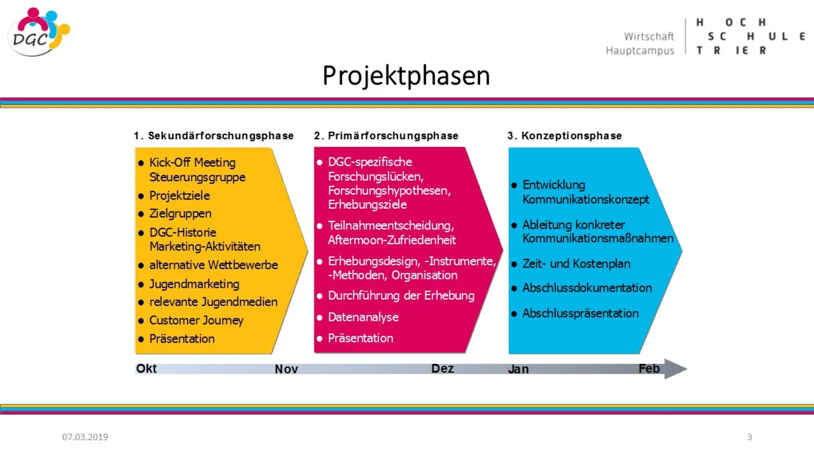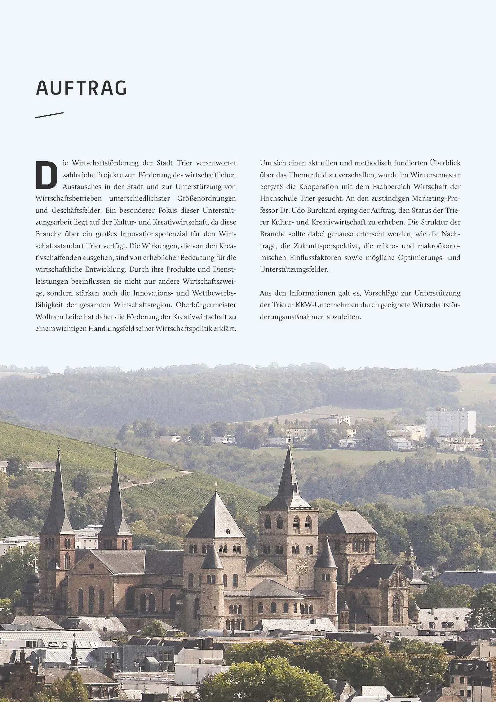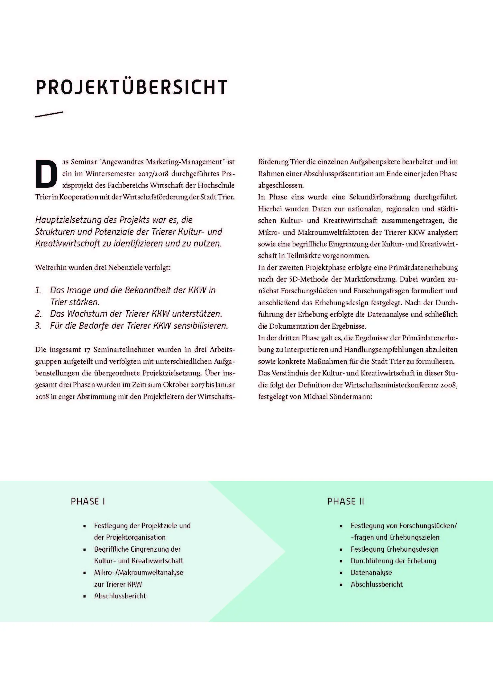 Eine im Rahmen des Seminars „Angewandtes Marketing“ von Prof Dr. Udo Burchard in Kooperation mit der Wirtschaftsförderung der Stadtverwaltung Trier durchgeführte Studie zur Kultur- und Kreativwirtschaft in Trier lieferte zahlreiche bemerkenswerte Erkenntnisse und Empfehlungen für die regionale Kulturwirtschaft. Die Studie wurde in drei Phasen über einen Zeitraum von vier Monaten von und mit den 17 Teilnehmern des Seminars erarbeitet. In der ersten Phase wurden u.a. die Projektziele und -organisation festgelegt sowie eine Sekundärforschung durchgeführt. Die darauffolgende zweite Phase beinhaltete die Feststellung von Forschungsdesiderata und die Durchführung der Primärforschung. Aus den Erkenntnissen der ersten beiden Phasen wurden in der dritten und letzten Phase konkrete Maßnahmen zur Förderung der Trierer Kultur- und Kreativwirtschaft entwickelt.