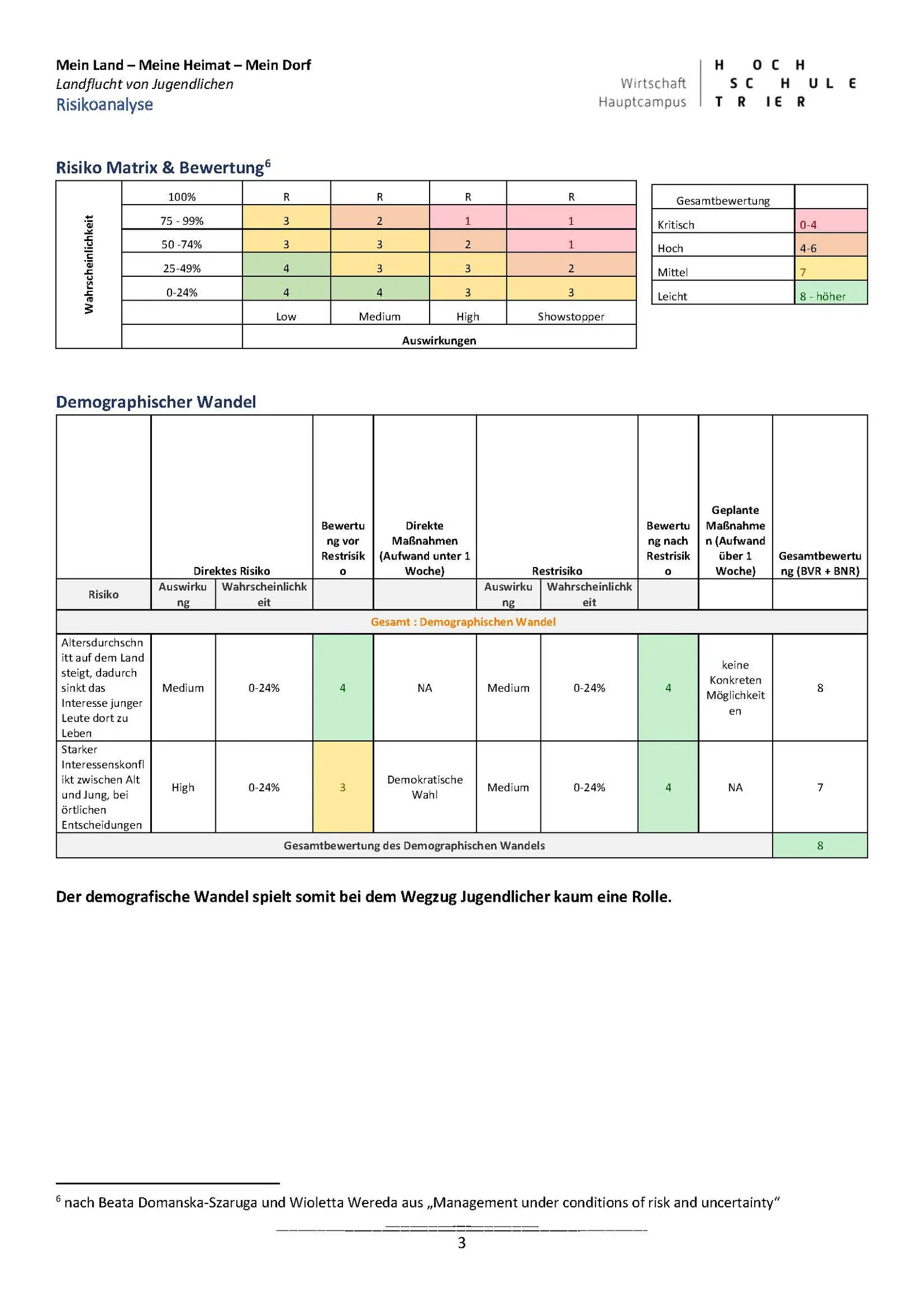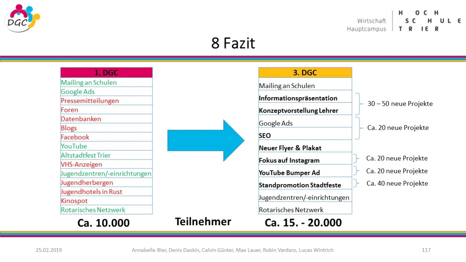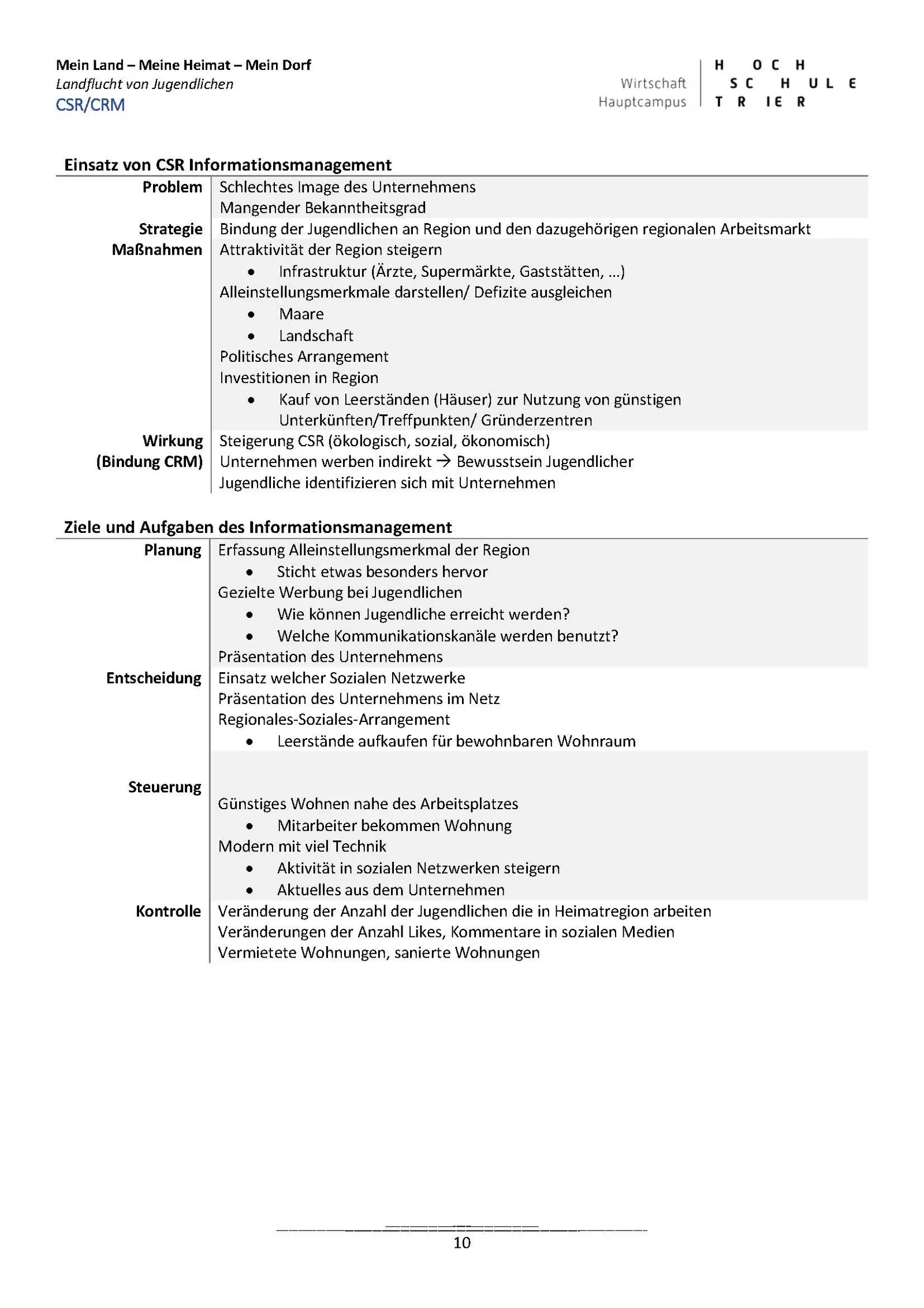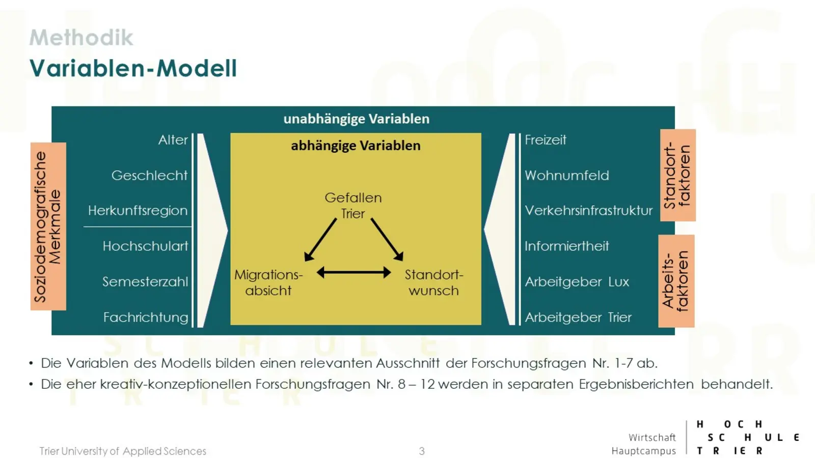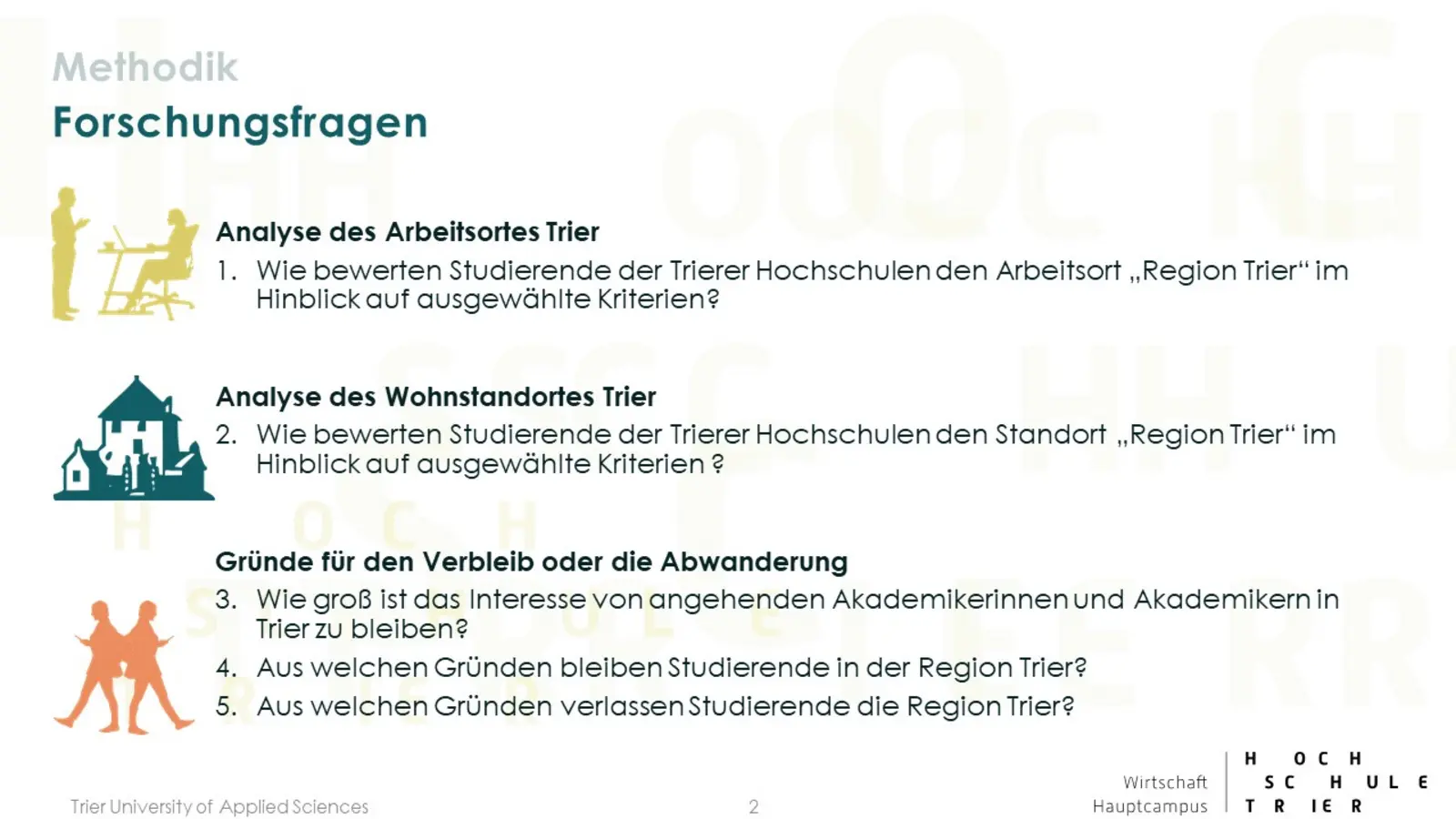 In der ersten Projektphase wurden zunächst die Projektziele festgelegt, eine Markt- und Umweltanalyse durchgeführt sowie wissenschaftliche Erkenntnisse, Theorien und Modelle zu der Thematik näher betrachtet. In der zweiten Phase wurde eine Online-Befragung an der Universität und der Hochschule Trier durchgeführt. Insgesamt wird Trier als Stadt von über 80% der 1.027 Befragten generell positiv oder sehr positiv bewertet. Jedoch plant oder hat die Hälfte der Befragten fest vor die Region nach dem Studium zu verlassen. Lust auf Neues, die Job-Chancen und die sozialen Kontakte sind die Hauptfaktoren für das Verlassen der Region. Beziehungen zu Familie und Partnern aber auch ein in Aussicht stehender Job sowie die Natur sind Argumente für ein Drittel der Befragten eher in der Region zu bleiben. In der abschließenden Konzeptionsphase wurden Vorschläge zur Erhöhung der Verbleibequote erarbeitet. Die Ideen reichten von der Begrünung der Innenstadt (Green Trier), Anwerbungskampagnen für Studienanfänger, Umzugshilfen, Meet & Eat Veranstaltungen, einer „Studier-in-Trier Webseite“, Ausbau der Fahrrad- und Scooterinfrastruktur bis zu Kooperationen mit Wirtschaftspartnern und Verkehrsbetrieben.
