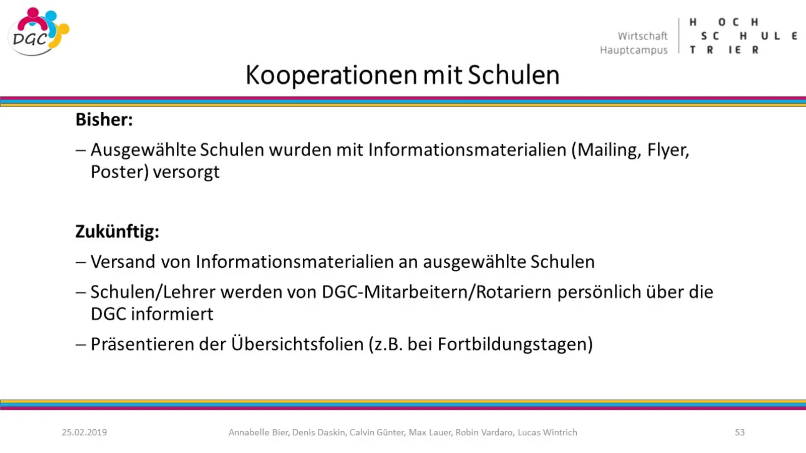 Die Studierenden konnten mit Hilfe des klassischen Beratungsansatzes Sekundärdatenanalyse-Primärdatenerhebung-Konzeption die Stärken und Verbesserungspotenziale der Sozialaktion sowohl aus neutraler als auch aus zielgruppenspezifischer Marketing-Perspektive identifizieren und Optimierungsvorschläge entwickeln. In der abschließenden Konzeptionsphase wurden konkrete Kommunikationsmaßnahmen abgeleitet. Wertvolle Verbesserungsvorschläge in Bezug auf den Online-Auftritt, die Kommunikation mit Schulen und die öffentlichkeitswirksame Präsentation auf geeigneten Veranstaltungen wurden vorgestellt.