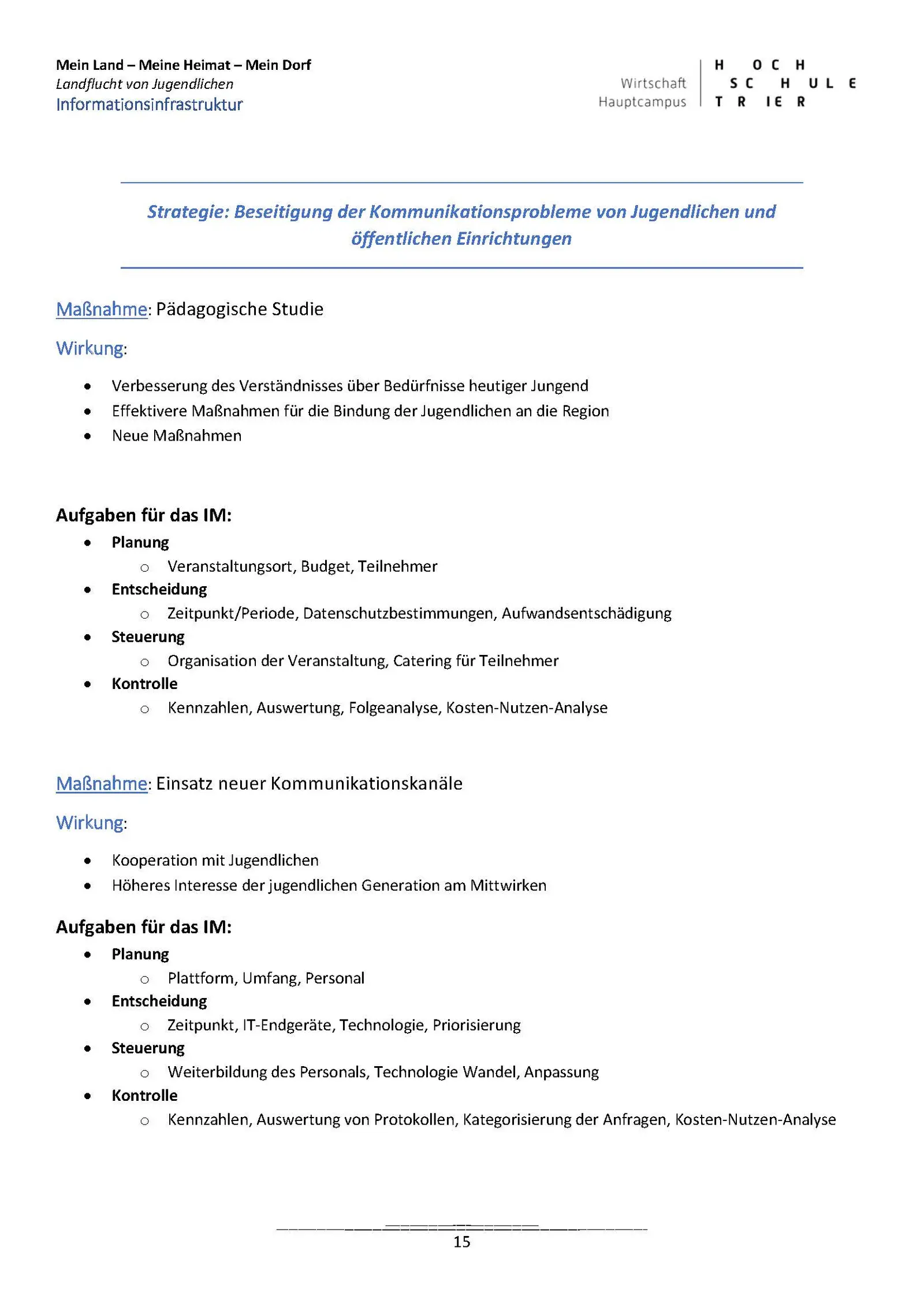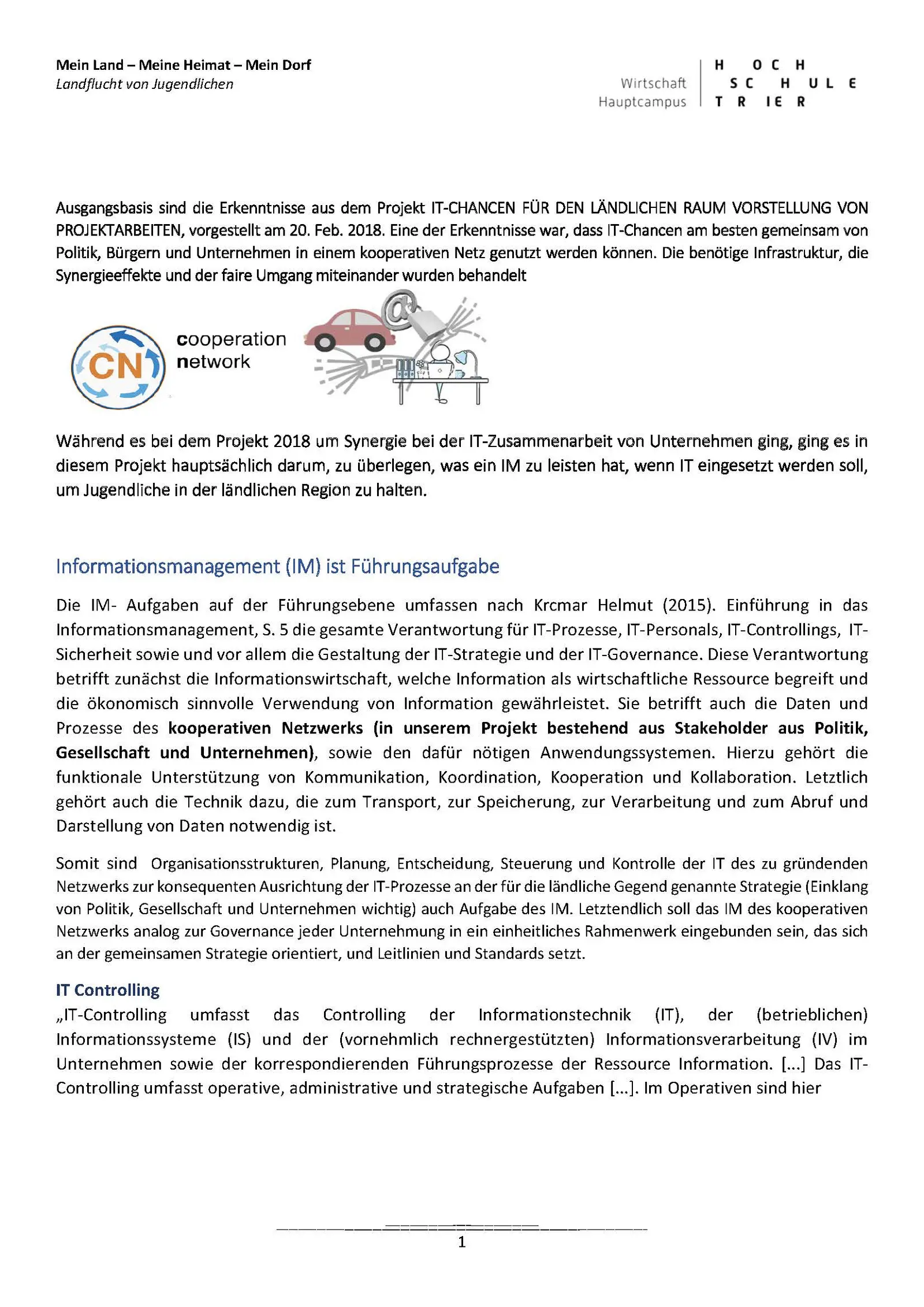 Am 12. Februar 2019 wurde von Studierenden der Masterveranstaltung Informationsmanagement der Hochschule Trier, FB Wirtschaft, unter Leitung von Prof. Dr. Elvira Kuhn, einer interessierten Zuhörerschaft ein Zukunftsfähiges Informationsmanagement (IM) zu „Mein Land – Meine Heimat – Mein Dorf“ vorgestellt. Unter dieser Zielsetzung entwickelten die Studierenden ein Rahmenkonzept zur Zukunftsfähigkeit der einzusetzenden IT, welche zur Unterstützung für die politische Strategie „Verhinderung der Landflucht von Jugendlichen“ notwendig ist. Ein ganzes Strategiebündel zurräumlichen und organisatorischen Struktur eines zukunftsfähigen IM wurde vorgestellt und die Aufgaben für ein IM, dessen Kosten und Nutzen sowie neue Rollen in diesem Zusammenhang aufgezeigt. Intensiv diskutiert wurden die Themen Freizeit, CSR/CRM, Politik, Infrastruktur bezüglich Information, Kommunikation, Kooperation, Koordination und Kollaboration, Datenschutz und Datensicherheit.