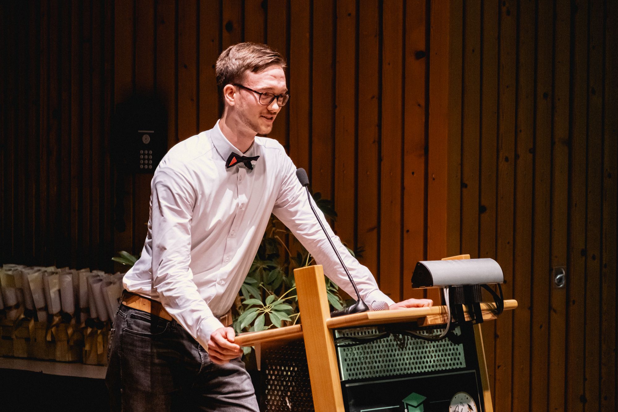 Die Absolventenredner würdigten den besonderen Campuscharakter: Nick Schneider, Masterabsolvent des Maschinenbaus aus dem Fachbereich Umweltplanung/Umwelttechnik, schätzte die familiäre Atmosphäre, die gegenseitige Unterstützung von Kommilitoninnen und Kommilitonen sowie die gute Kooperation unter Studierenden und Lehrenden. Johannes Hagemann, Bachelorabsolvent im Fachbereich Umweltwirtschaft/Umweltrecht, kam eigens aus Niedersachen an den Campus, denn ihn überzeugte das Green-Campus-Konzept und der innovative Studiengang „Nonprofit und NGO-Management“. Er hob das Engagement vieler Studierender und den hohen Anteil internationaler Studierender als Chance hervor, über Sprachen und Grenzen hinweg, zu lernen und zusammenzuarbeiten.