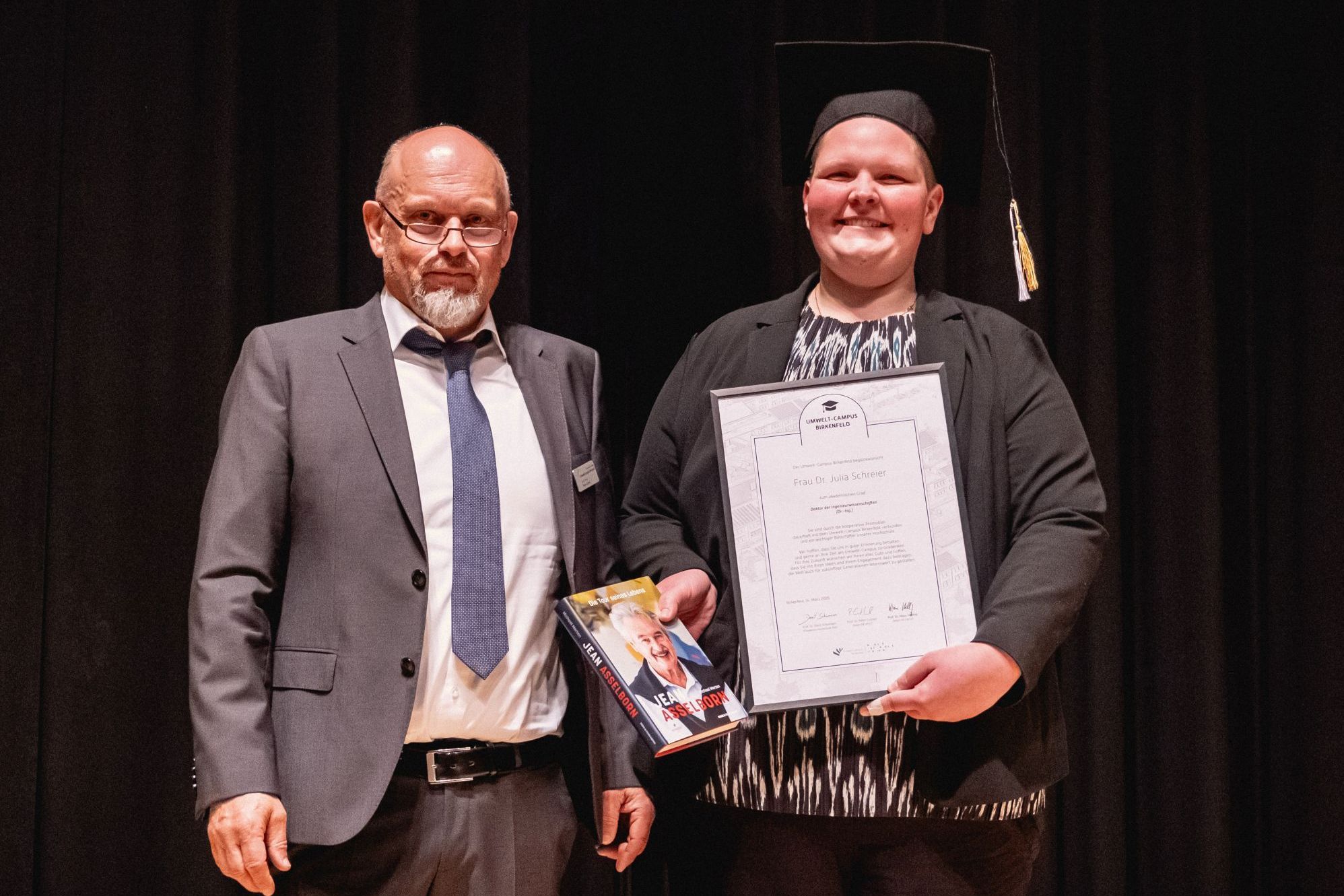 Unterstützt von den jeweiligen Studiengangbeauftragten überreichten die Dekane, Prof. Dr. Klaus Helling und Prof. Dr.-Ing. Peter Gutheil die Urkunden an alle anwesenden Absolventinnen und Absolventen. Darüber hinaus konnten auch zwei Promotionen gefeiert werden: Dr.-Ing. Julia Schreier promovierte im Bereich Verfahrenstechnik in Kooperation mit der Bergakademie Freiberg und dem Campusprofessor Ulrich Bröckel als Zweitgutachter. Dr. rer. pol. Stefan Stumm promovierte im Fachbereich Raum- und Umweltplanung in Kooperation mit der RPTU Kaiserslautern. Die anerkennende Würdigung hielt sein Zweitgutachter Prof. Dr. Dirk Löhr vom Umwelt-Campus.