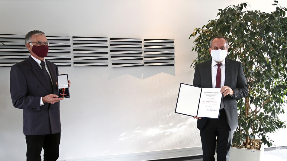 Über 16 Jahre setzte sich der emeritierte Professor im Hochschullehrerbund sowohl auf Landes- als auch Bundesebene für die Belange der Hochschullehrenden ein. Wissenschaftsminister Prof. Dr. Konrad Wolf überreichte Prof. Dr. Klaus Zellner deshalb das Verdienstkreuz am Bande des Verdienstordens der Bundesrepublik Deutschland.