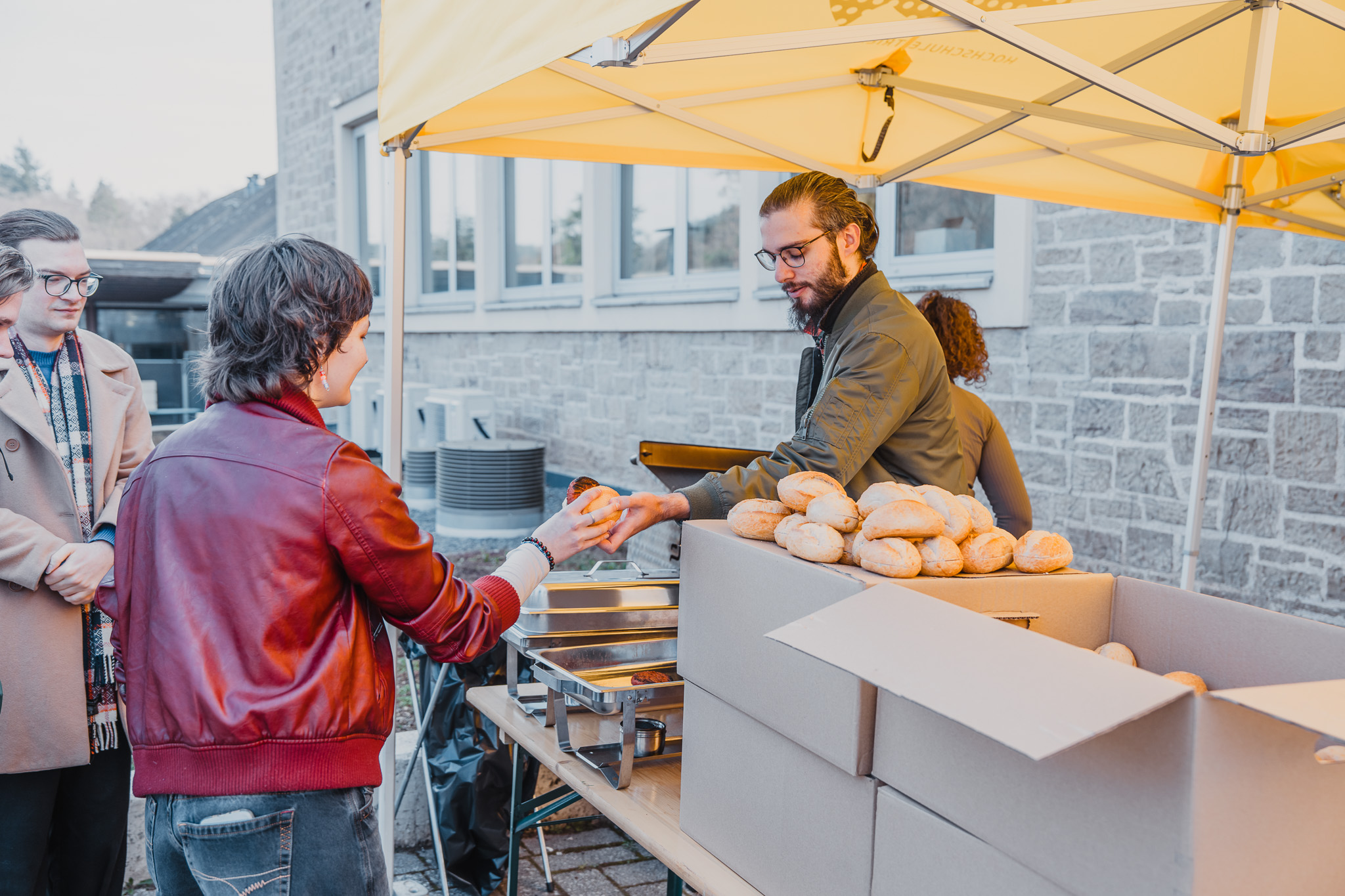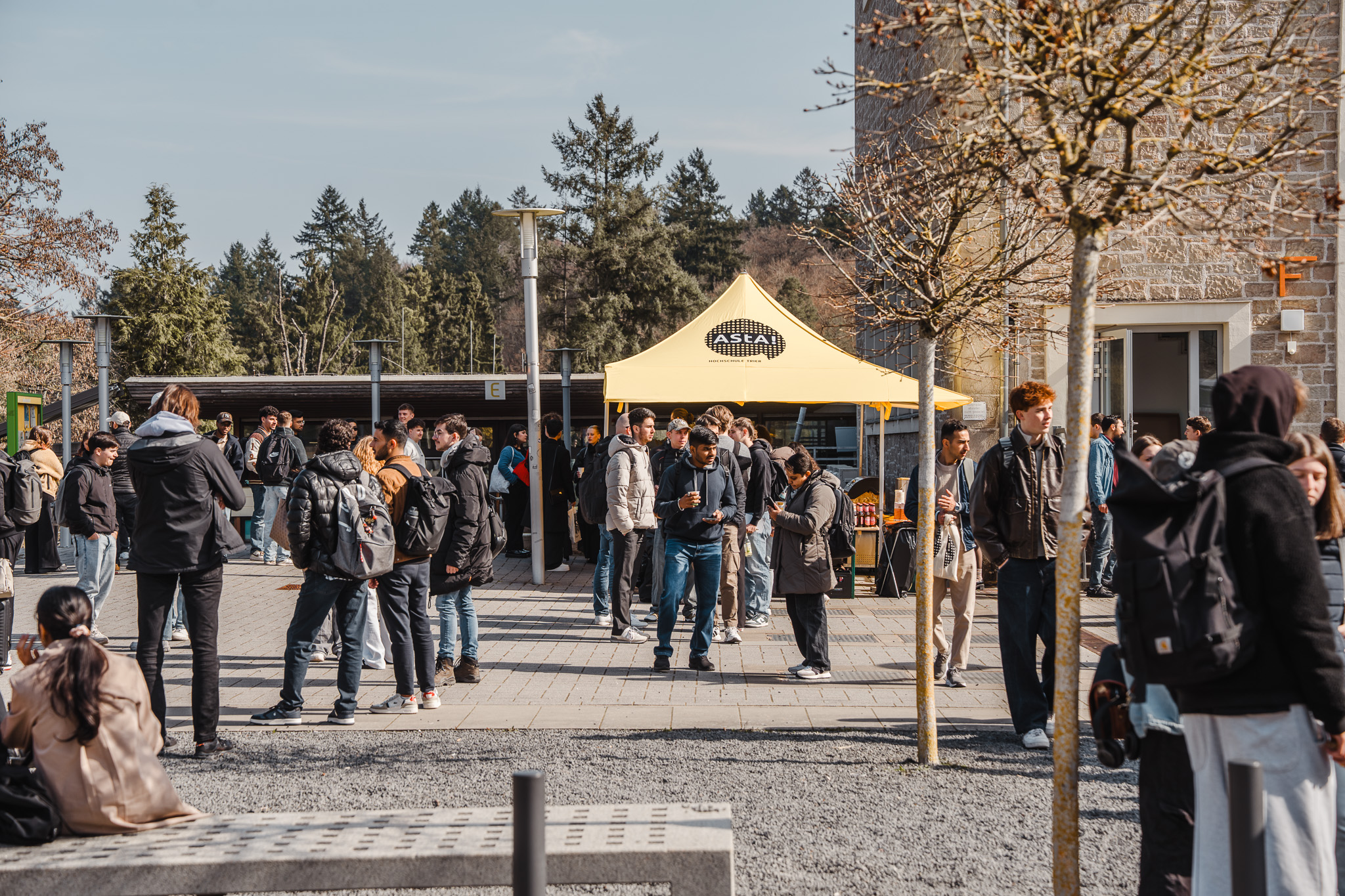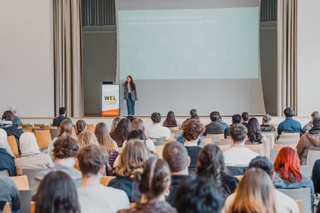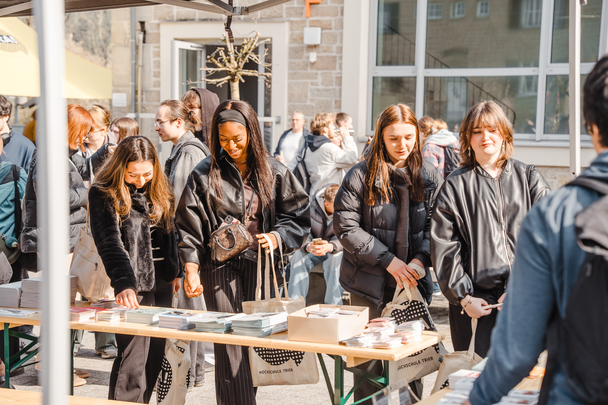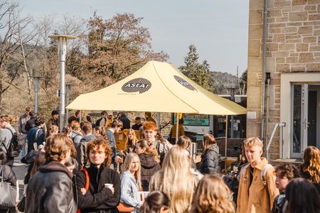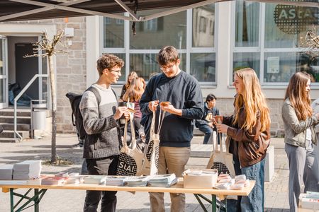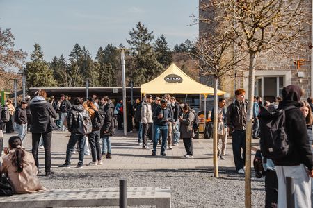 Der anschließende "Markt der Möglichkeiten" bot die Gelegenheit, die vielfältigen Serviceeinrichtungen unserer Hochschule kennenzulernen. An den Ständen in den Foyers und dem belebten Vorplatz des Haupteingangs konntet ihr euch über BAföG (Ausbildungsförderung), Auslandsaufenthalte, Stipendien und vieles mehr, z. B. die Stefan-Morsch-Stiftung mit Typisierungsaktion gegen Blutkrebs, informieren.