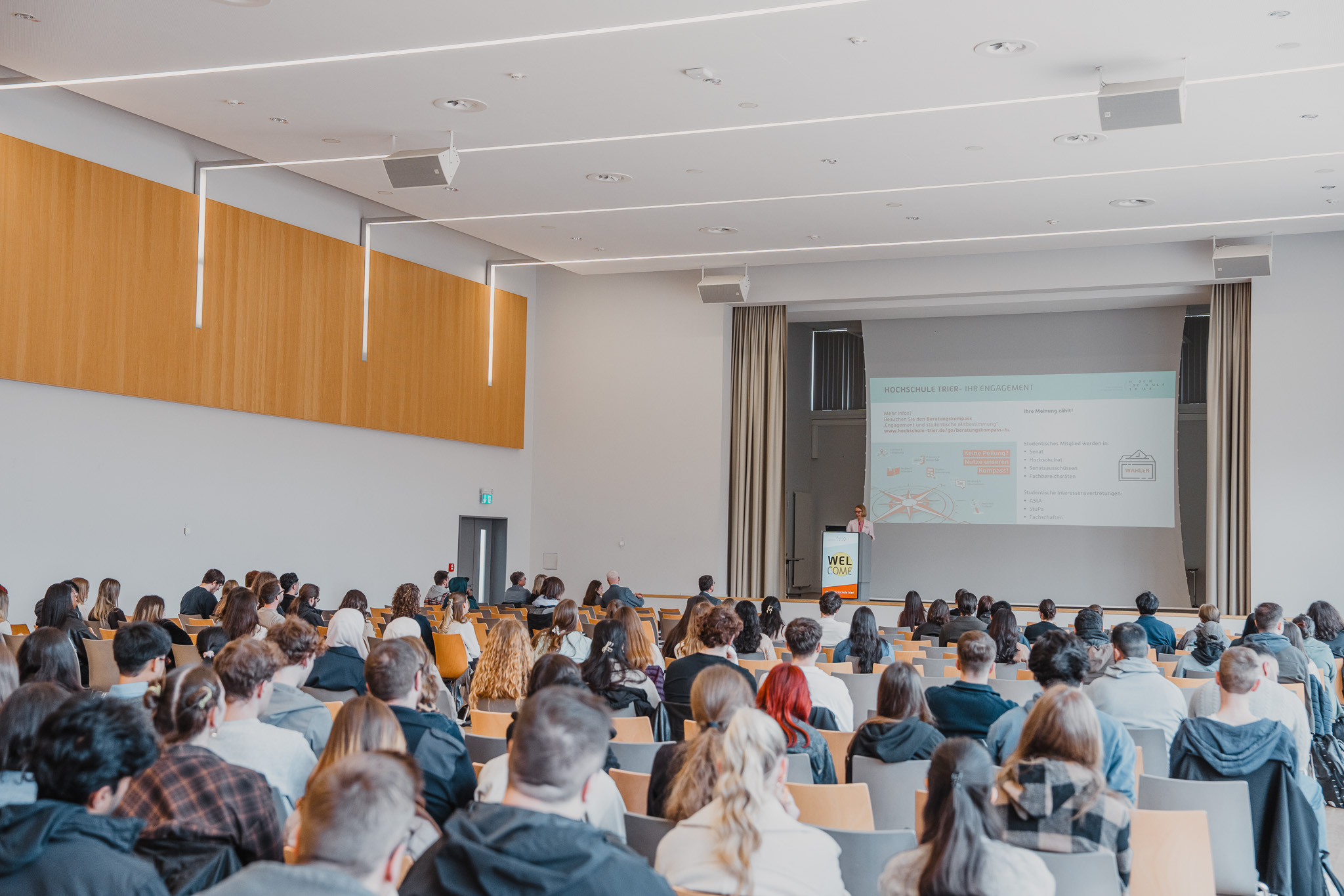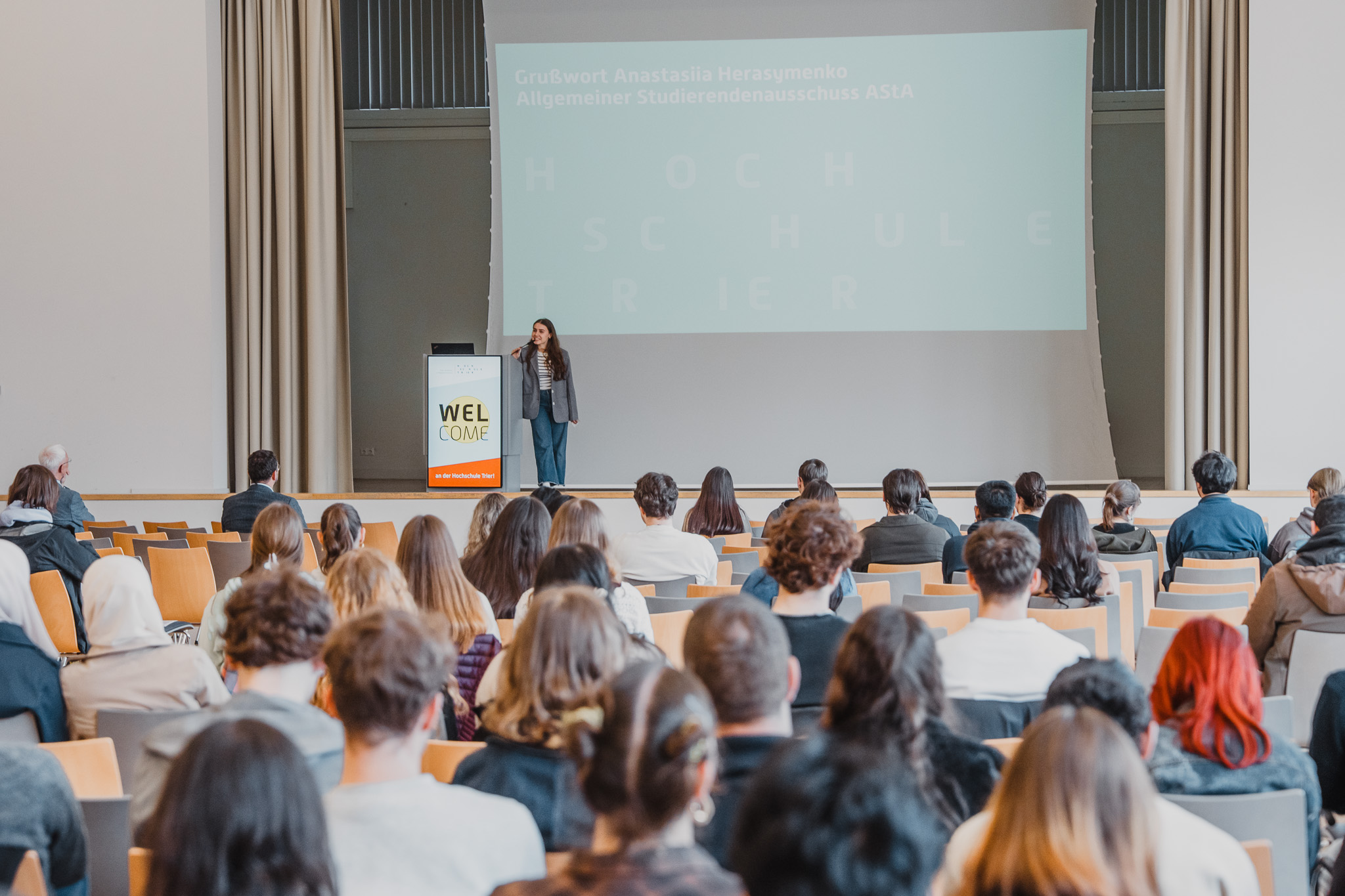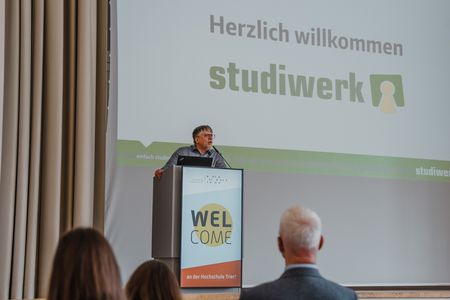 Anschließend hieß der Oberbürgermeister der Stadt Trier, Herr Wolfram Leibe, die vielen neuen Gesichter in unserer schönen Stadt willkommen. Auch der Geschäftsführer des Studiwerks Trier, Herr Andreas Wagner, sowie als Vertreterin des Allgemeinen Studierendenausschusses, Frau Anastasiia Herasymenko, richteten motivierende Worte an die neuen Studierenden.