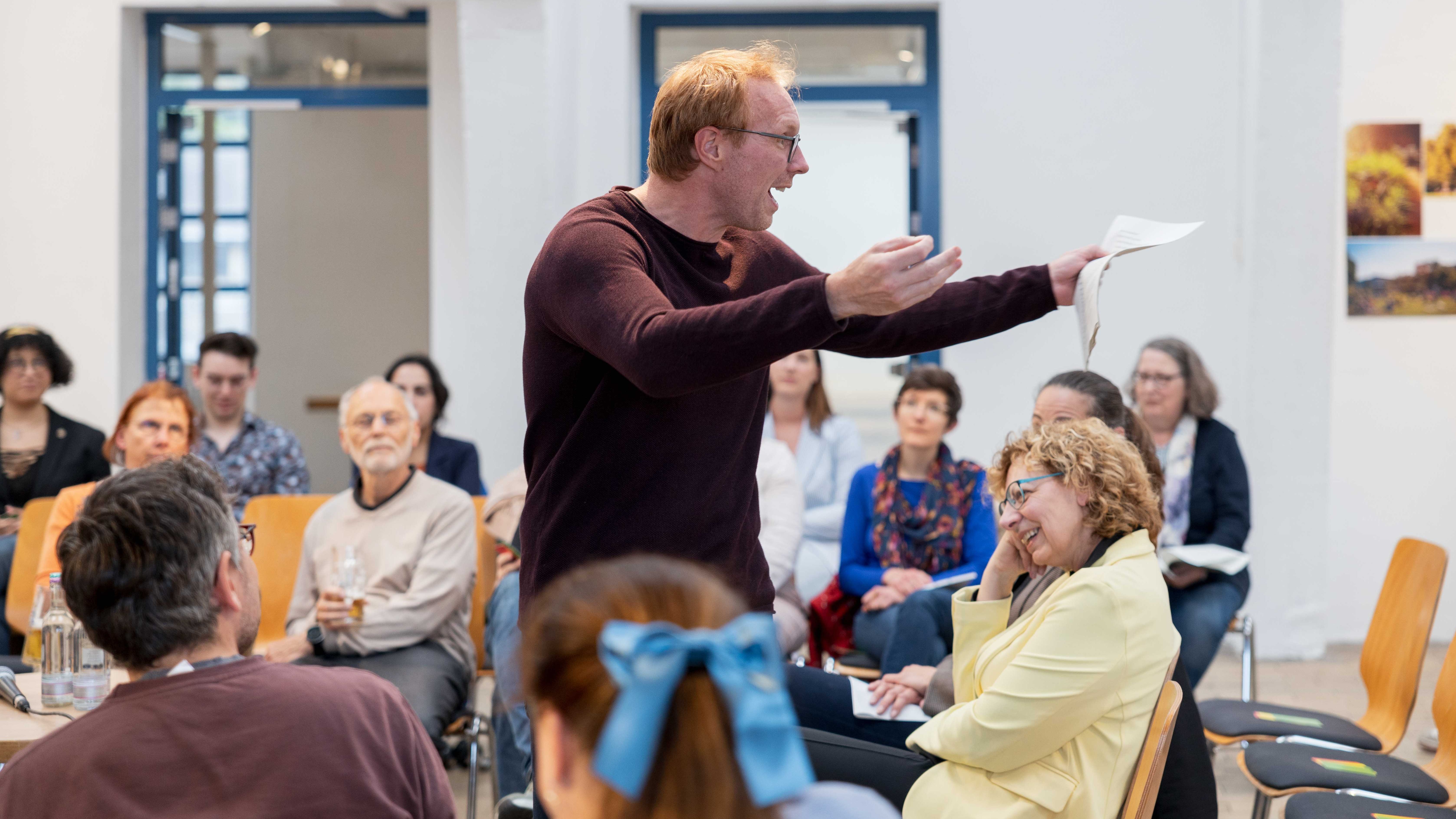 Passend zum künstlerischen Profil der Veranstaltungs-Location läutete eine kritische schauspielerische Darbietung von Alexander Ourth den Abend ein. In überspitzter Manier wurden Erwartungshaltungen von Unternehmen an Arbeitnehmende, aber auch gesellschaftliche und soziale Risiken der modernen Arbeitswelt pointiert herausgestellt.