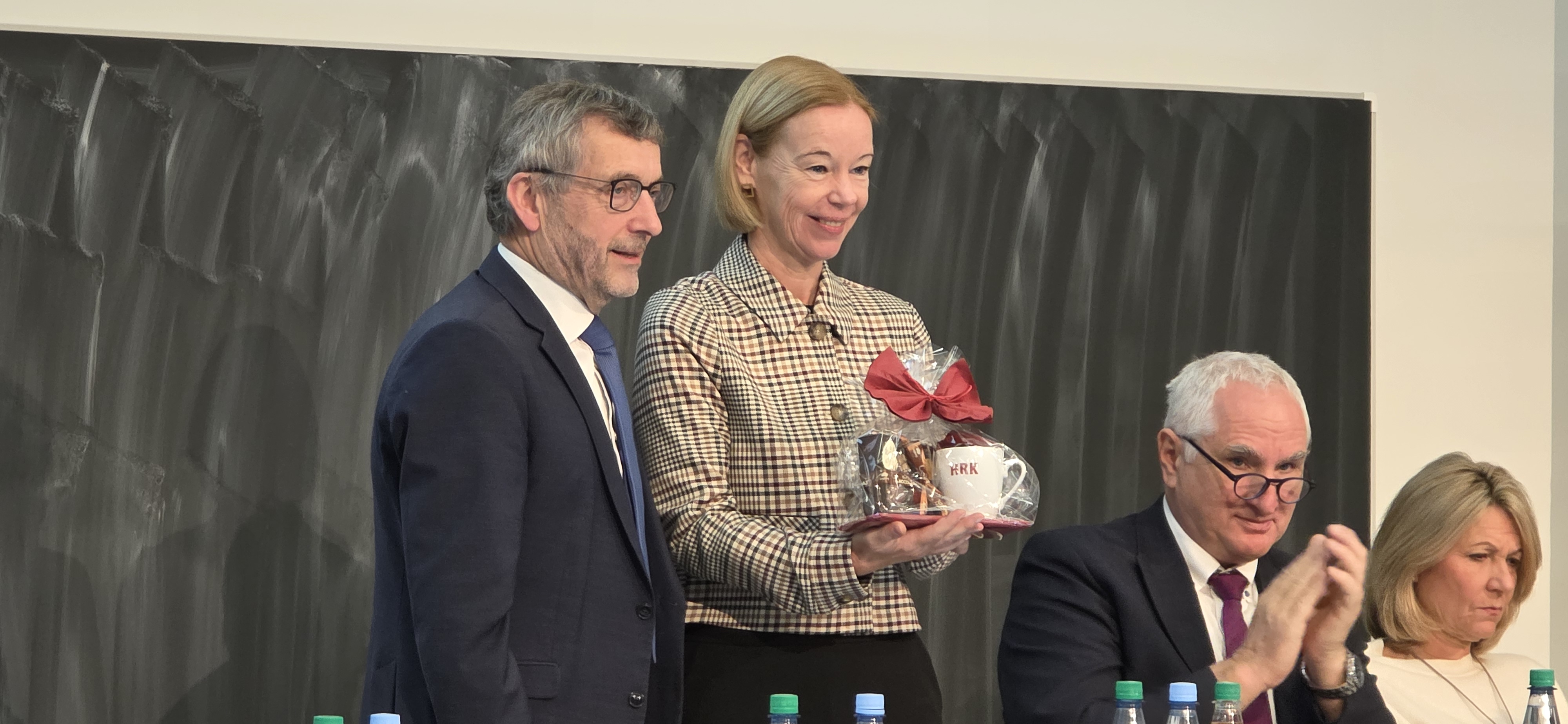 „Mein Dank gilt allen, die in Gremien der HRK in meinem Zuständigkeitsbereich mitgewirkt oder aus der Geschäftsstelle der HRK heraus begleitet haben. Vor allem danke ich HRK PräsidentProf. Dr. Walter Rosenthal und dem gesamten Präsidium der HRK für das Vertrauen“, so Schumann. Prof. Dr. Ingeborg Schramm-Wölk beglückwünscht sie zur Nachfolge im Ehrenamt und wünscht für die Umsetzung der Themen alles erdenklich Gute.