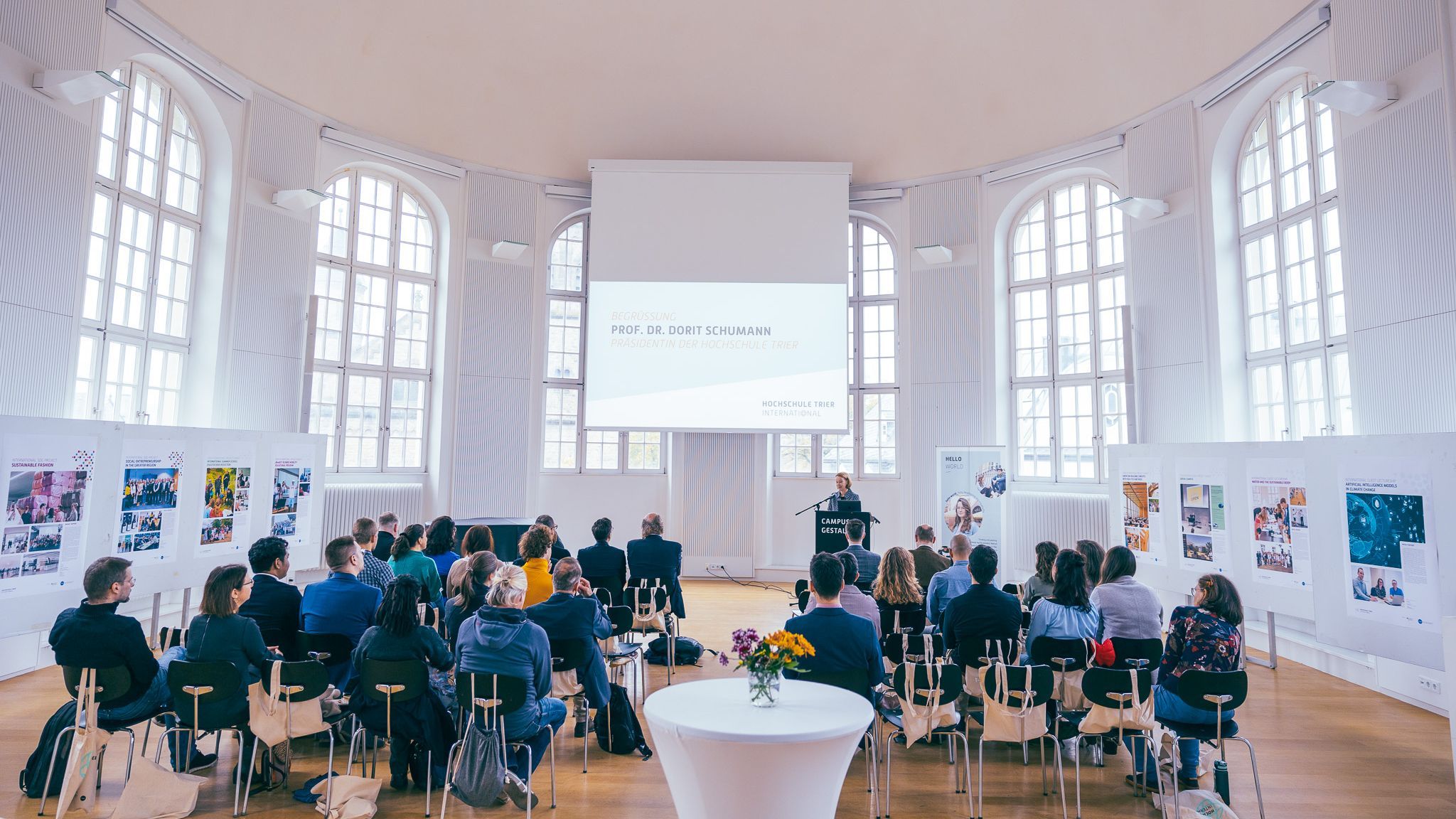 Das darauffolgende abwechslungsreiche Programm stand ganz im Zeichen der Internationalisierung. Um den Studien- und Promotionserfolg der Studierenden und Nachwuchsforschenden an der Hochschule Trier zu stärken, wurden im Rahmen des Projekts „Hochschule Trier International: Übergänge erfolgreich gestalten“ vielfältige Betreuungs- und Qualifizierungsmaßnahmen in den Bereichen Sprachenförderung, Internationales Service Learning sowie beruflicher und wissenschaftlicher Karriere erfolgreich aufgebaut. In über 114 Veranstaltungsangeboten in Präsenz-, Online- und Hybridformaten konnten so mehr als 840 Hochschulmitglieder im Bereich Internationales weitergebildet werden. Die Nachhaltigkeit zeigt sich in der erfolgreichen Einwerbung des Folgeprojekts „Hochschule Trier: International Graduate Research Opportunities“ (GIRO), das zwischen 2024 und 2025 noch einmal ganz gezielt die Internationalisierung der Promotionsstrukturen in den Blick nehmen und auf die bisherigen Projekterfolge aufbauen wird.