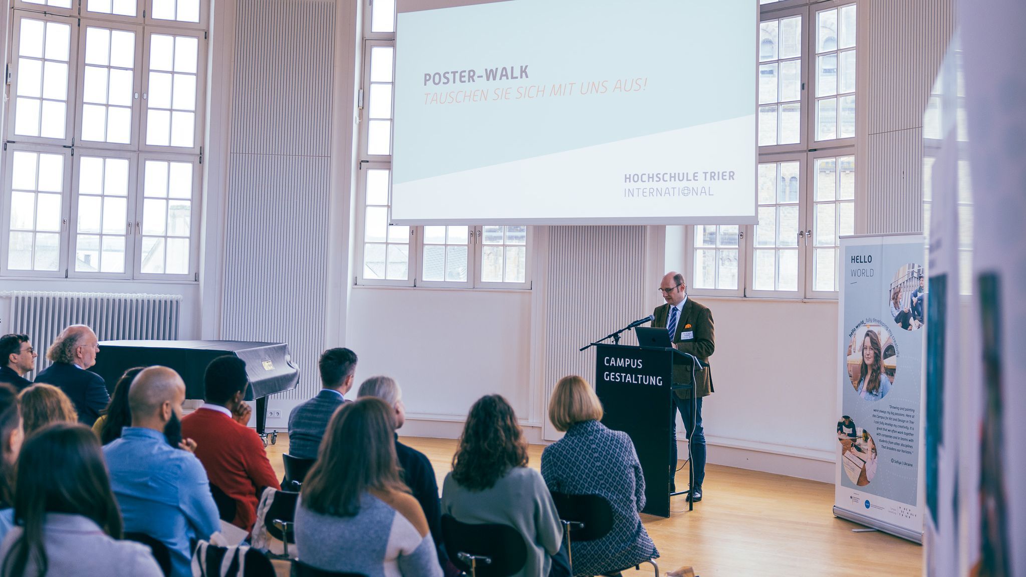 Bei einem abschließenden Poster-Walk hatten die Gäste noch einmal die Gelegenheit, sich die bisherigen Projektergebnisse anzuschauen und in einen intensiven Austausch zur Internationalisierung zu treten. Vizepräsident Professor Henrik te Heesen zieht eine positive Bilanz und blickt positiv in die Zukunft: „Mithilfe der HAW.International Projekte konnten wir die Internationalisierung an der Hochschule Tier in den letzten vier Jahren seit der ersten Projektförderung im Jahr 2020 maßgeblich voranbringen. Das neue Projekt „Hochschule Trier: International Graduate Research Opportunities“ (GIRO) kommt genau zum richtigen Zeitpunkt und wird uns in den nächsten beiden Jahren dabei unterstützen, das angekündigte Promotionsrecht für Hochschulen für angewandte Wissenschaften in Rheinland-Pfalz, wie die Hochschule Trier es ist, weiter voranzubringen und auf ein internationales Niveau zu heben.“