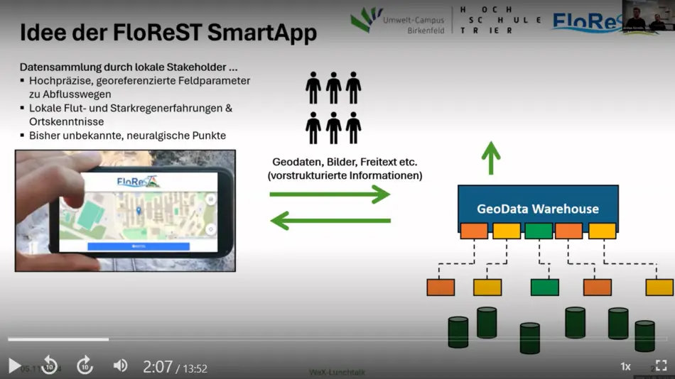 Der Lunchtalk, der im November 2024 stattfand, gibt einen umfassenden Einblick in die Funktionsweise der App sowie die Rolle des Geodatawarehouses. Die Aufzeichnung des Vortrags ist nun auf YouTube verfügbar. Interessierte können sich die Vorstellung der Starkregen-App und des Geodatawarehouses unter folgendem Link ansehen: FloReST Lunchtalk - Starkregen-App und Geodatawarehouse.