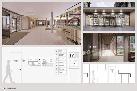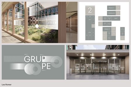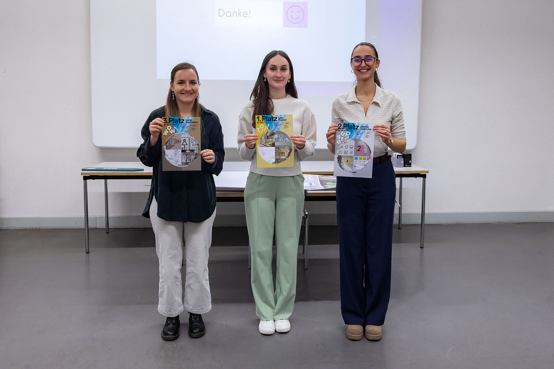 Die finalen Entwürfe präsentierten die Studierenden einer Jury, die sich aus Vertretenden des Campus Gestaltung, der Projektentwicklungsgesellschaft Quartier Ostallee sowie dem Kommunikationsdesigner und Trierer Alumni Michael Kress (Büro Uebele, Stuttgart) zusammensetzte. Drei herausragende Arbeiten wurden mit einem Preisgeld von insgesamt 3.000 Euro ausgezeichnet. Gewonnen haben: Lea Romer (1.Platz), Jasmin Janetzke (2.Platz) und Luna Isenmann (3.Platz).