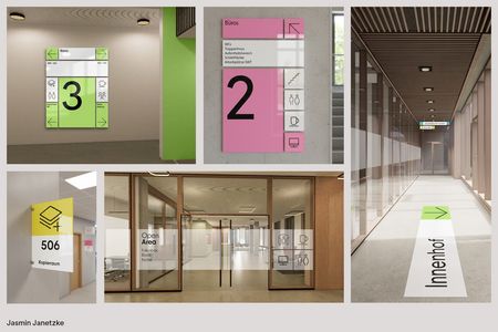 Im Mittelpunkt des Projekts stand das neue Headquarter, in das die Verwaltungen der Volksbank und der SWT im Frühjahr 2027 einziehen werden. Ziel war es, ein Leitsystem zu entwickeln, das Mitarbeitenden und Gästen eine schnelle Orientierung ermöglicht – etwa durch Piktogramme, Farben und Beschriftungen – und sich gleichzeitig harmonisch in das architektonische Gesamtkonzept einfügt. Über mehrere Monate hinweg fanden Präsentationen und Besprechungen an der Hochschule Trier statt, ergänzt durch Vor-Ort-Besichtigungen der Baustelle und der Musterräume des Innenstadtquartiers.