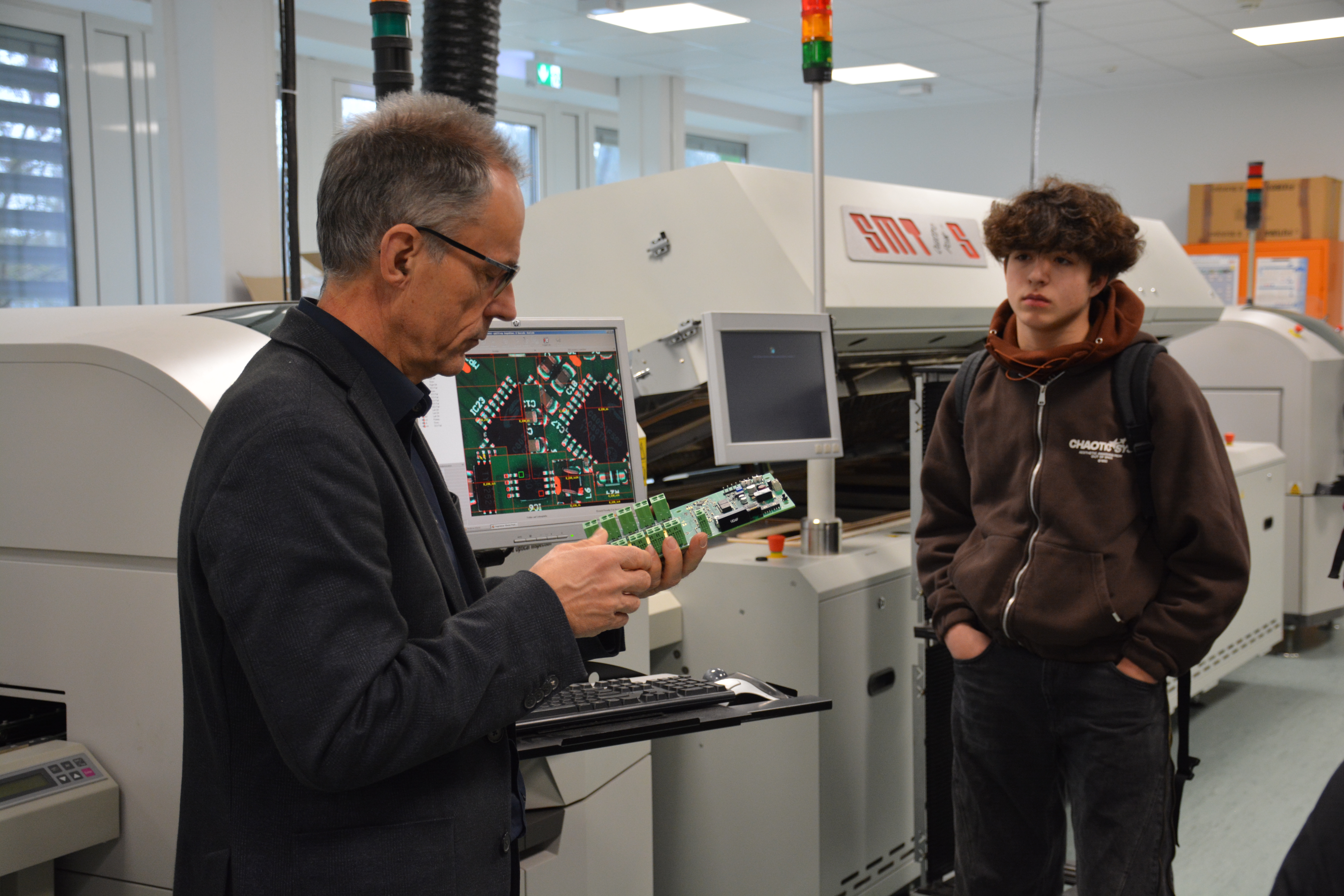 Ein besonderer Schwerpunkt des weiteren Programms lag auf dem Fahrsimulator, der realitätsnahe Verkehrssituationen abbildet und Einblicke in die Analyse von Fahrverhalten, Reaktionszeiten und sicherheitsrelevanten Einflussfaktoren ermöglicht. Die praktische Erfahrung am Simulator stieß auf großes Interesse und machte technische Zusammenhänge unmittelbar erlebbar. Daran anschließend wurde das Elektroniklabor vorgestellt, das mit einer angegliederten SMD-Bestückungslinie ideale Voraussetzungen für die Entwicklung eigener Elektronik bietet. Hier können moderne SMD-Schaltungen als Einzelprototypen oder effizient in Kleinserie gefertigt werden.
